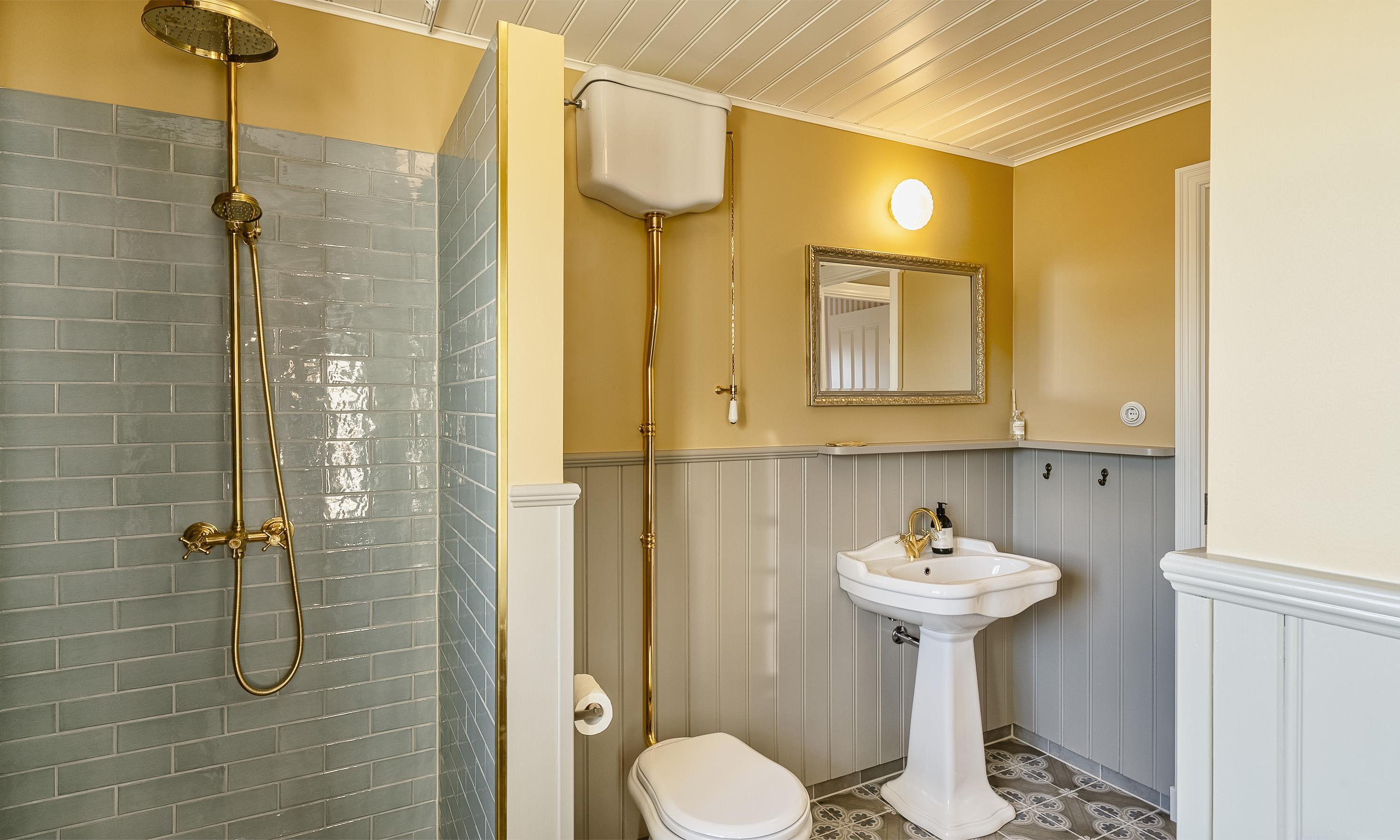 Bad med toilet, bruser og vask