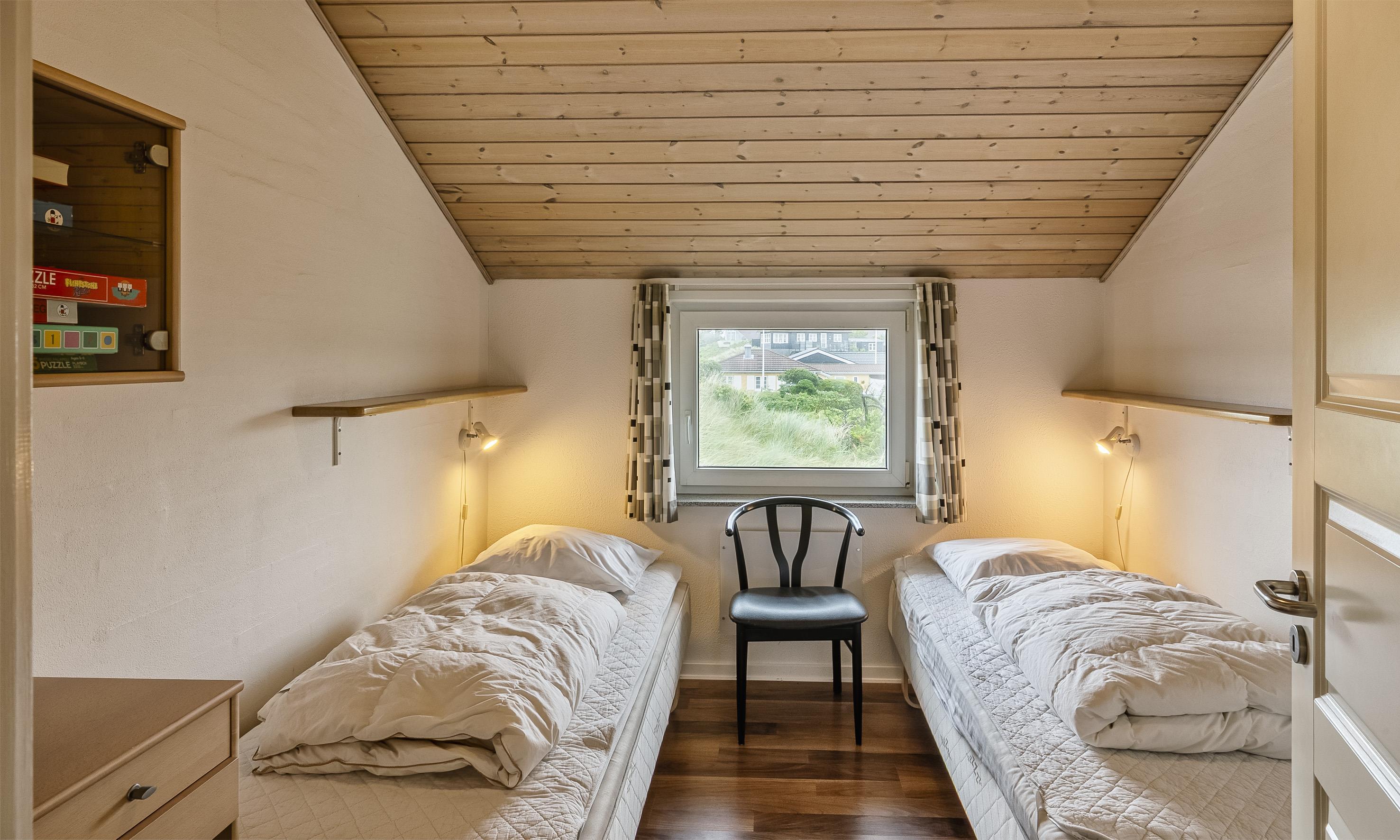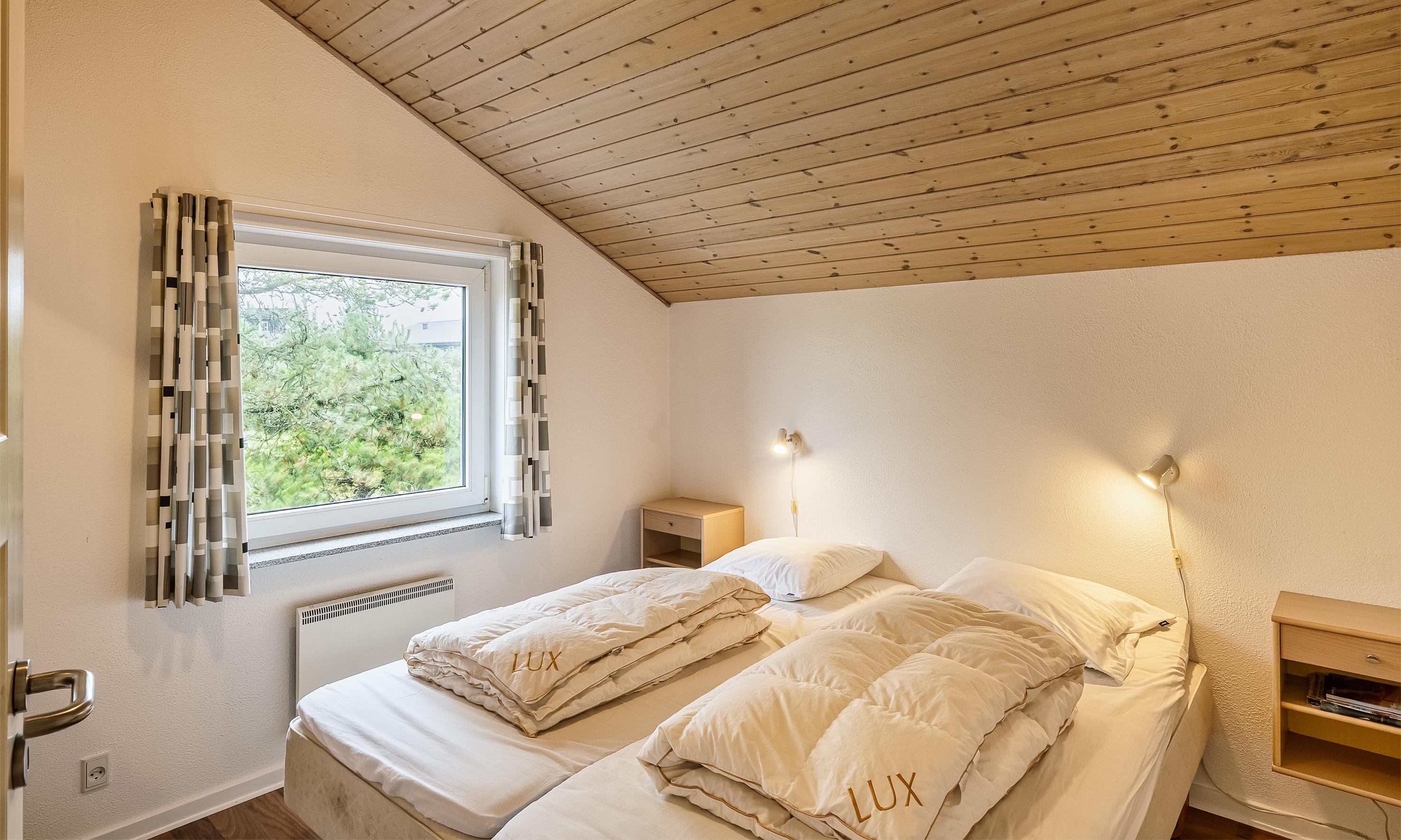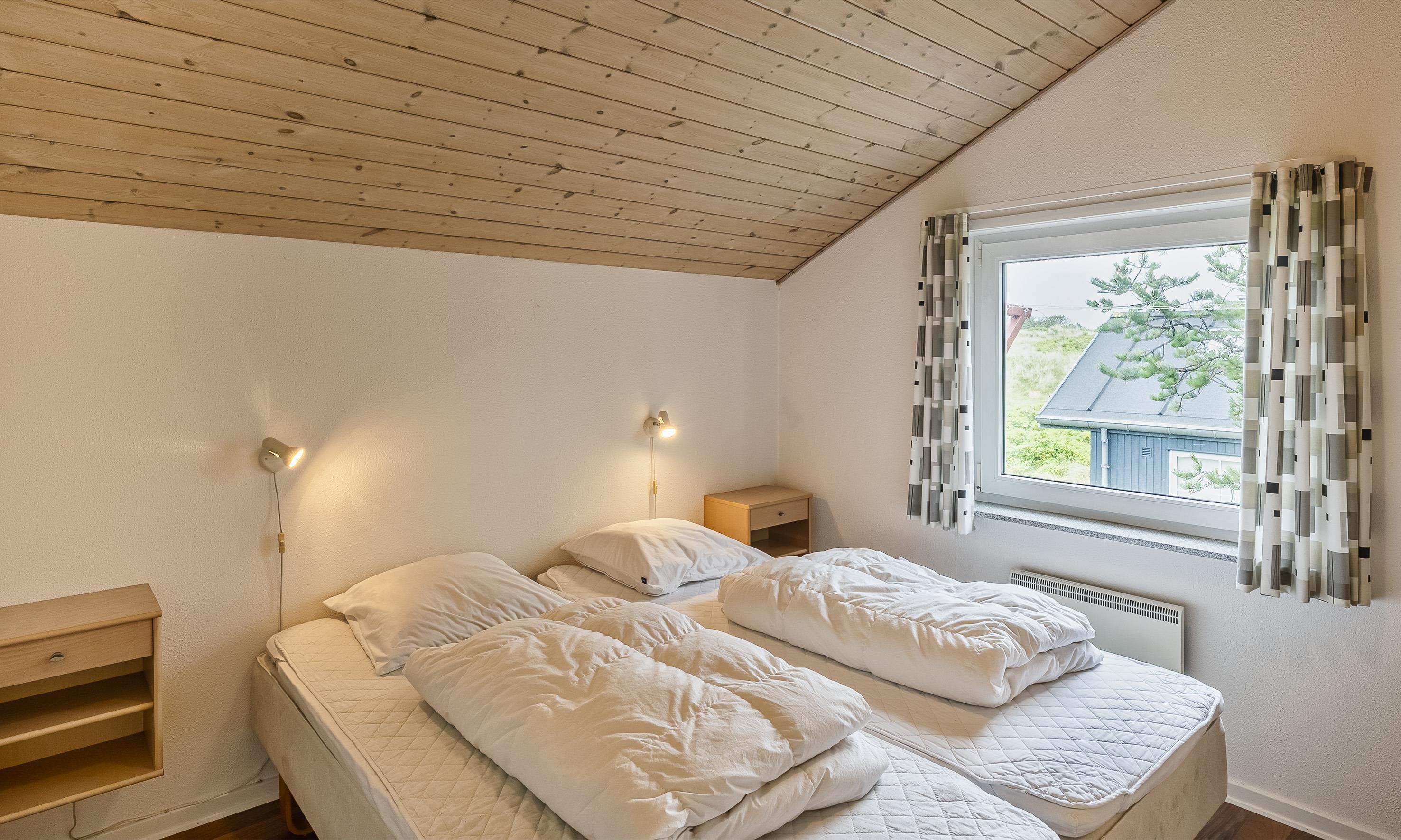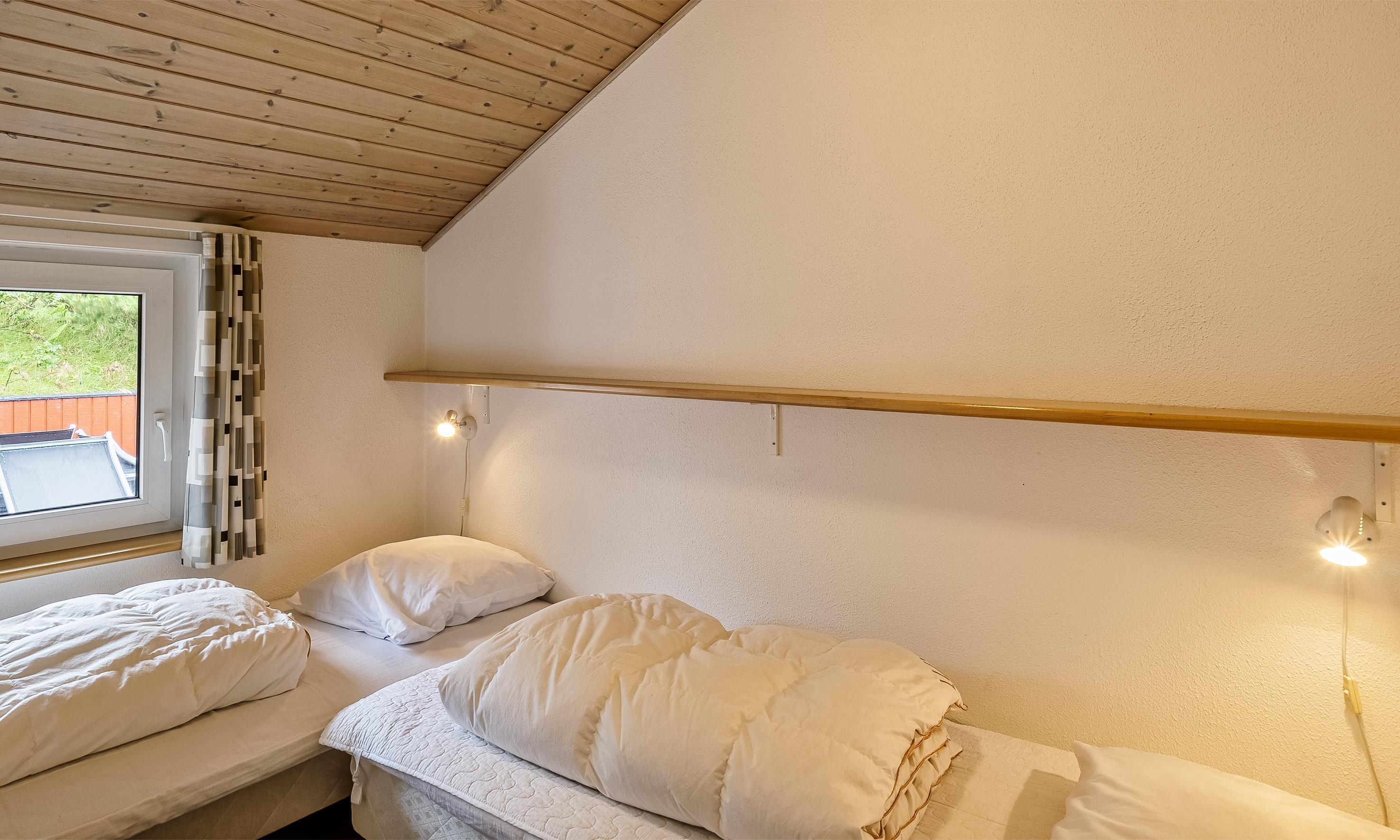 4 soveværelser. 2 med dobbeltseng 180x200 cm. 2 med 2 enkeltsenge (á 90x200 cm)