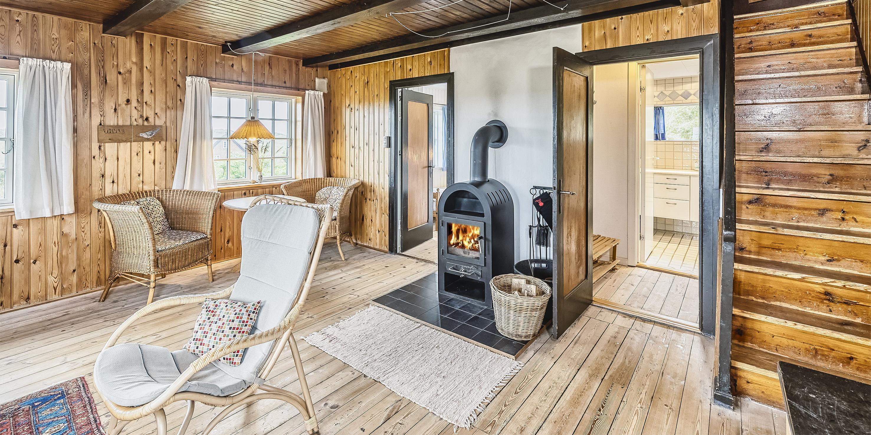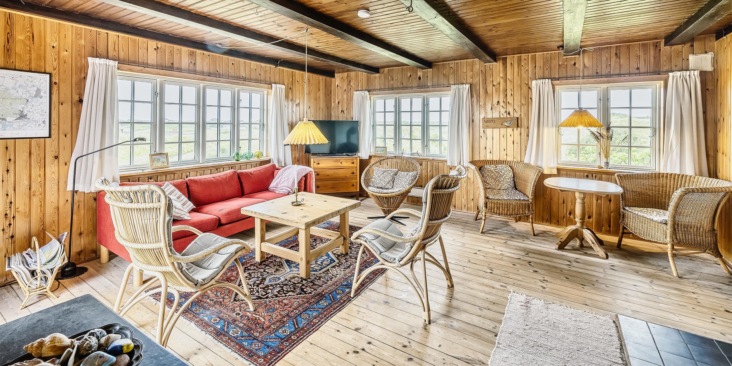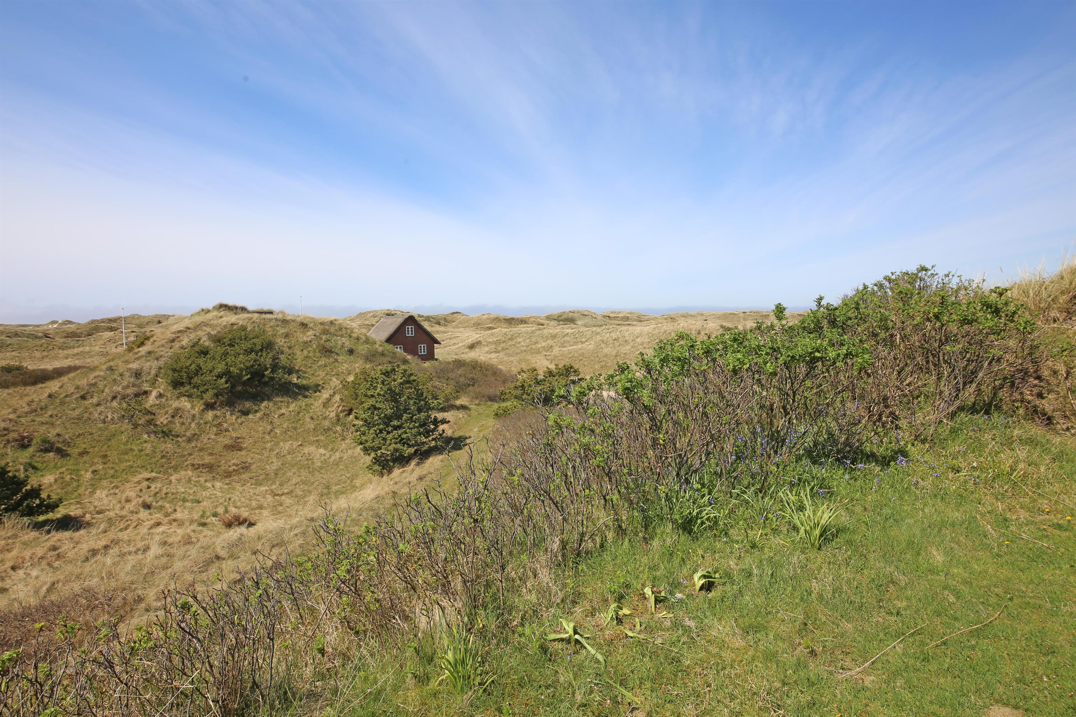 Huset indeholder: Der er indgang til huset over terrassen direkte ind i stuen eller bagindgang ved køkkenet. Den hyggelige stue er med sprossevinduer hvorfra man kan nyde panoramaudsigten over klitterne. Stuen er med flere hyggekroge, varmepumpe, brændeovn, Google Chrome Cast og tv med Sat-programmer og Danske DR programmer. Fra stuen er der indgang til et soveværelse med 2 enkeltsenge. Stort landkøkken med kogeplader, bageovn, opvaskemaskine, køle-/fryseskab (30 L), køkkenet har et stort spisebord med slagbænk hvor alle kan nyde dagens måltider. Fra stuen er der endvidere indgang til lyst badeværelse med vaskearrangement bruser og toilet. Vaskemaskine og tørretumbler. Trappen til 1. sal rækkes over en stejl trappe fra stuen. På 1. sal befinder sig et repos hvorfra der er indgang til 3 soverum. 1 soverum med 2 enkelt senge (sengene er 180 cm. i længden). 1 soveværelse med en dobbeltseng bygget ind som alkove. 1 stort soveværelse med dobbeltseng. Lofthøjden på 1. sal er maximum 2,00 meter. Fra de halvbuede vinduer har man en fantastisk udsigt over Nordvej. Der er nødåbninger på 1. sal., midtersprossen kan trykkes ud. 4 soveværelser: 2S + 2S + DS + DS.