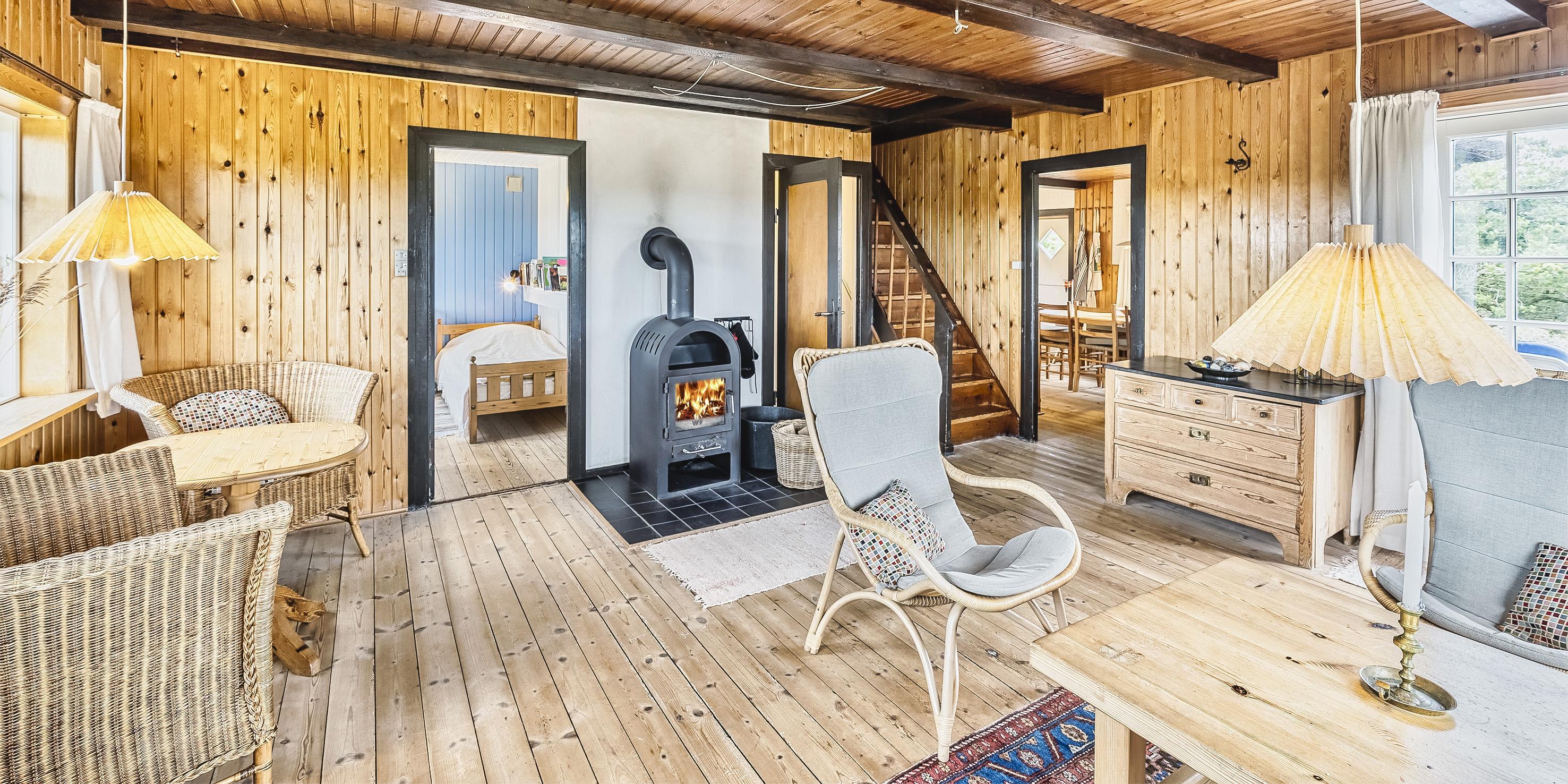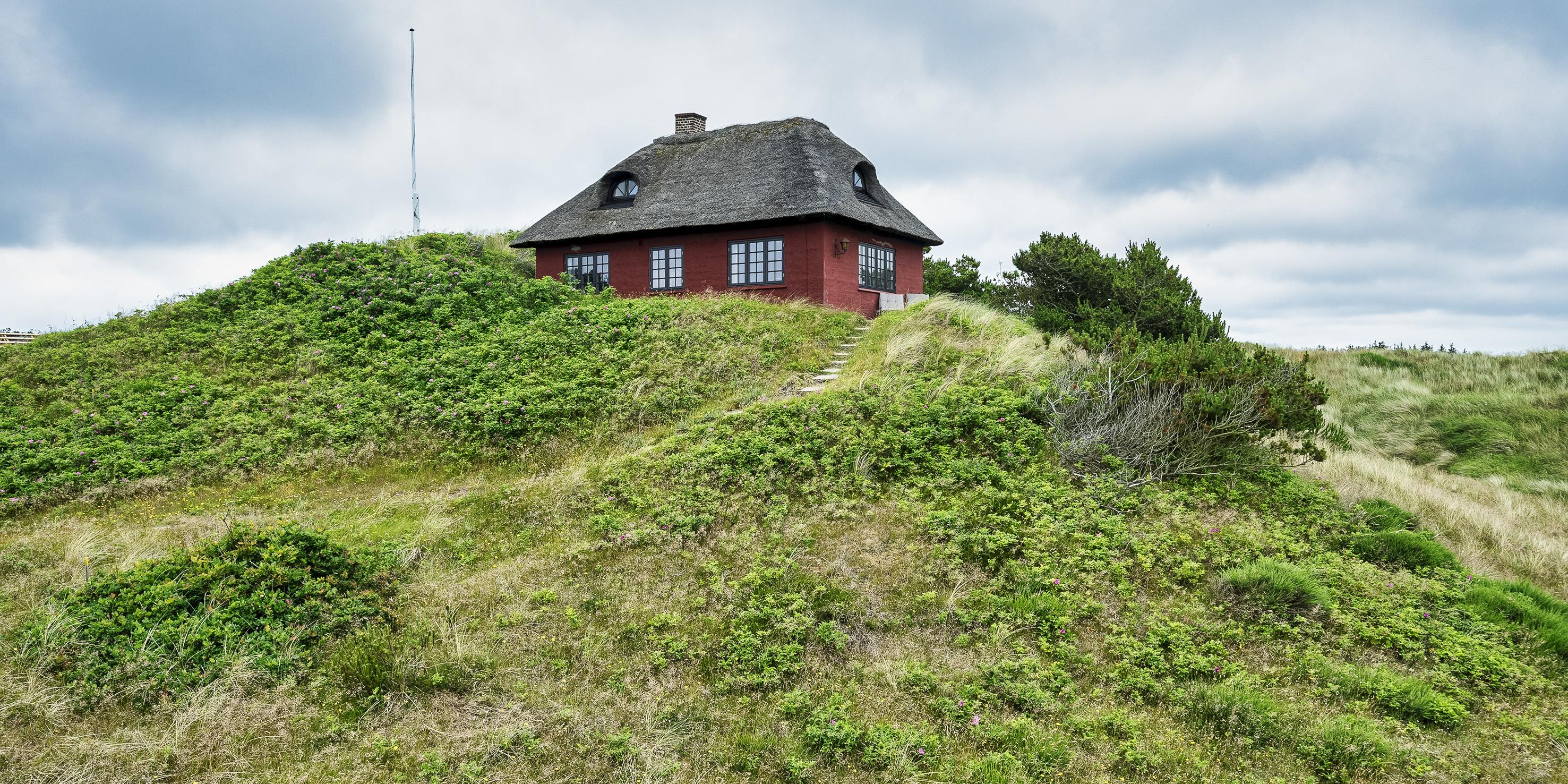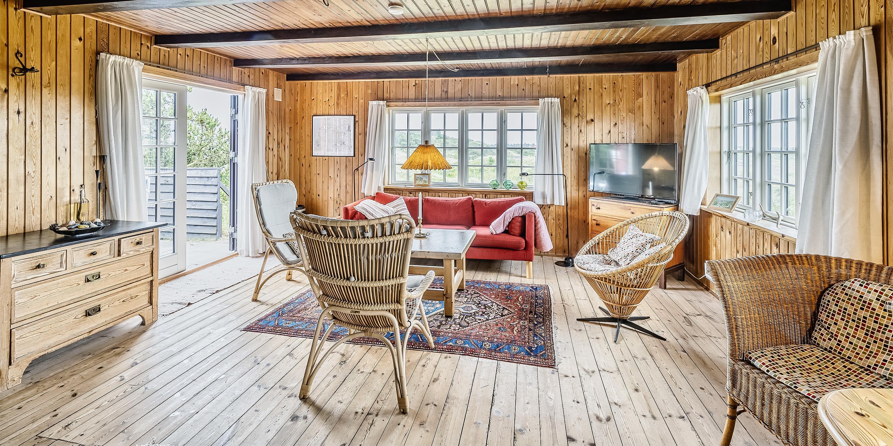 Huset indeholder: Der er indgang til huset over terrassen direkte ind i stuen eller bagindgang ved køkkenet. Den hyggelige stue er med sprossevinduer hvorfra man kan nyde panoramaudsigten over klitterne. Stuen er med flere hyggekroge, varmepumpe, brændeovn, Google Chrome Cast og tv med Sat-programmer og Danske DR programmer. Fra stuen er der indgang til et soveværelse med 2 enkeltsenge. Stort landkøkken med kogeplader, bageovn, opvaskemaskine, køle-/fryseskab (30 L), køkkenet har et stort spisebord med slagbænk hvor alle kan nyde dagens måltider. Fra stuen er der endvidere indgang til lyst badeværelse med vaskearrangement bruser og toilet. Vaskemaskine og tørretumbler. Trappen til 1. sal rækkes over en stejl trappe fra stuen. På 1. sal befinder sig et repos hvorfra der er indgang til 3 soverum. 1 soverum med 2 enkelt senge (sengene er 180 cm. i længden). 1 soveværelse med en dobbeltseng bygget ind som alkove. 1 stort soveværelse med dobbeltseng. Lofthøjden på 1. sal er maximum 2,00 meter. Fra de halvbuede vinduer har man en fantastisk udsigt over Nordvej. Der er nødåbninger på 1. sal., midtersprossen kan trykkes ud. 4 soveværelser: 2S + 2S + DS + DS.