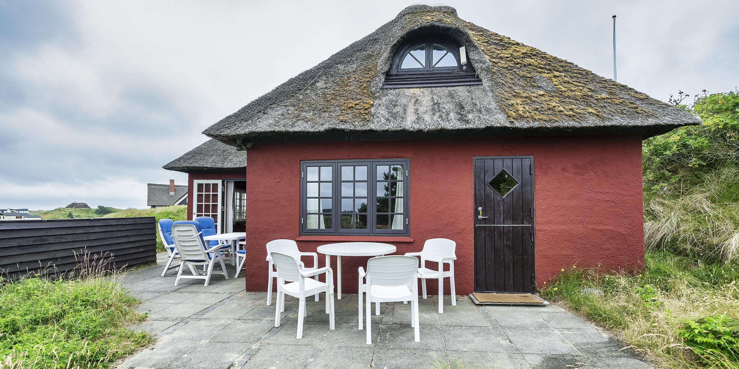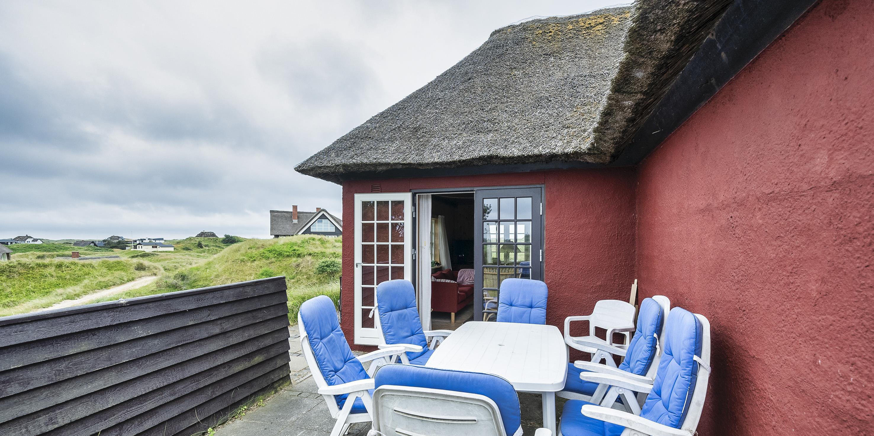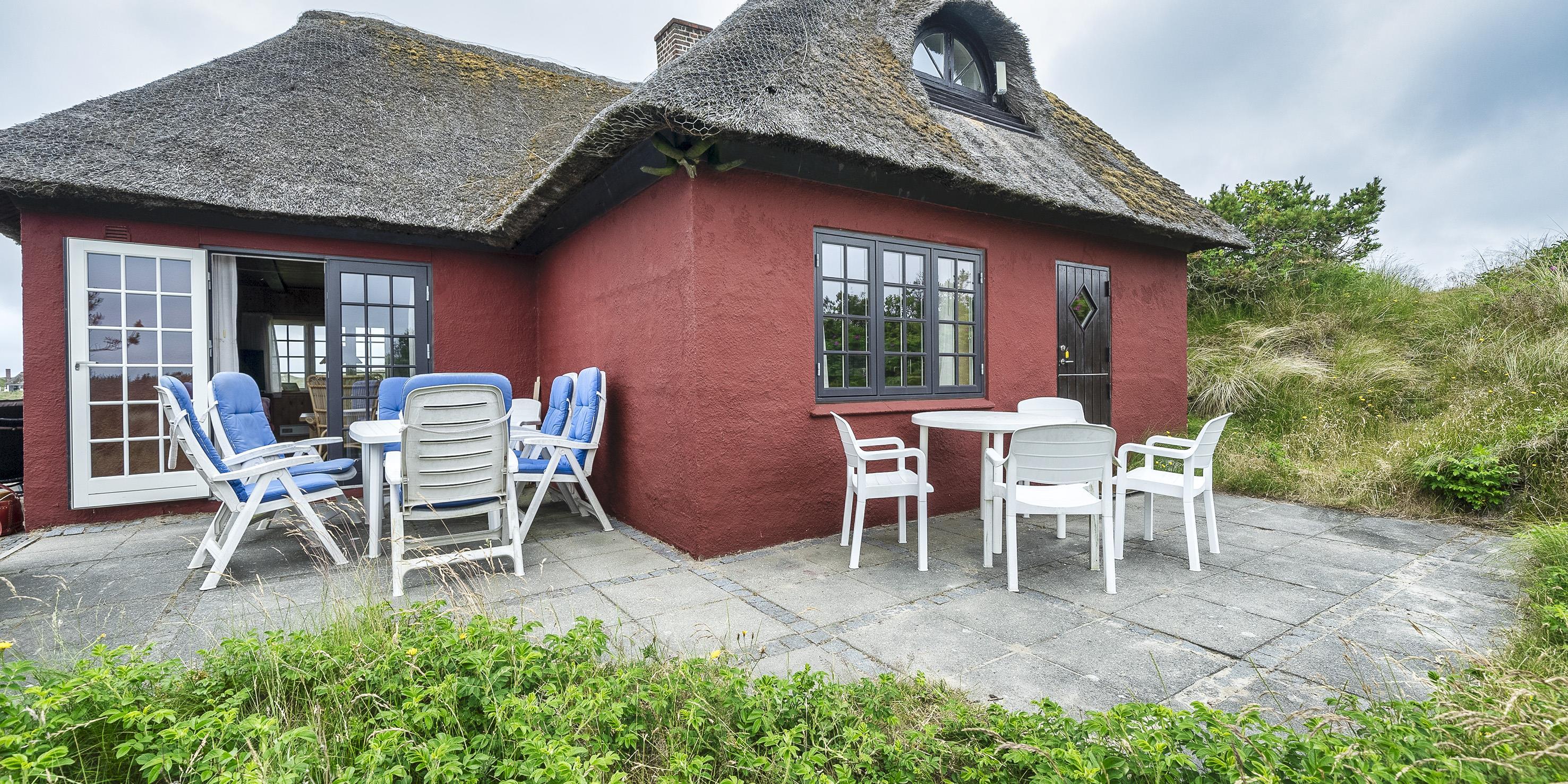 Hyggeligt stråtækt idyllisk sommerhus til 6 voksne og 2 børn, med en fantastisk beliggenhed på skøn naturgrund ca. 300 m. fra stranden. Parkering til huset er fra Nordvej, huset rækkes over en gangsti i klitterne, samt ca. 10 trin op til terrassen.