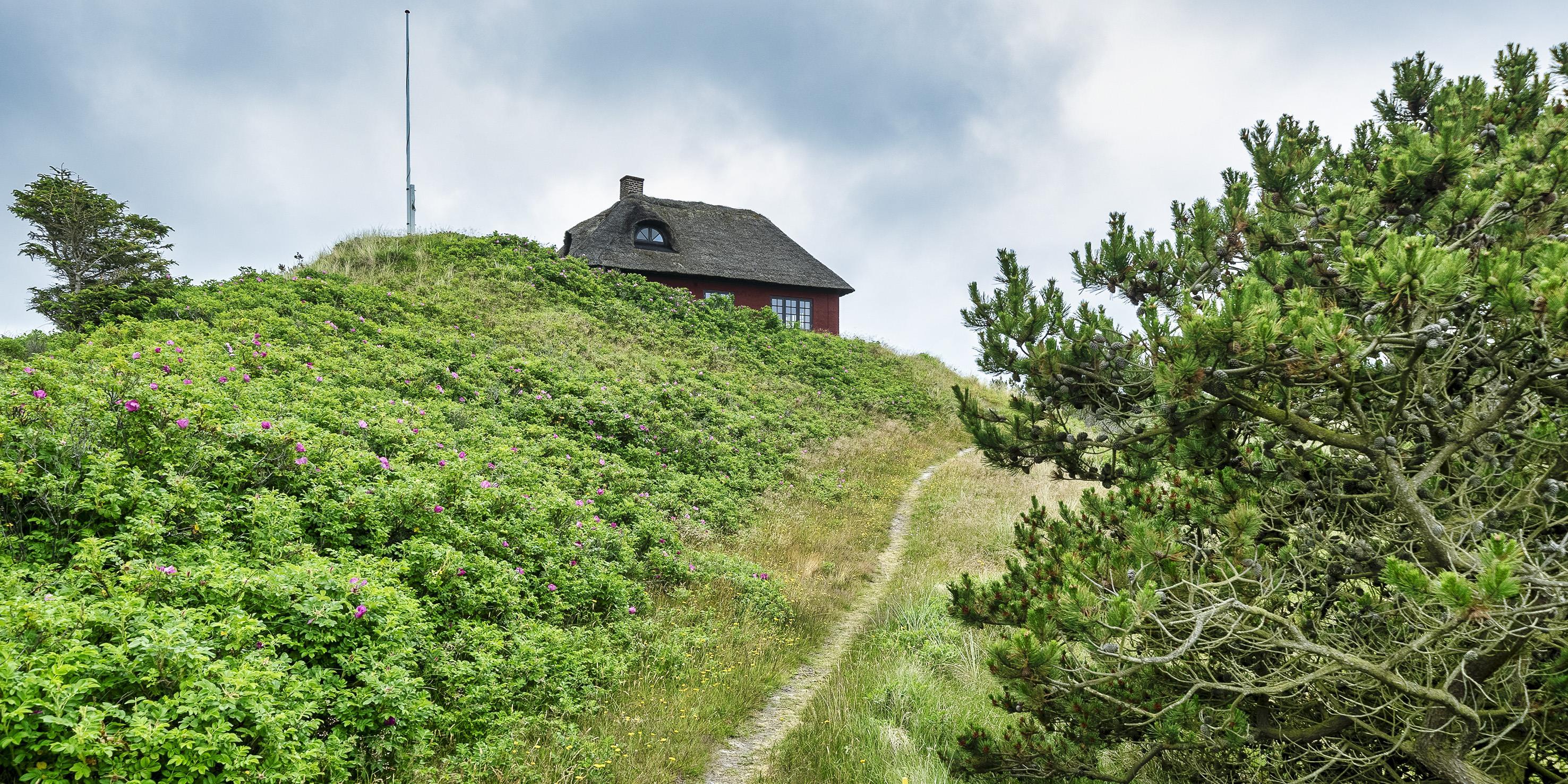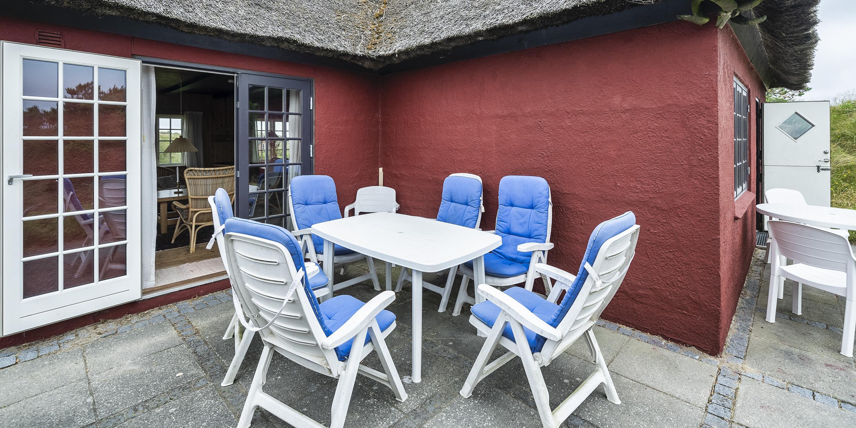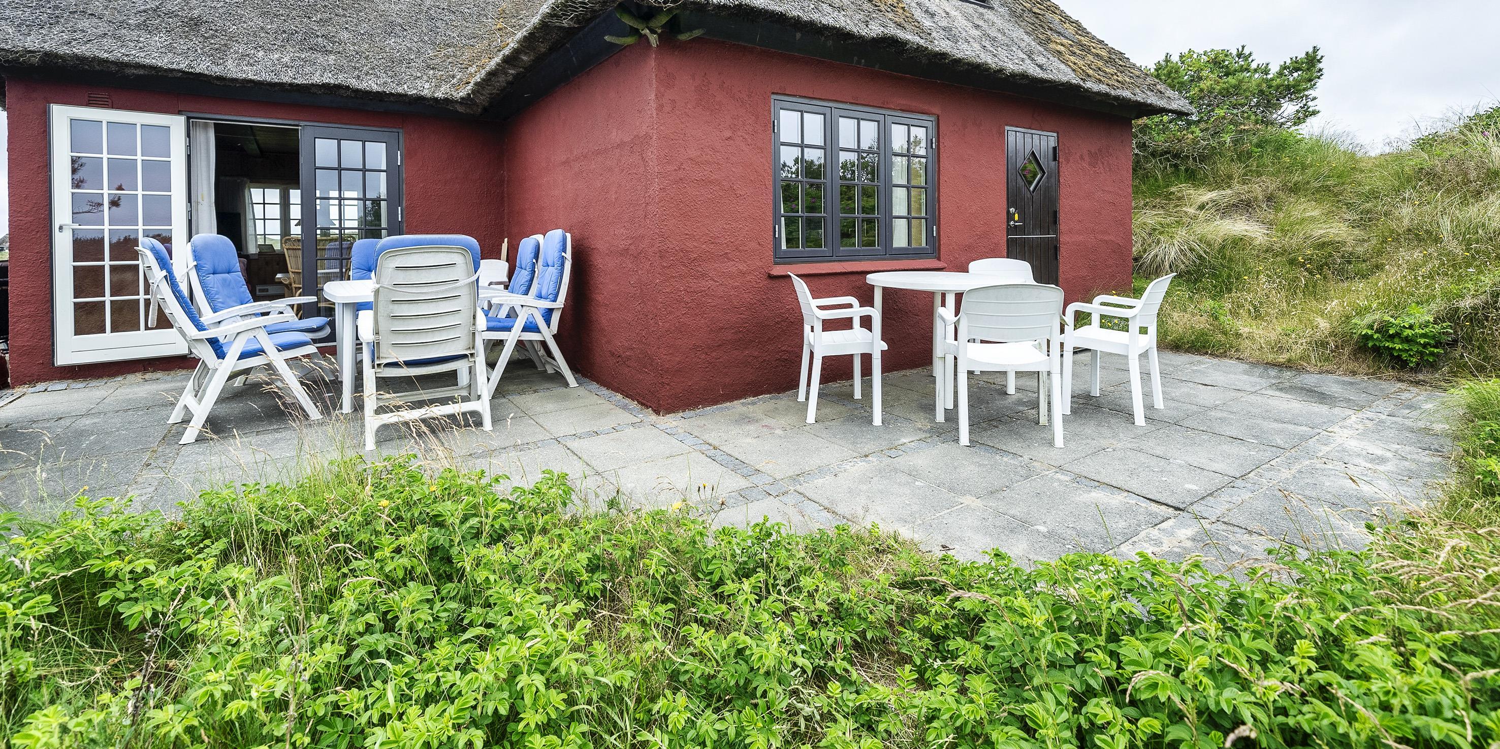 Hyggeligt stråtækt idyllisk sommerhus til 6 voksne og 2 børn, med en fantastisk beliggenhed på skøn naturgrund ca. 300 m. fra stranden. Parkering til huset er fra Nordvej, huset rækkes over en gangsti i klitterne, samt ca. 10 trin op til terrassen.