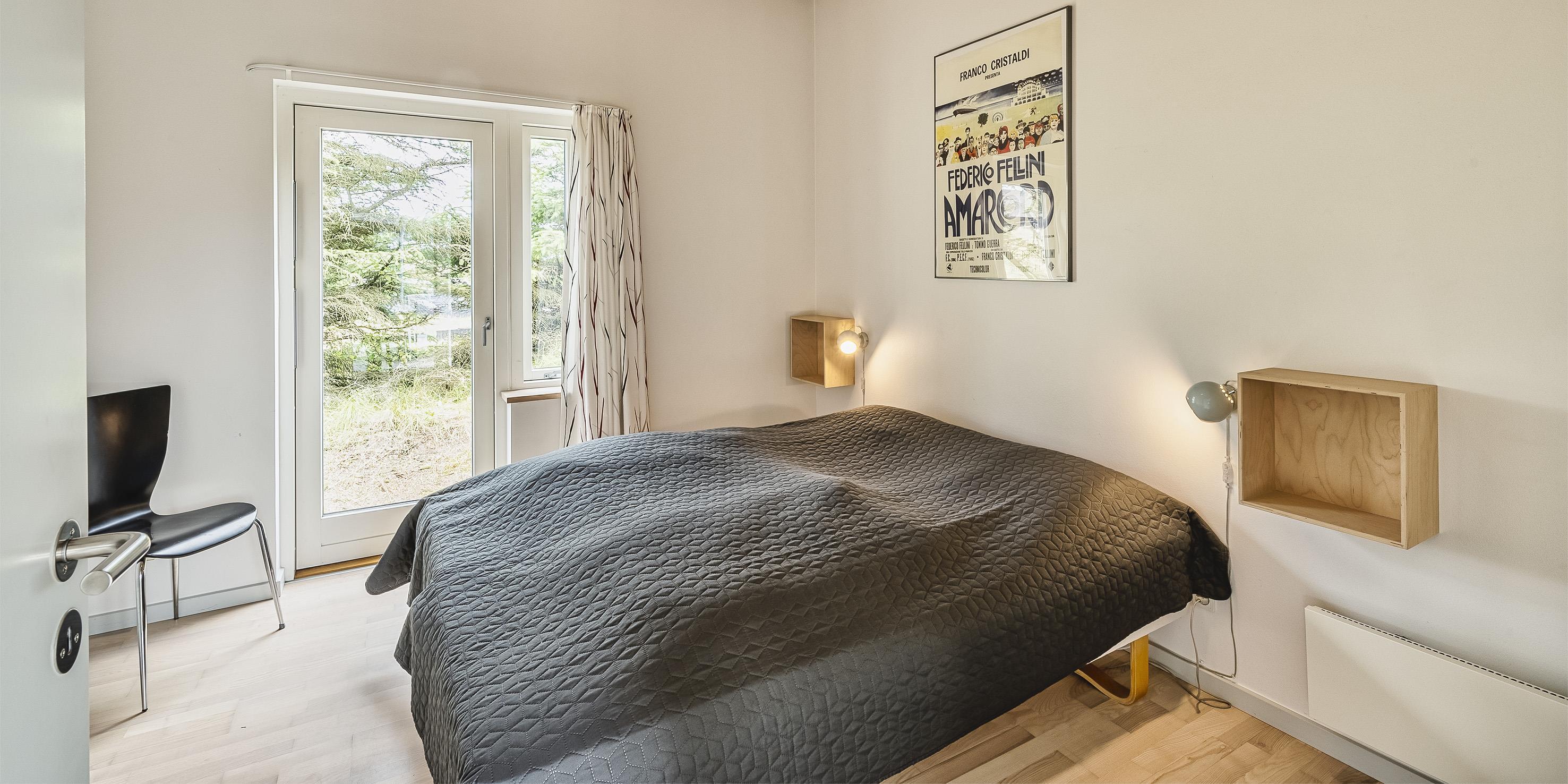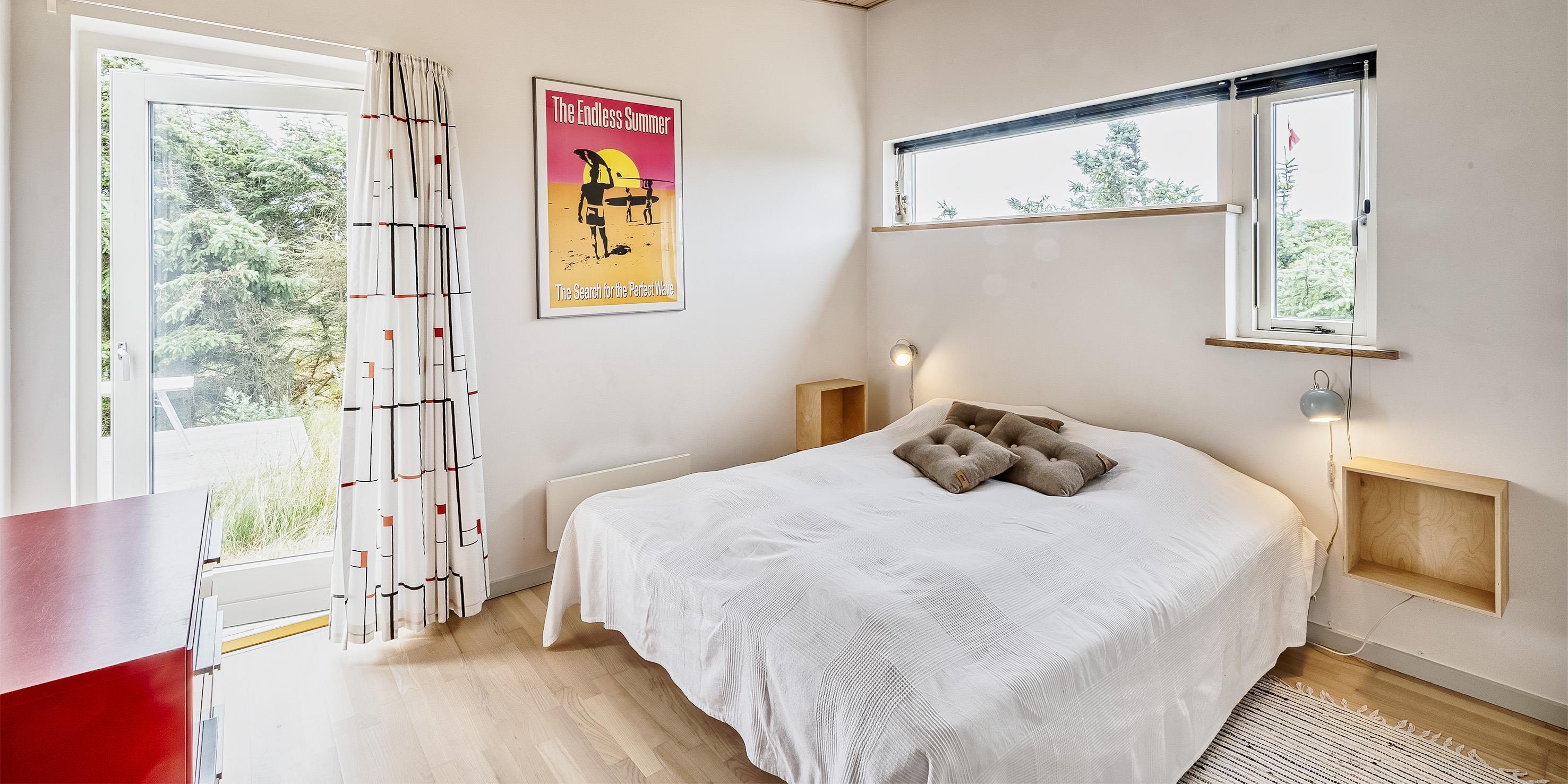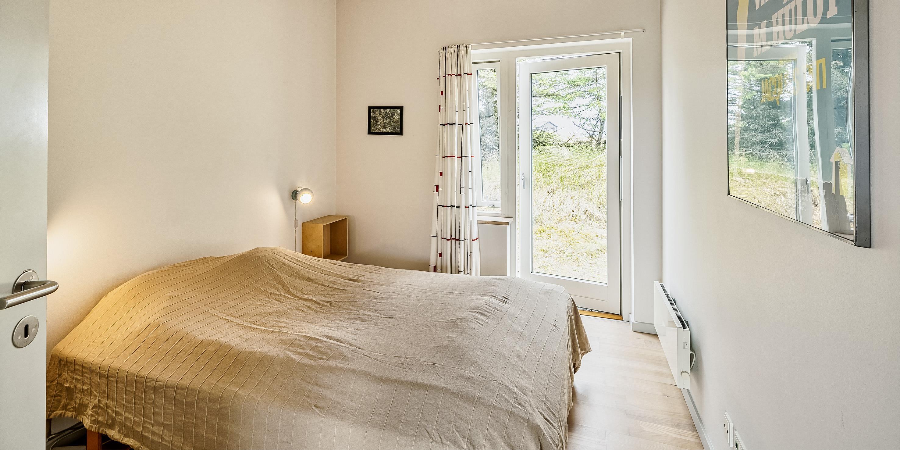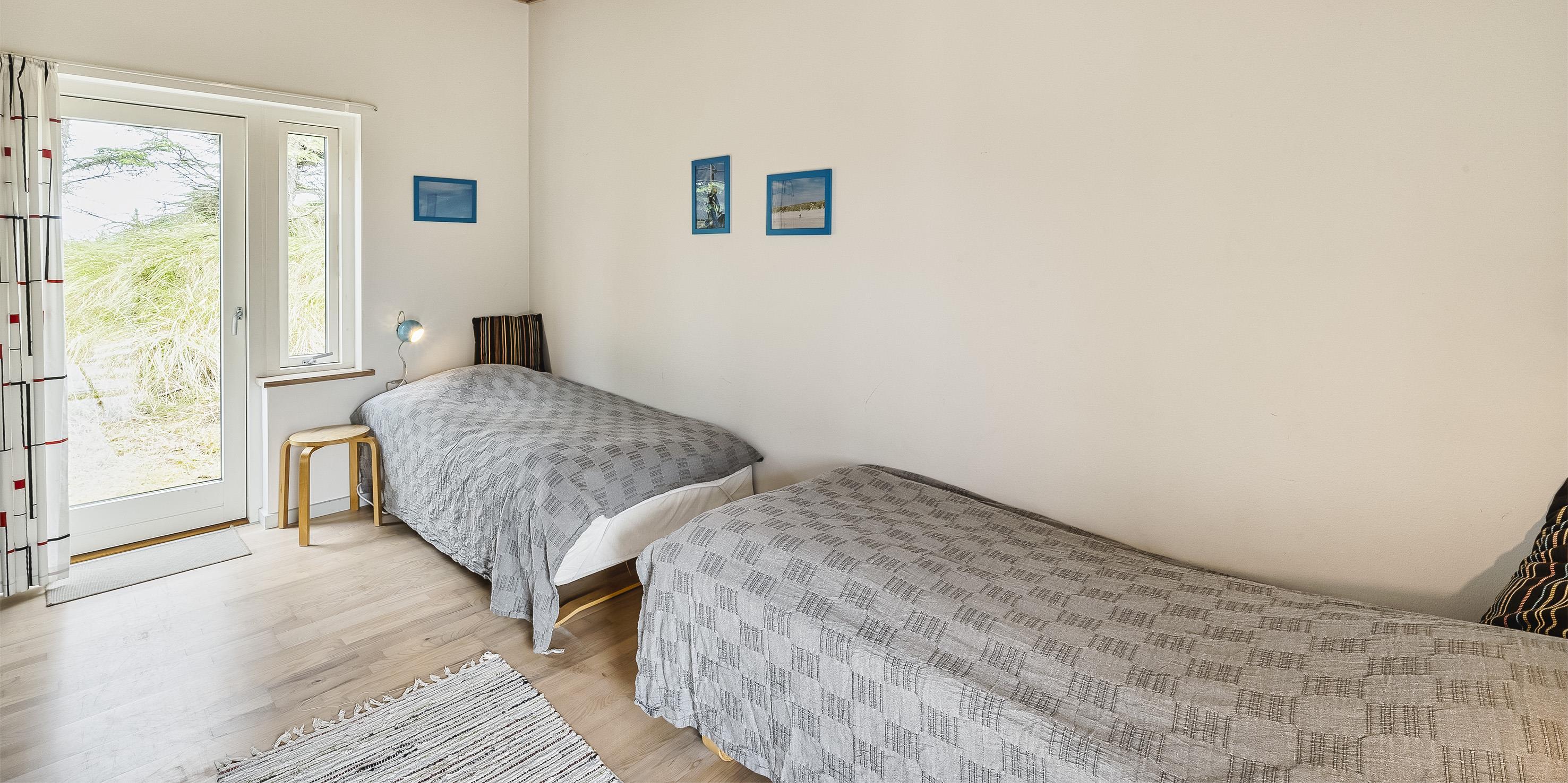 4 soveværelser. 2 med dobbeltseng 180x200 cm. 1 med 2 enkeltsenge (á 90x200 cm)