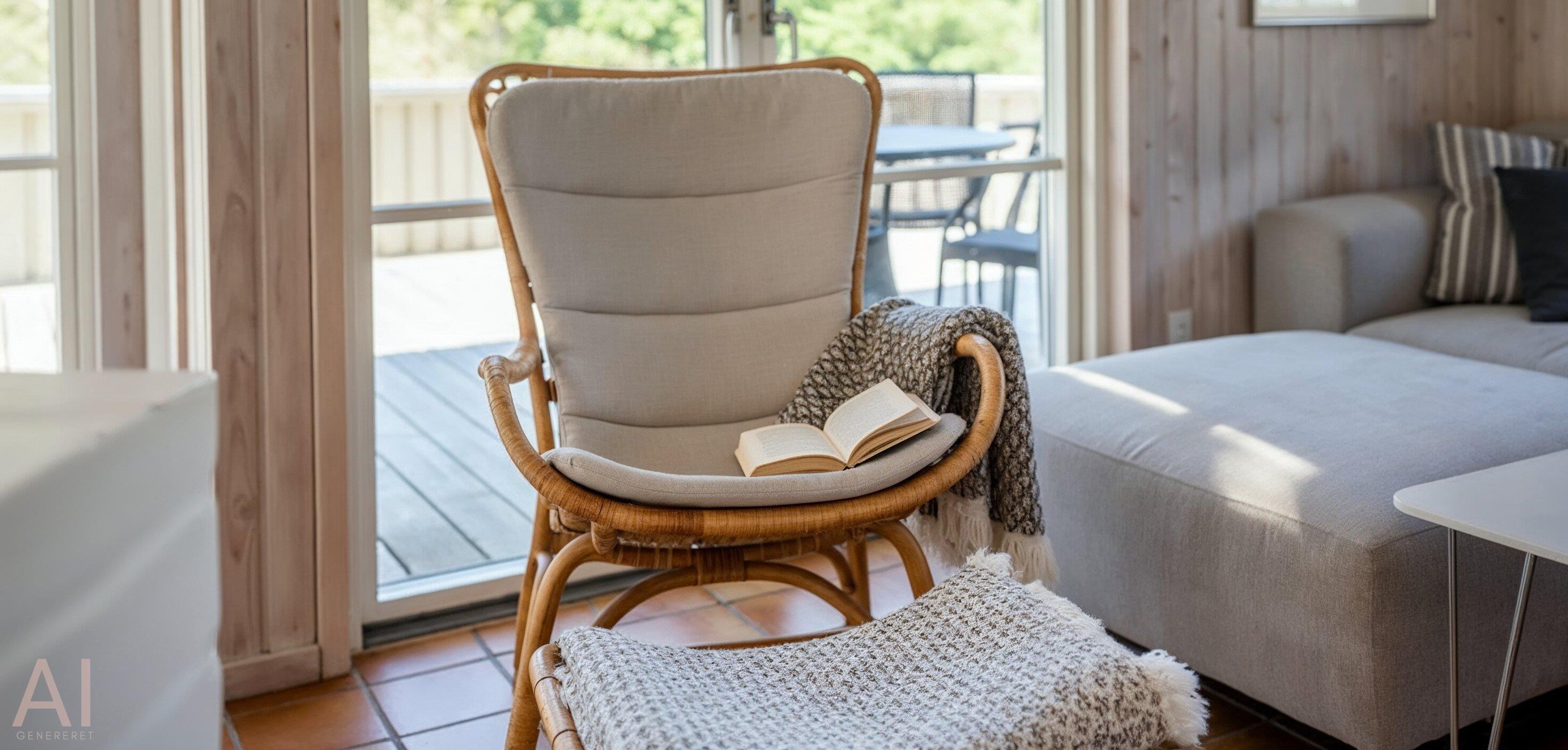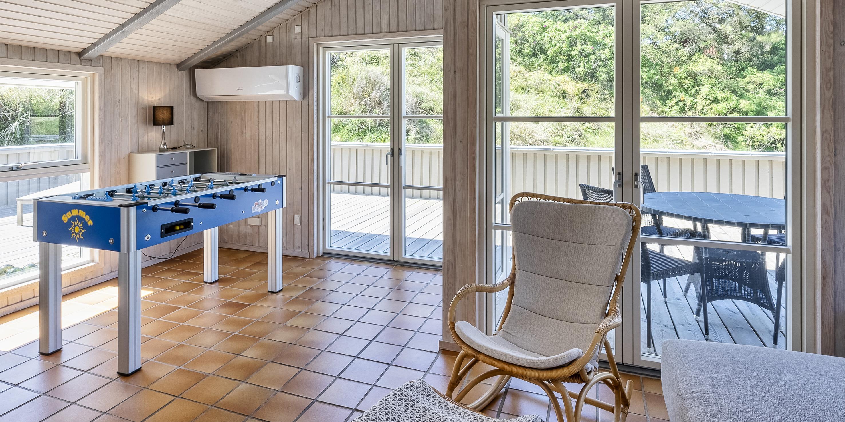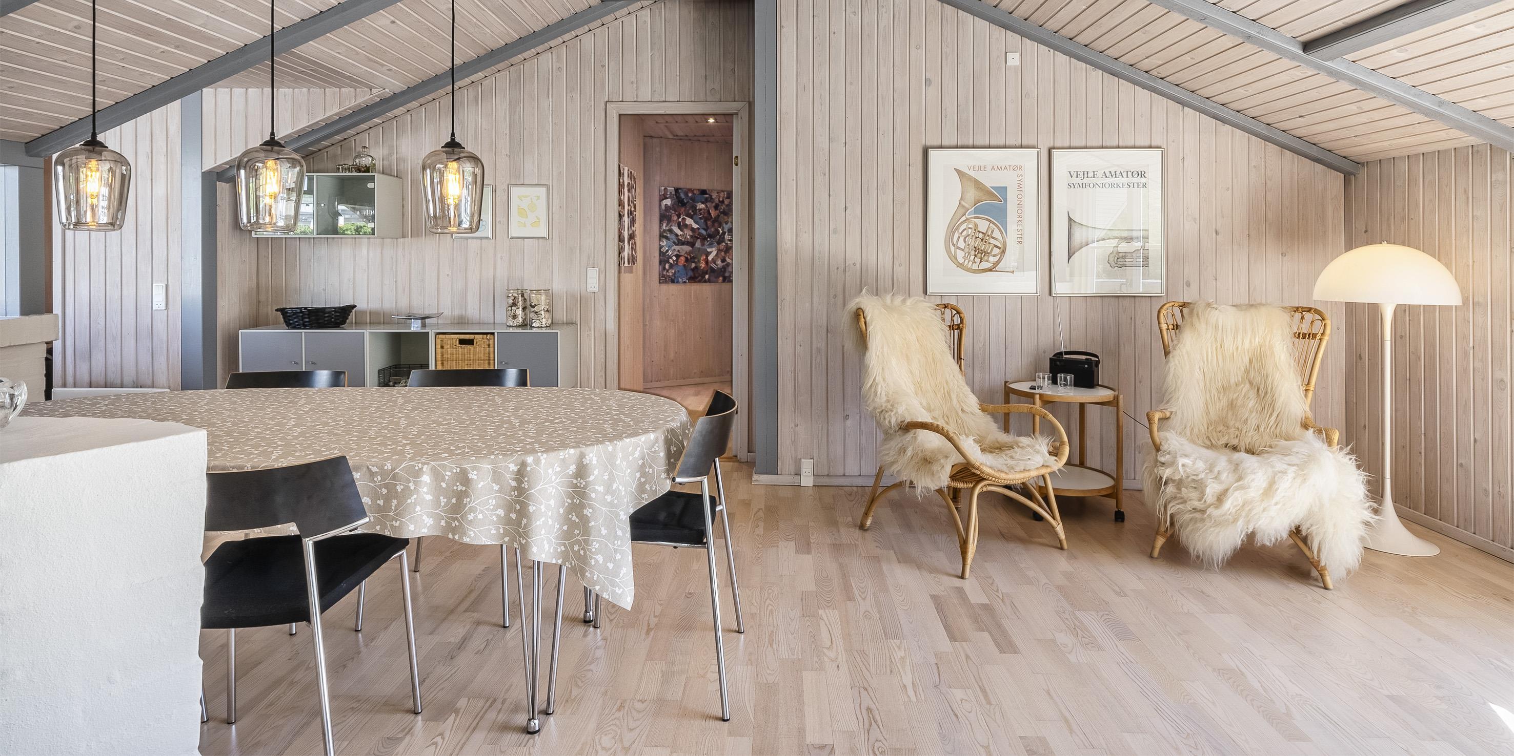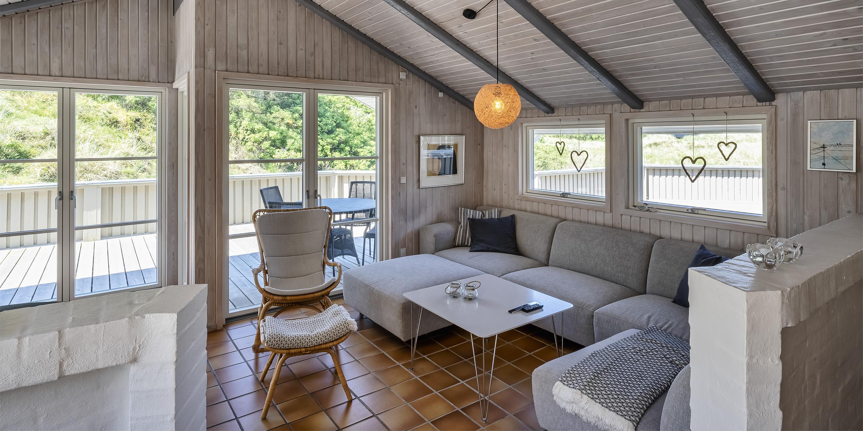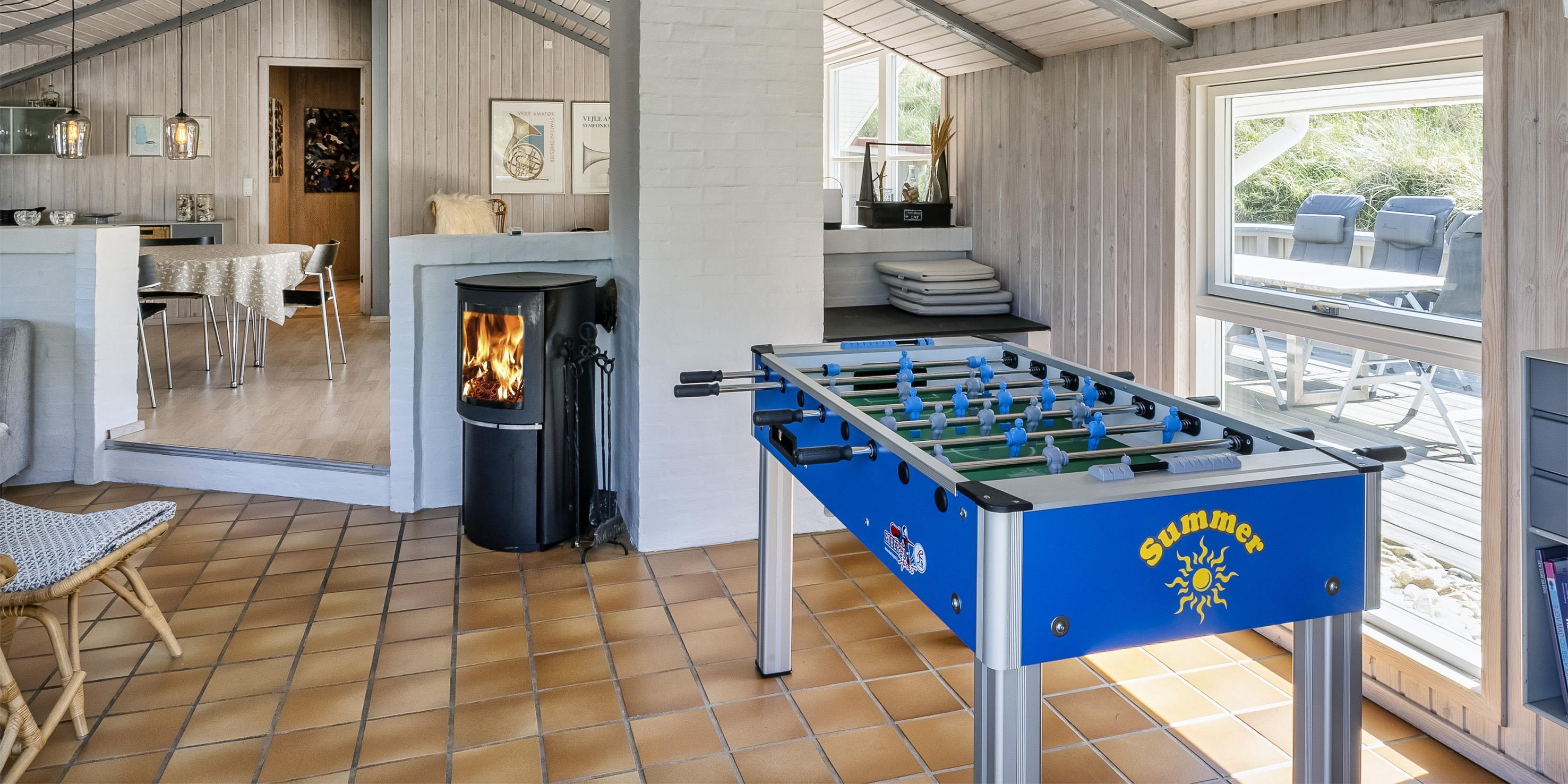 Stuen er indrettet med spiseplads og en hyggekrog, hvor I kan samle familien om brændeovnen. Der er også en varmepumpe, som sikrer et behageligt indeklima året rundt, samt gratis trådløs internetadgang.