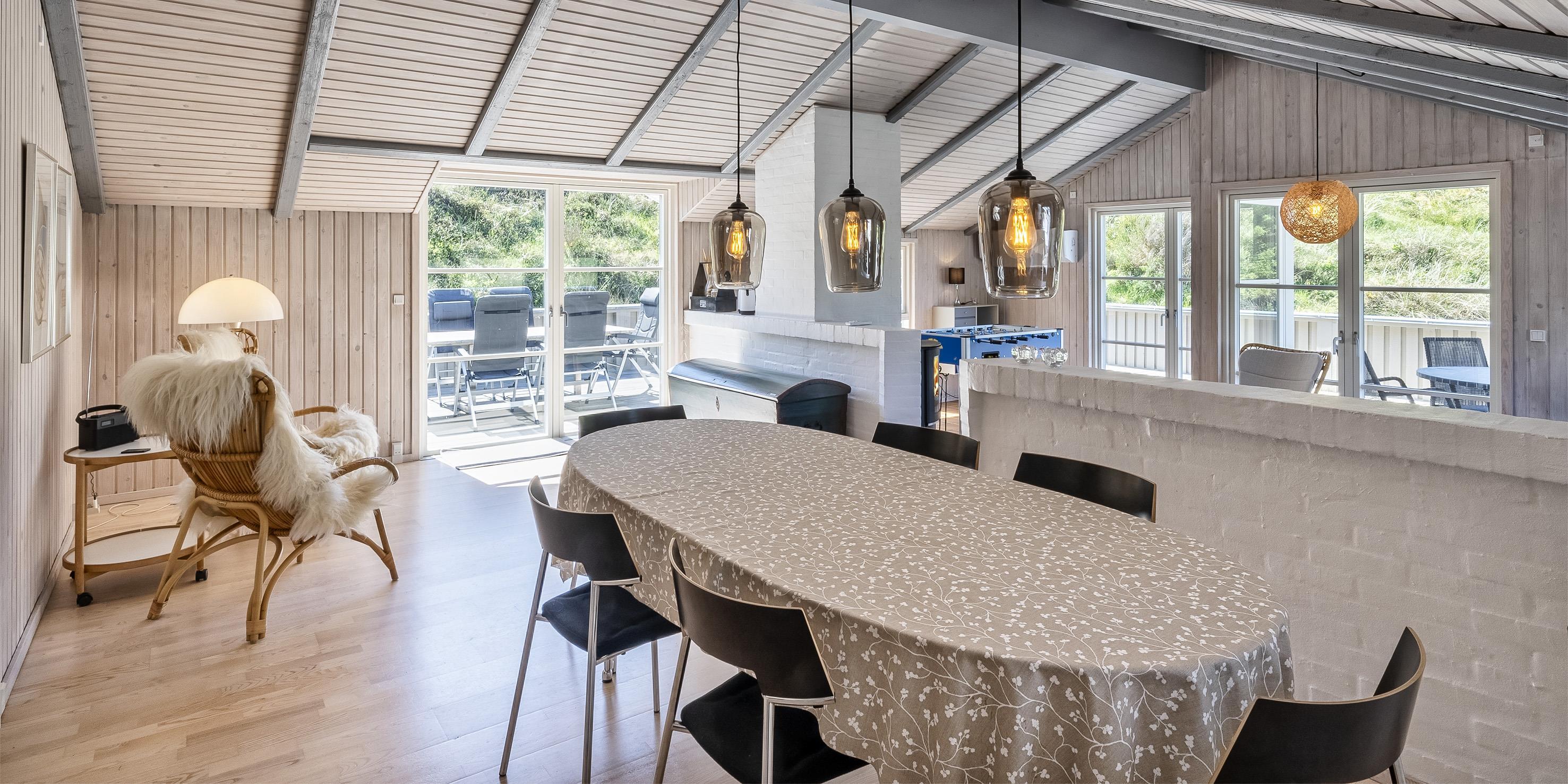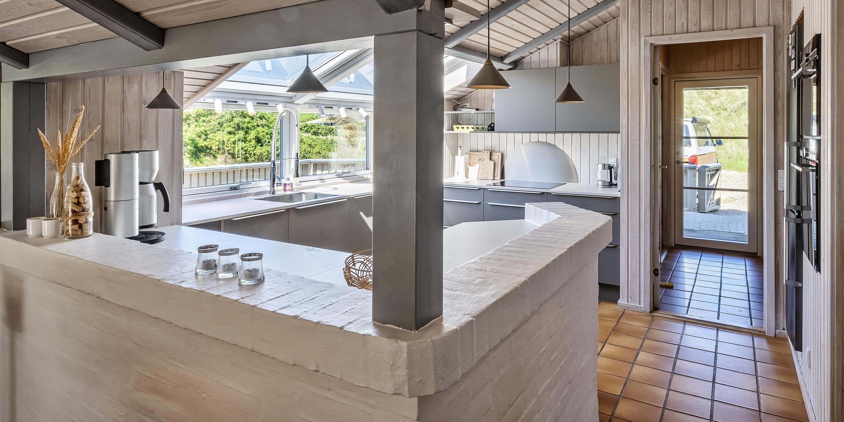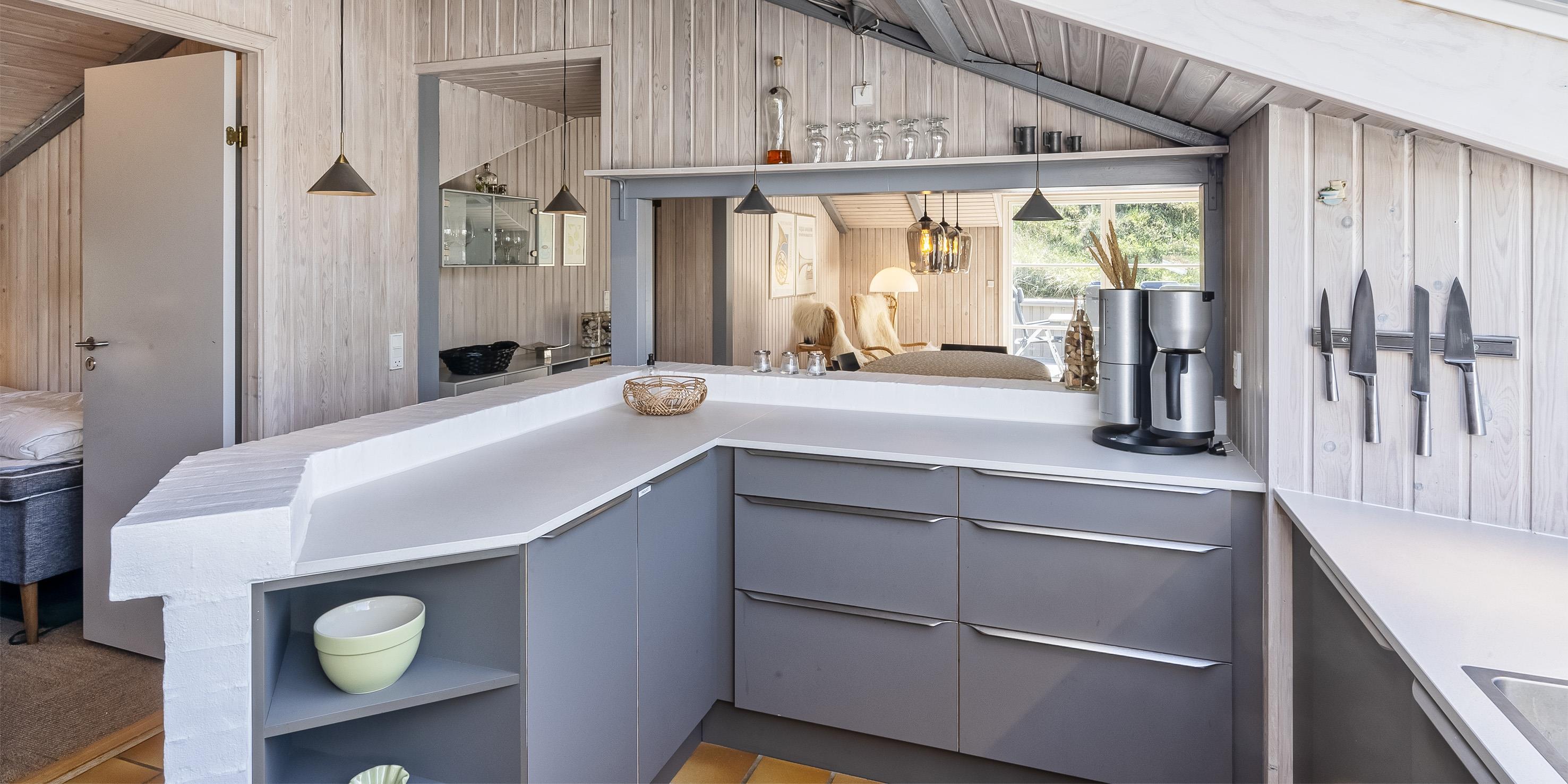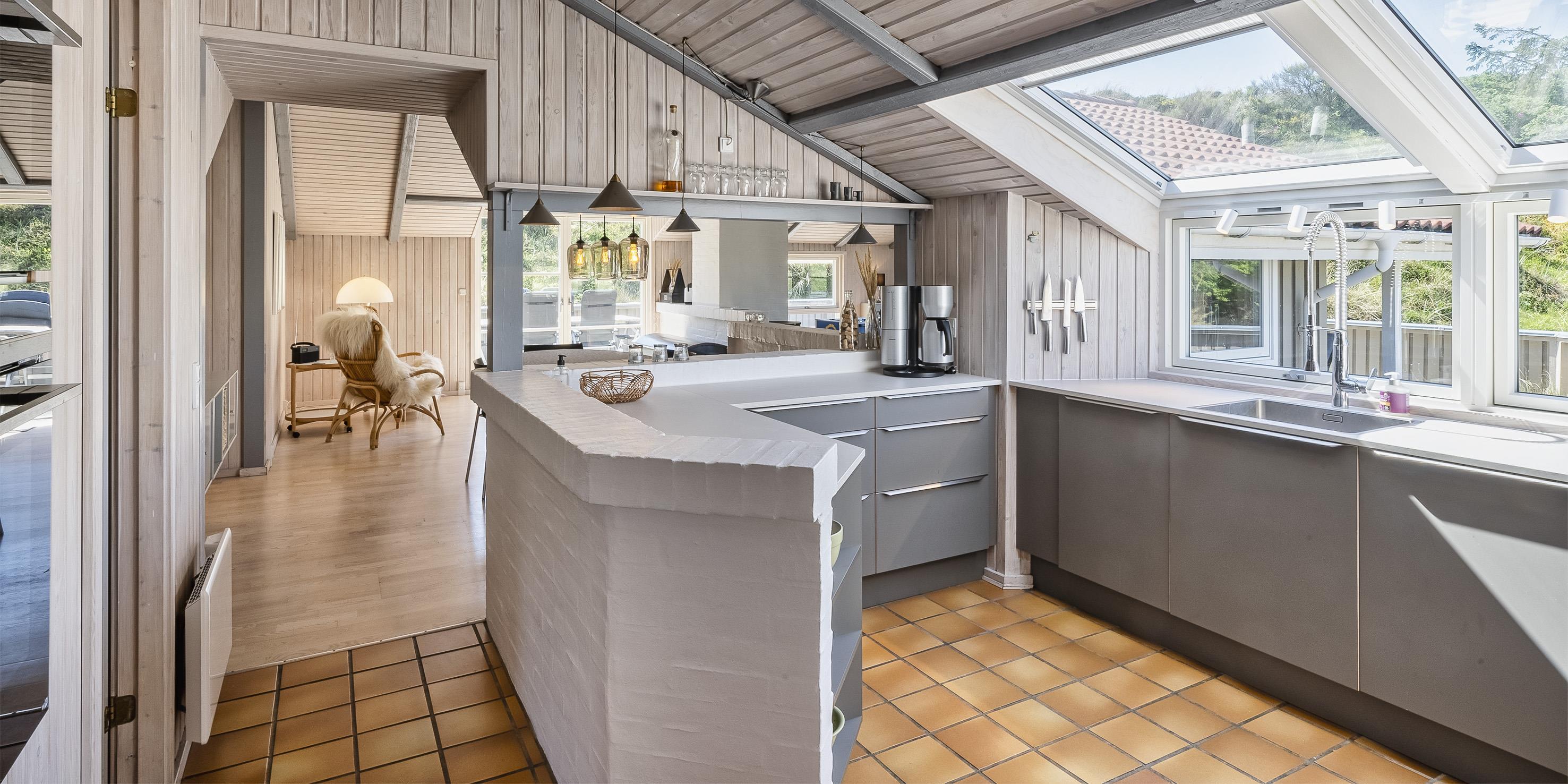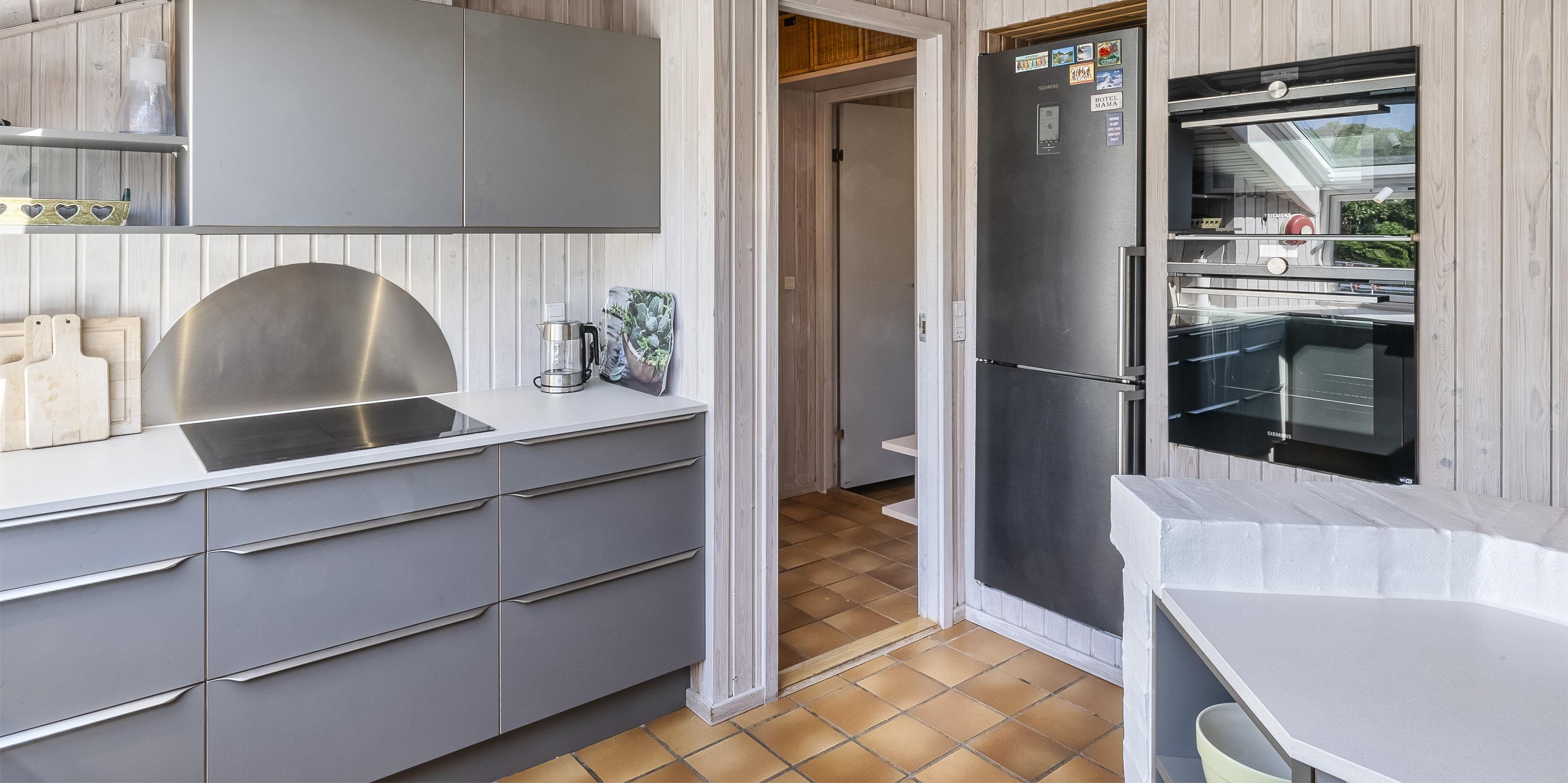 Sommerhuset byder på et stort og læfuldt terrasseområde, hvor I kan nyde jeres måltider udendørs, eller bare slappe af med en god bog og en kop kaffe. Indvendig finder I et åbent og moderne køkken udstyret med bl.a. opvaskemaskine og køle-/frysekombination.