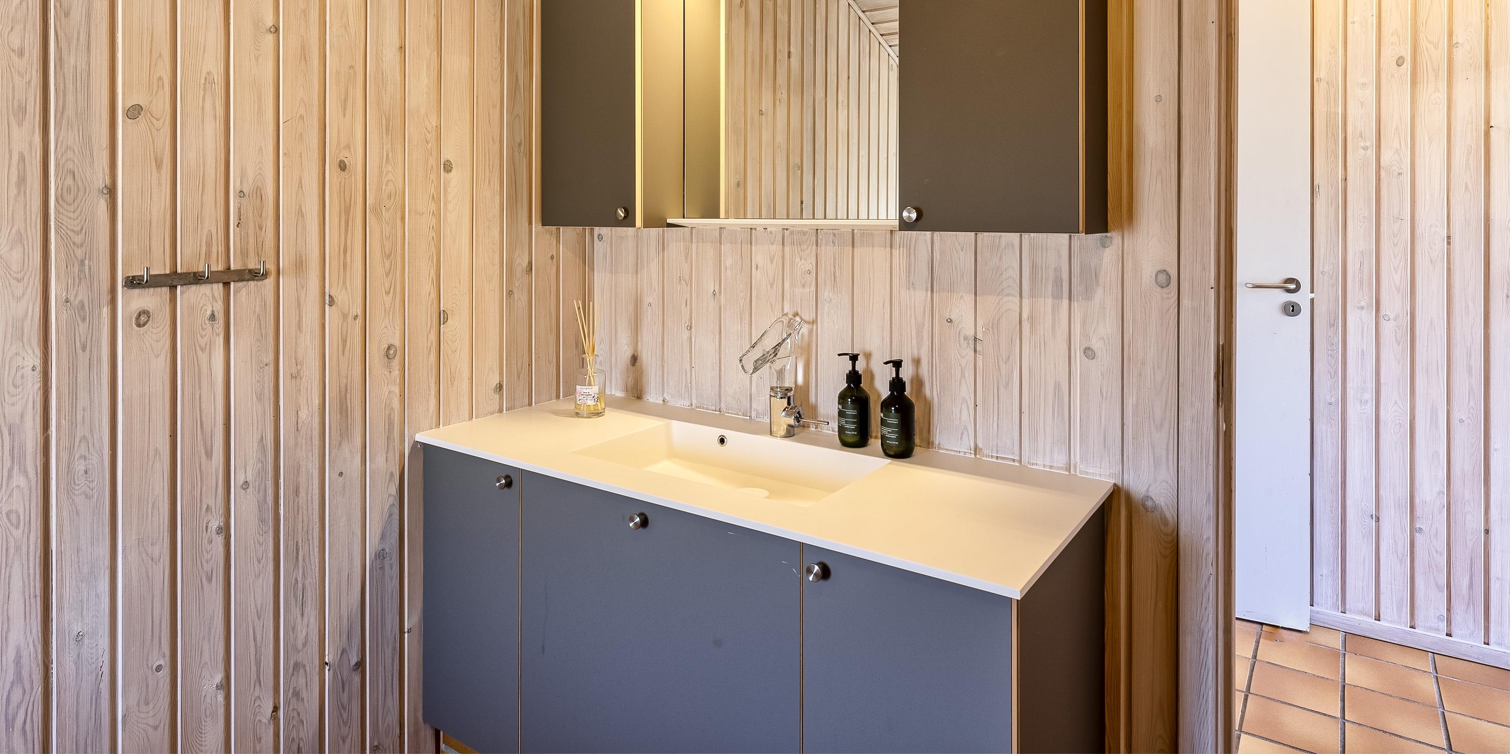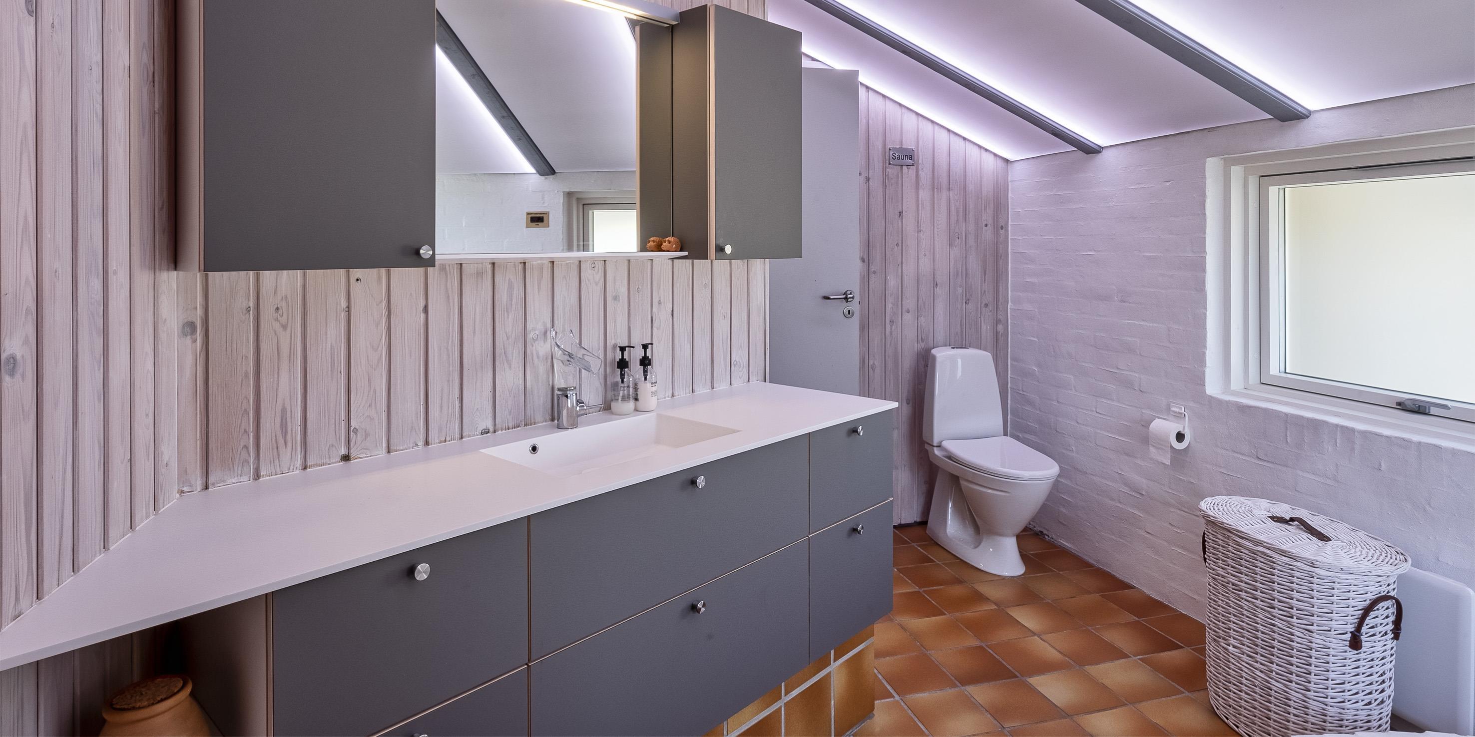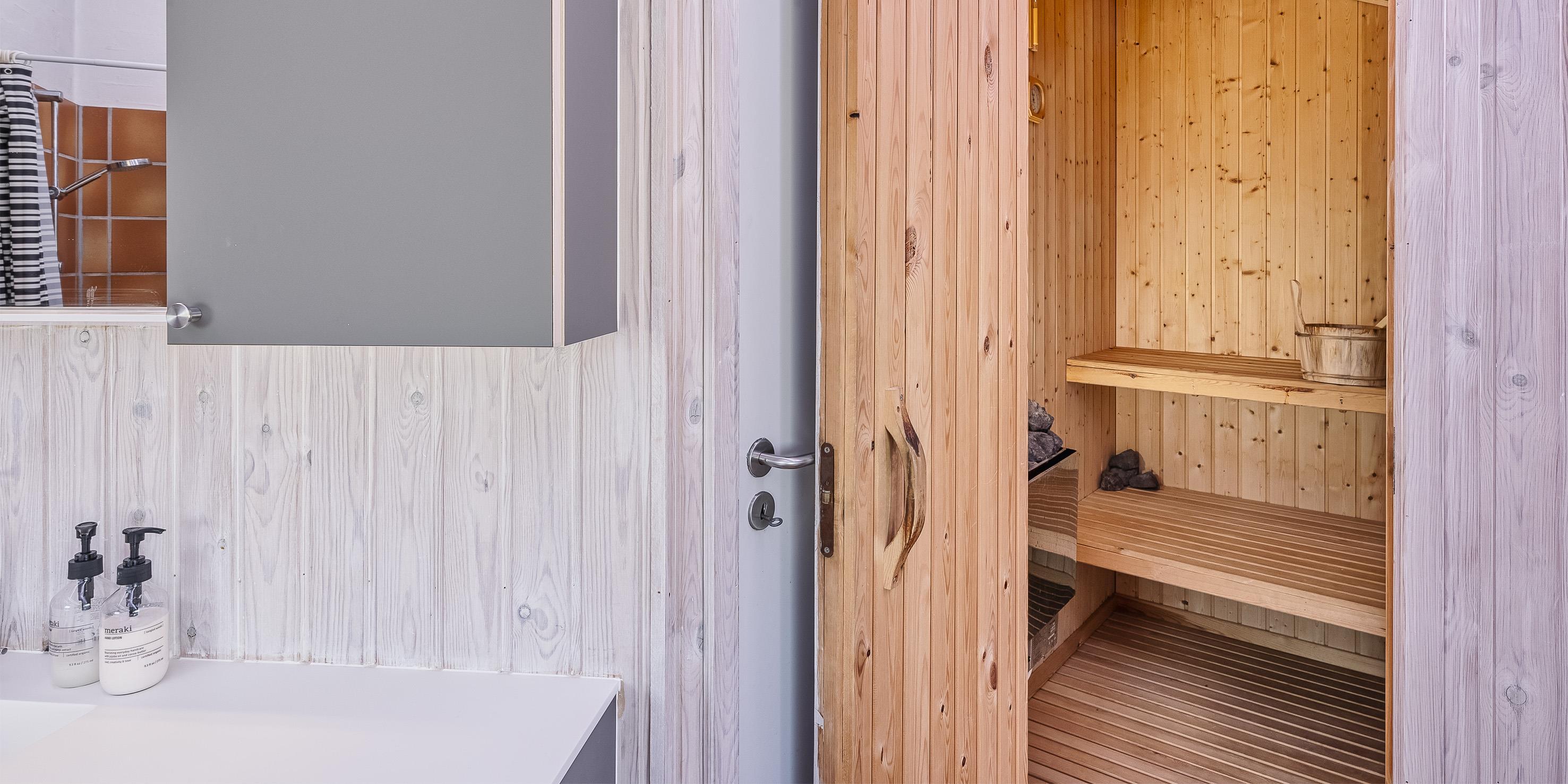 Badeværelset er udstyret med gulvvarme, toilet, bruser, standvandsspa og sauna, hvor I kan nyde afslappende wellness-stunder. Der er også et gæstetoilet med bruser samt et praktisk bryggers med vaskemaskine og tørretumbler.