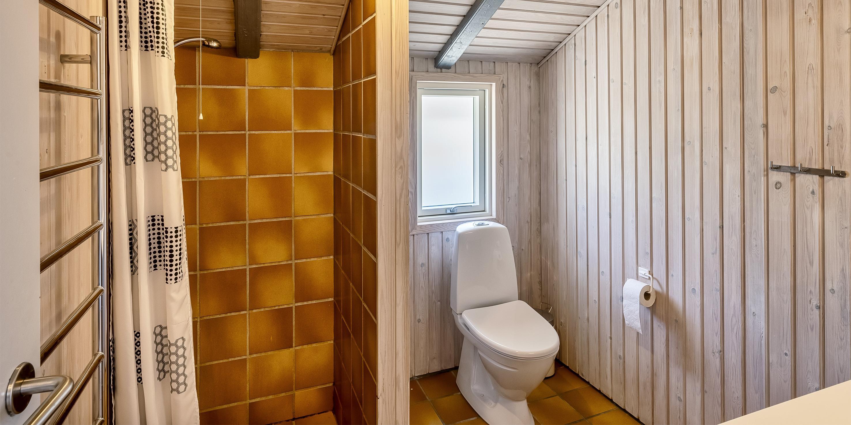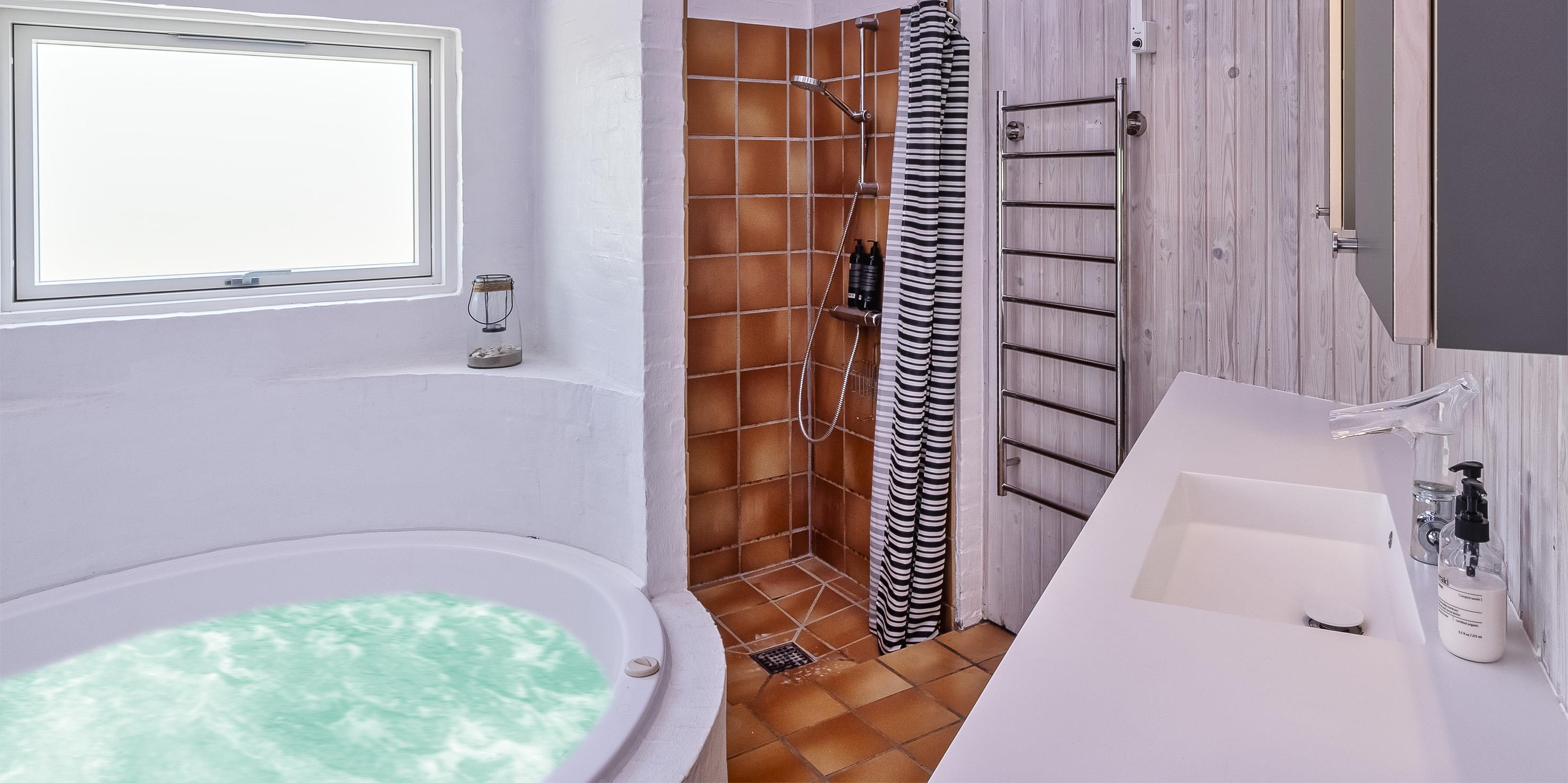 Badeværelse med gulvvarme, toilet, bruser, standvandsspa og sauna
