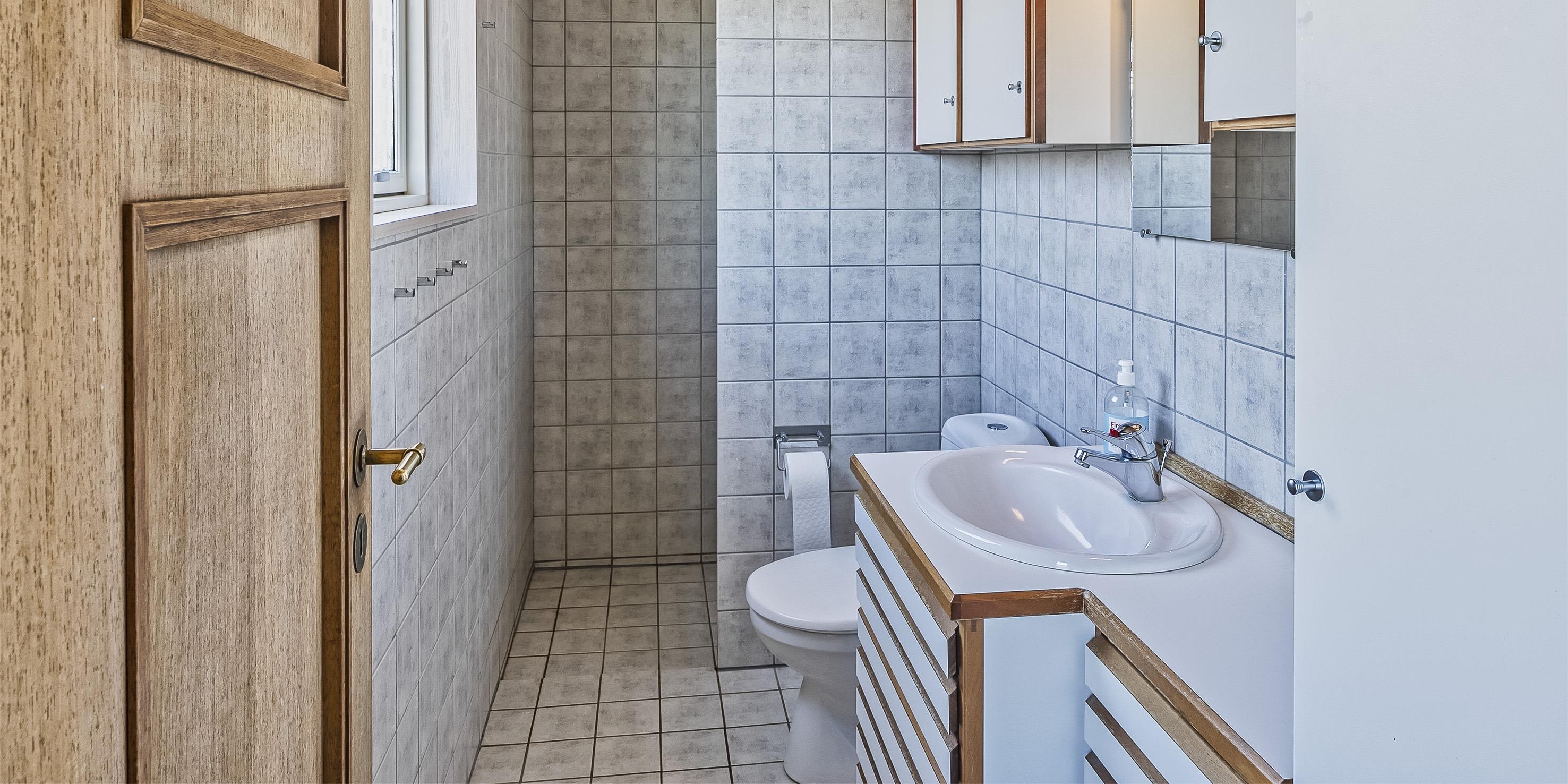 Bad med toilet, bruser og vask