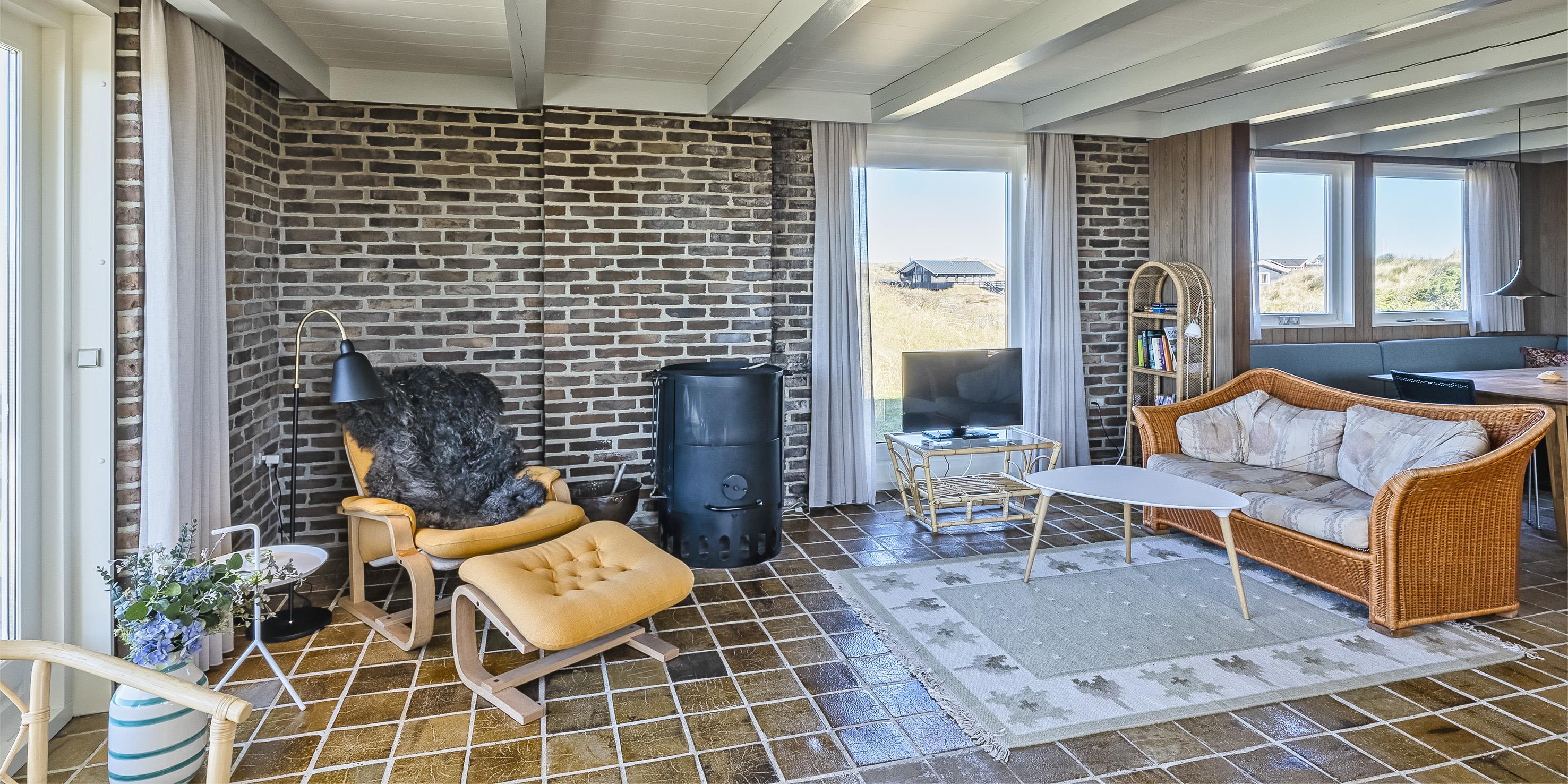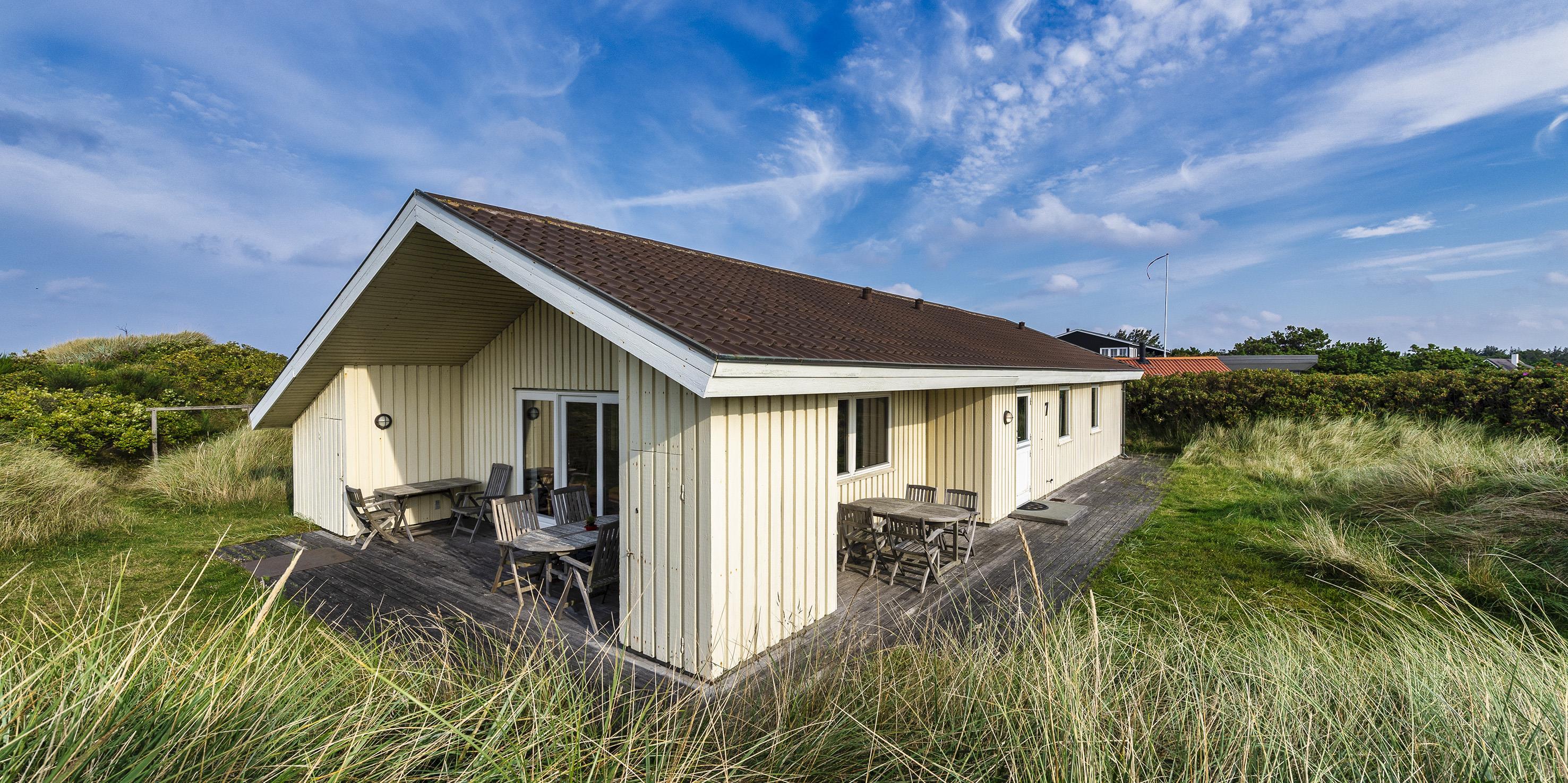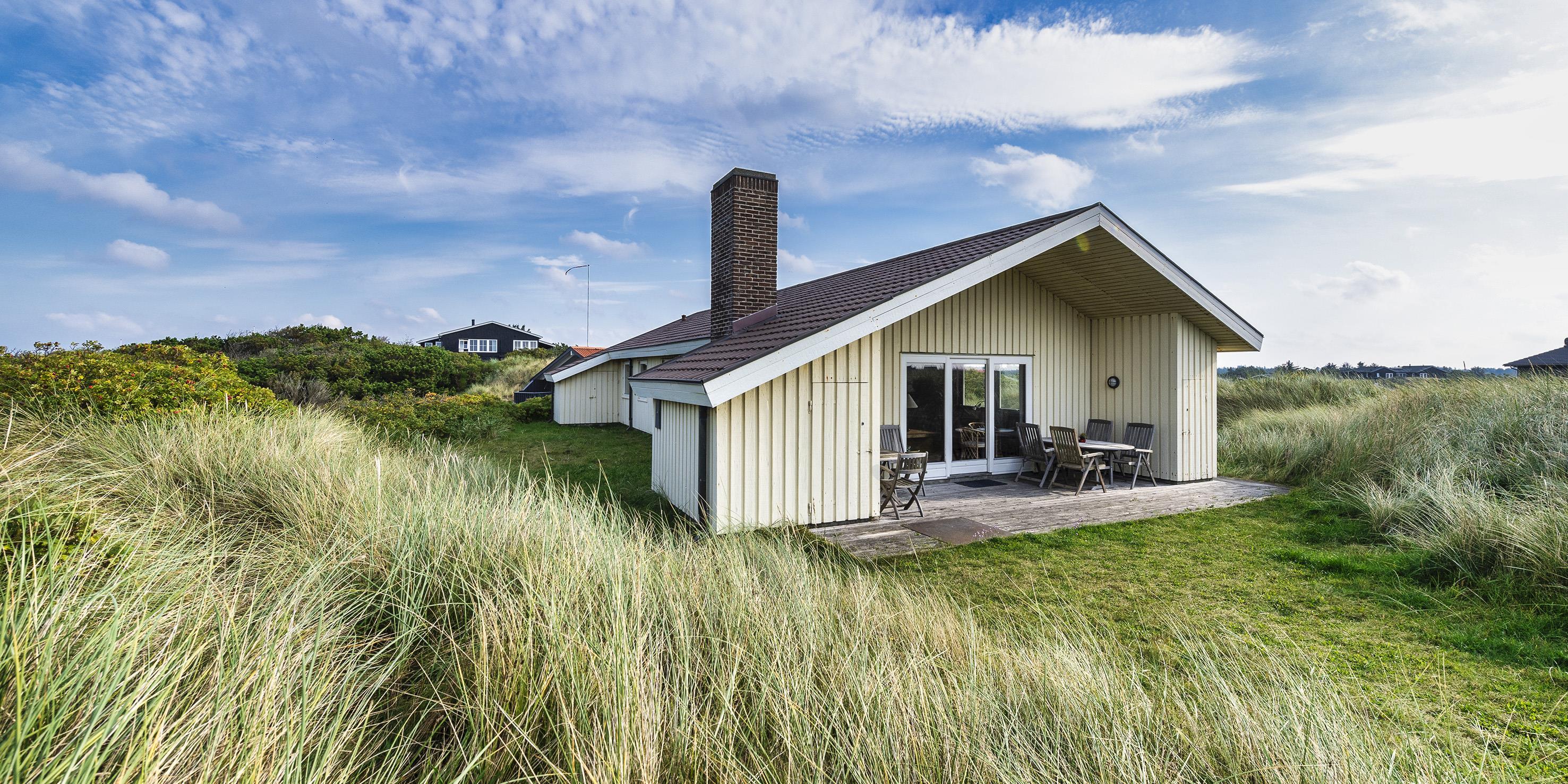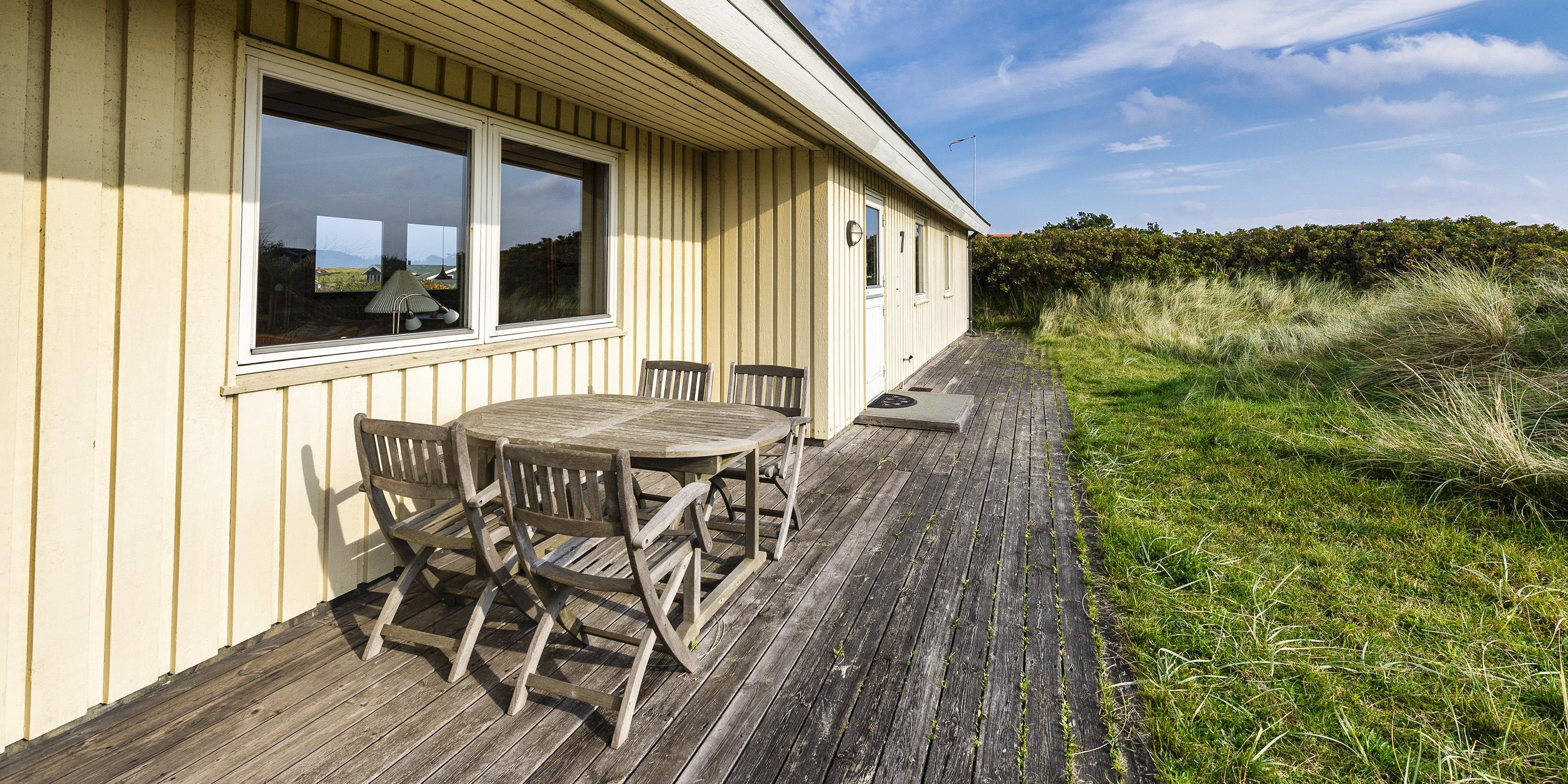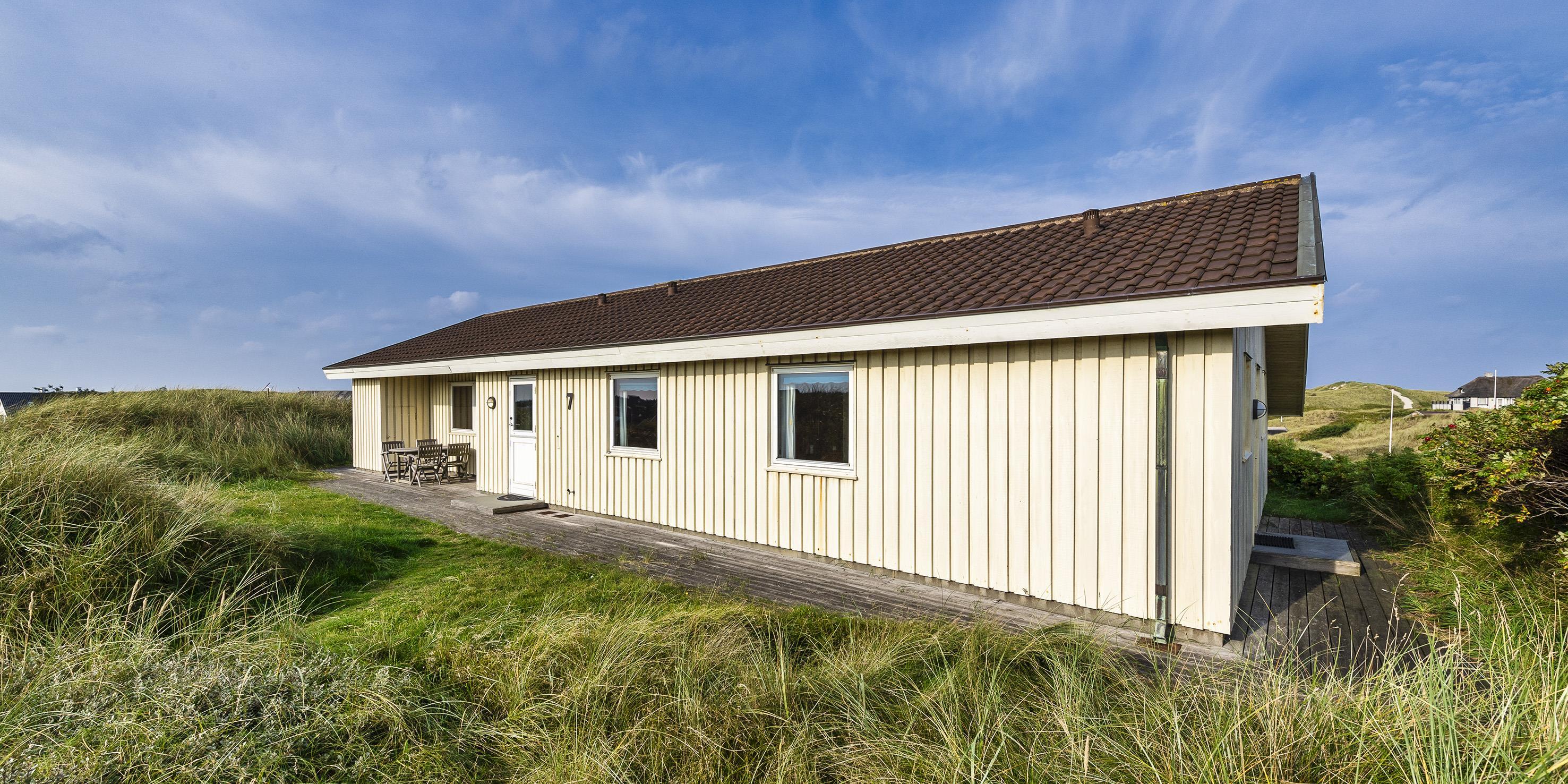 Hyggeligt sommerhus til 4 voksne og 4 børn, beliggende på en højtbeliggende klitgrund ca. 150 meter fra stranden med rolig beliggenhed samt kort gåafstand til midtbyen. Huset indeholder: indgang til huset foregår fra den nordlige gavlende, hvor man kommer ind i en rummelig entre med god garderobeplads. Herfra er der indgang til 1 badeværelse med bruser, vaskearrangement og toilet. Endvidere forefindes der et gæstetoilet med vaskearrangement. Fra entreen kommer man over i en fordelingsgang med 4 soveværelser: DS + DS + 2S + 2S - 2 master bedroom med hver 1 dobbeltseng og klædeskabe. 1 mindre soveværelse med 1 køjeseng (85 x 190 cm senge) og klædeskab. 1 soveværelse med 2 enkeltsenge (85 x 190 cm senge) og klædeskab. Dejligt stort køkken-alrum med en fantastisk udsigt over klitterne. Nyt køkkenet fremstår funktionsdygtigt og rummeligt med komfur med keramiskkogeplader og bageovn, emhætte og køleskab med interegeret fryseskab. Fra køkkenet er der udgang til østvendt træterrasse. Køkkenet er i åben forbindelse med stor spisestueafdeling med et stort spisebord med tilhørende stole og hjørnebænk og skøn udsigt over klitterne. Hyggelig og rummelig opholdsstue med brændeovn, fjernsyn med Stofa grundpakken. Trådløs internet (50/50). Fra den hyggeligt indrettede stue, er der udgang til en delvis overdækket træterrasse, hvor aften kan forlænges i det tidlige forår og efterår. Fra terrassen kan udsigten til havet nydes. Kombineret vaskemaskine og tørretumbler samt udvendigt. Til børnene er der et gyngestativ. 2 hunde tilladt!