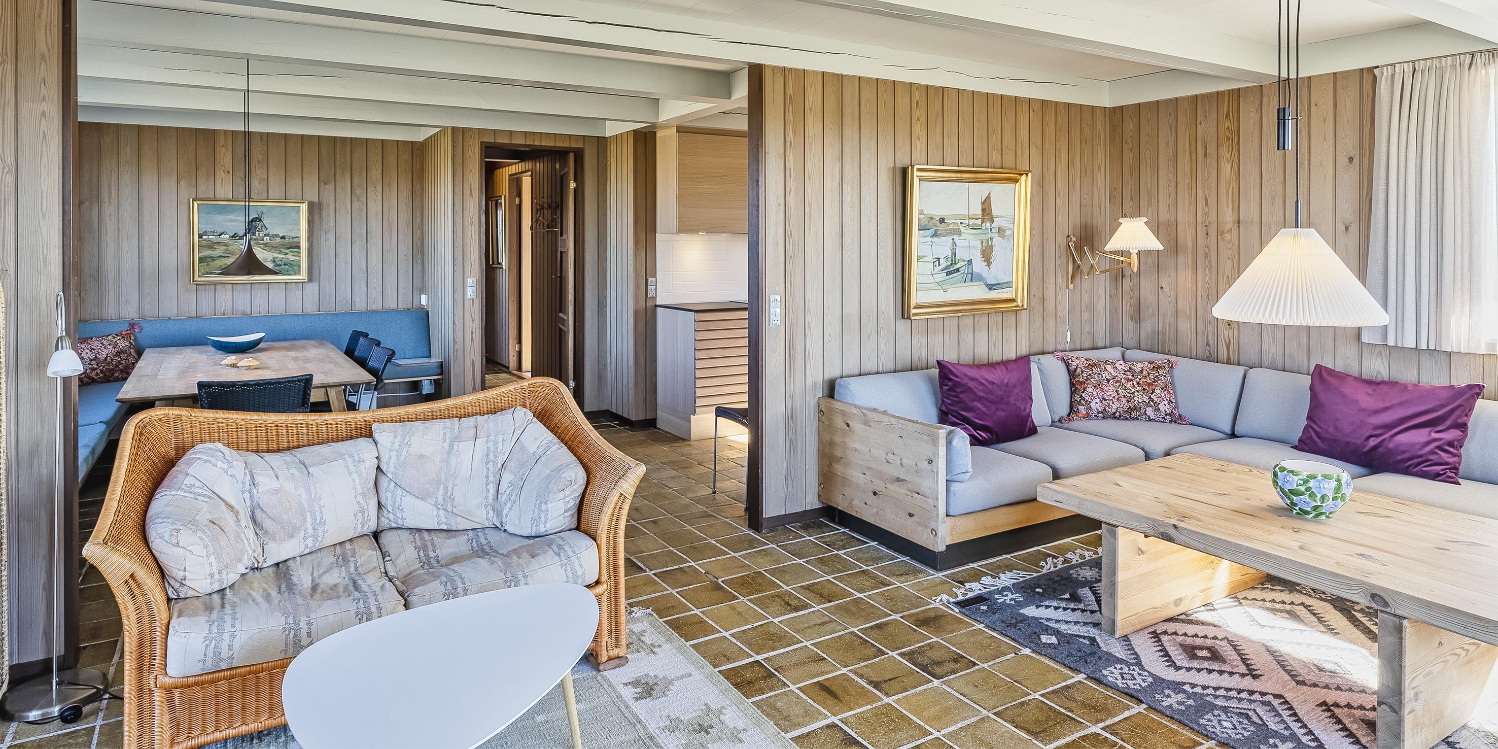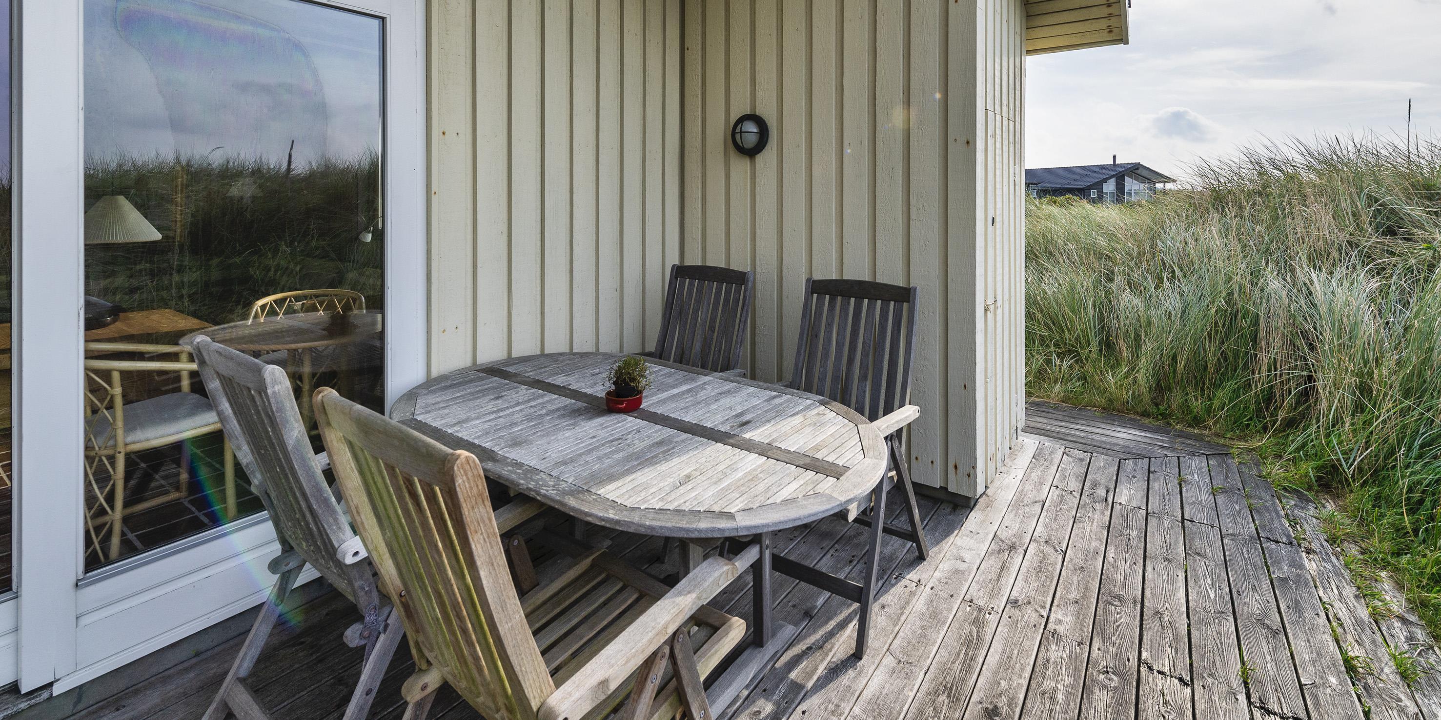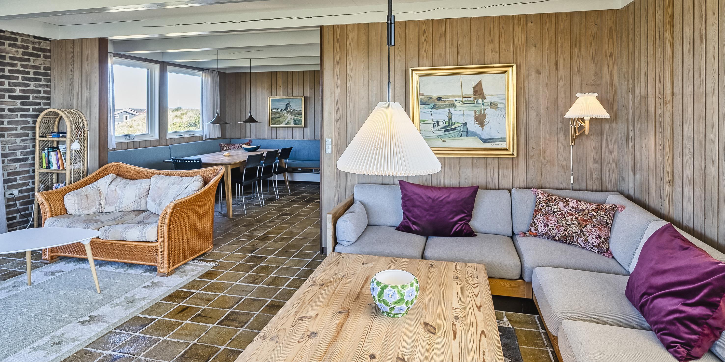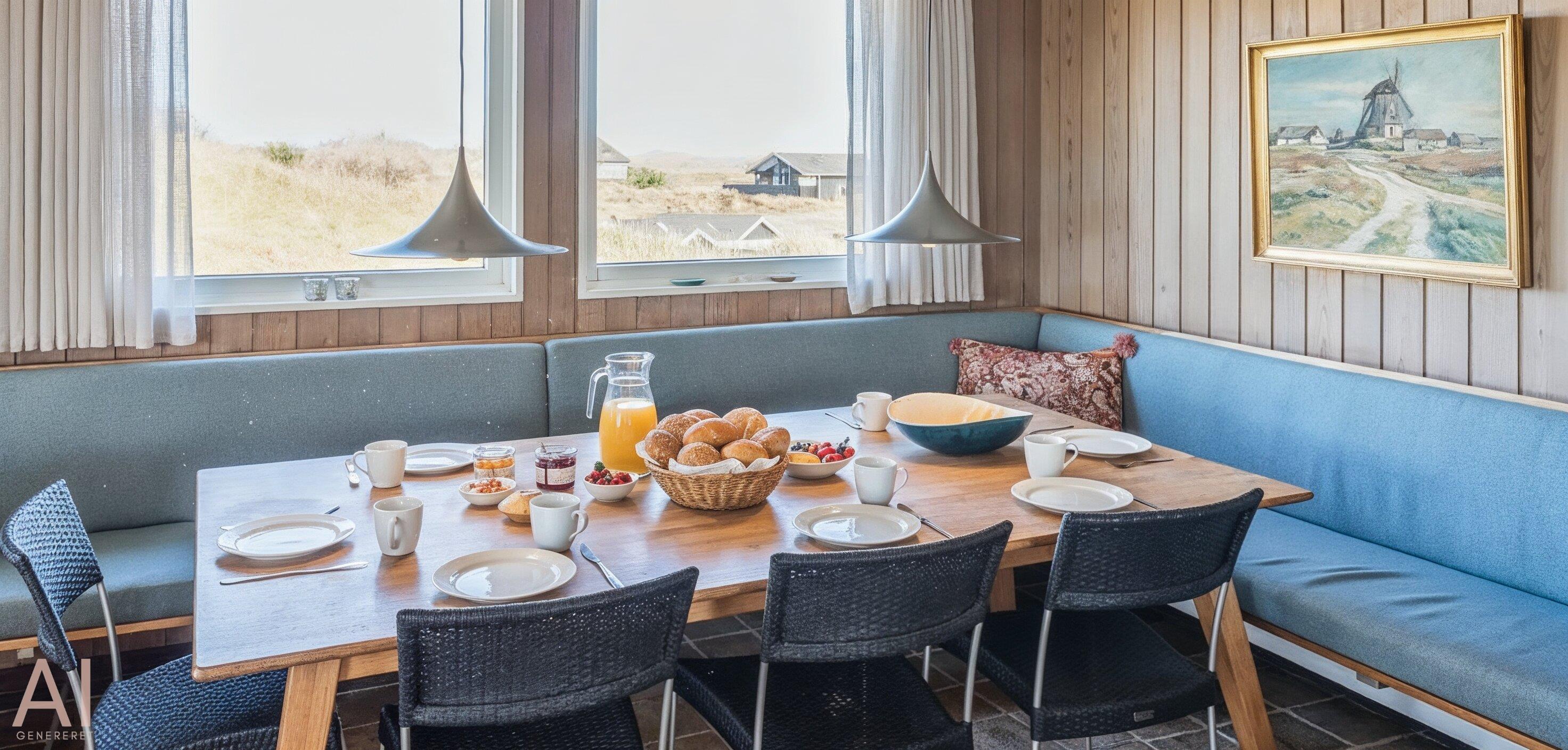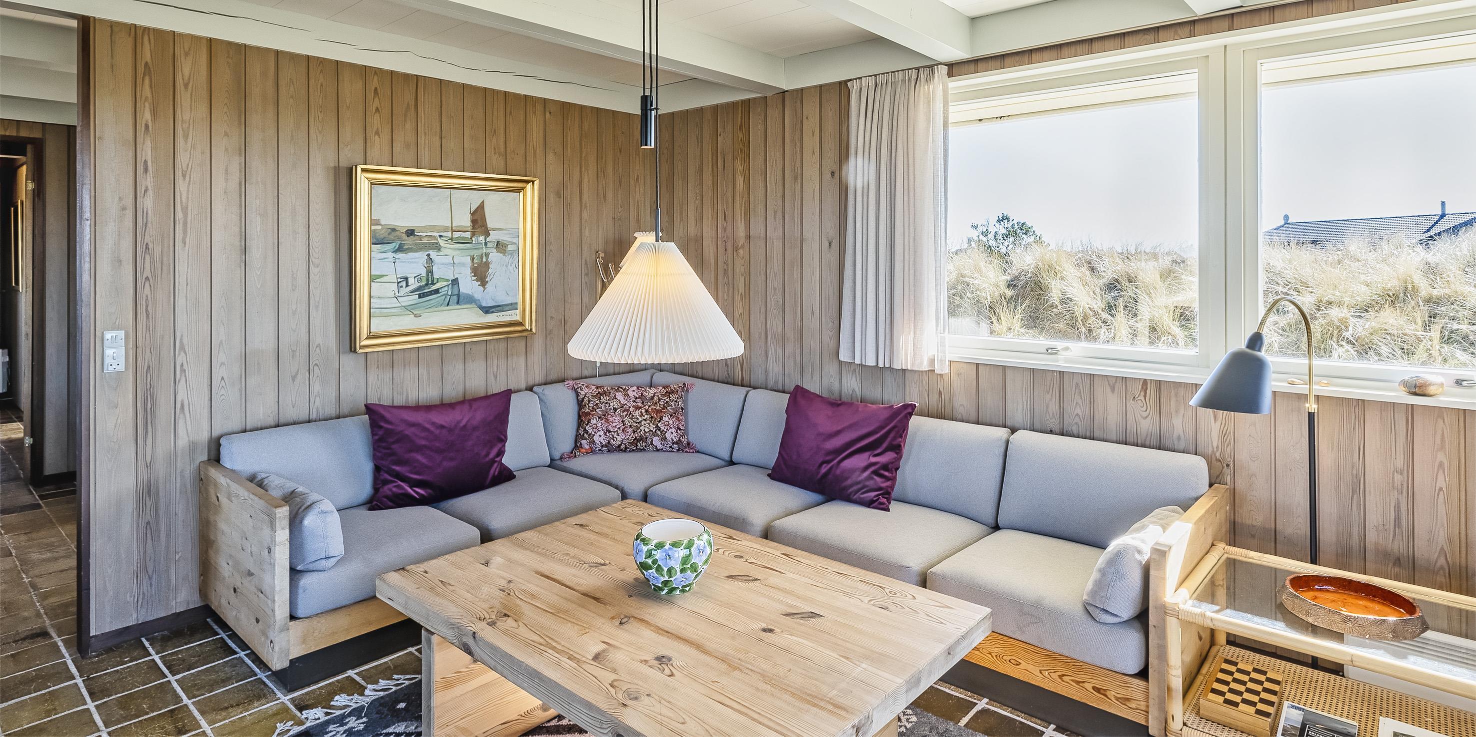 Hyggeligt sommerhus til 4 voksne og 4 børn, beliggende på en højtbeliggende klitgrund ca. 150 meter fra stranden med rolig beliggenhed samt kort gåafstand til midtbyen. Huset indeholder: indgang til huset foregår fra den nordlige gavlende, hvor man kommer ind i en rummelig entre med god garderobeplads. Herfra er der indgang til 1 badeværelse med bruser, vaskearrangement og toilet. Endvidere forefindes der et gæstetoilet med vaskearrangement. Fra entreen kommer man over i en fordelingsgang med 4 soveværelser: DS + DS + 2S + 2S - 2 master bedroom med hver 1 dobbeltseng og klædeskabe. 1 mindre soveværelse med 1 køjeseng (85 x 190 cm senge) og klædeskab. 1 soveværelse med 2 enkeltsenge (85 x 190 cm senge) og klædeskab. Dejligt stort køkken-alrum med en fantastisk udsigt over klitterne. Nyt køkkenet fremstår funktionsdygtigt og rummeligt med komfur med keramiskkogeplader og bageovn, emhætte og køleskab med interegeret fryseskab. Fra køkkenet er der udgang til østvendt træterrasse. Køkkenet er i åben forbindelse med stor spisestueafdeling med et stort spisebord med tilhørende stole og hjørnebænk og skøn udsigt over klitterne. Hyggelig og rummelig opholdsstue med brændeovn, fjernsyn med Stofa grundpakken. Trådløs internet (50/50). Fra den hyggeligt indrettede stue, er der udgang til en delvis overdækket træterrasse, hvor aften kan forlænges i det tidlige forår og efterår. Fra terrassen kan udsigten til havet nydes. Kombineret vaskemaskine og tørretumbler samt udvendigt. Til børnene er der et gyngestativ. 2 hunde tilladt!