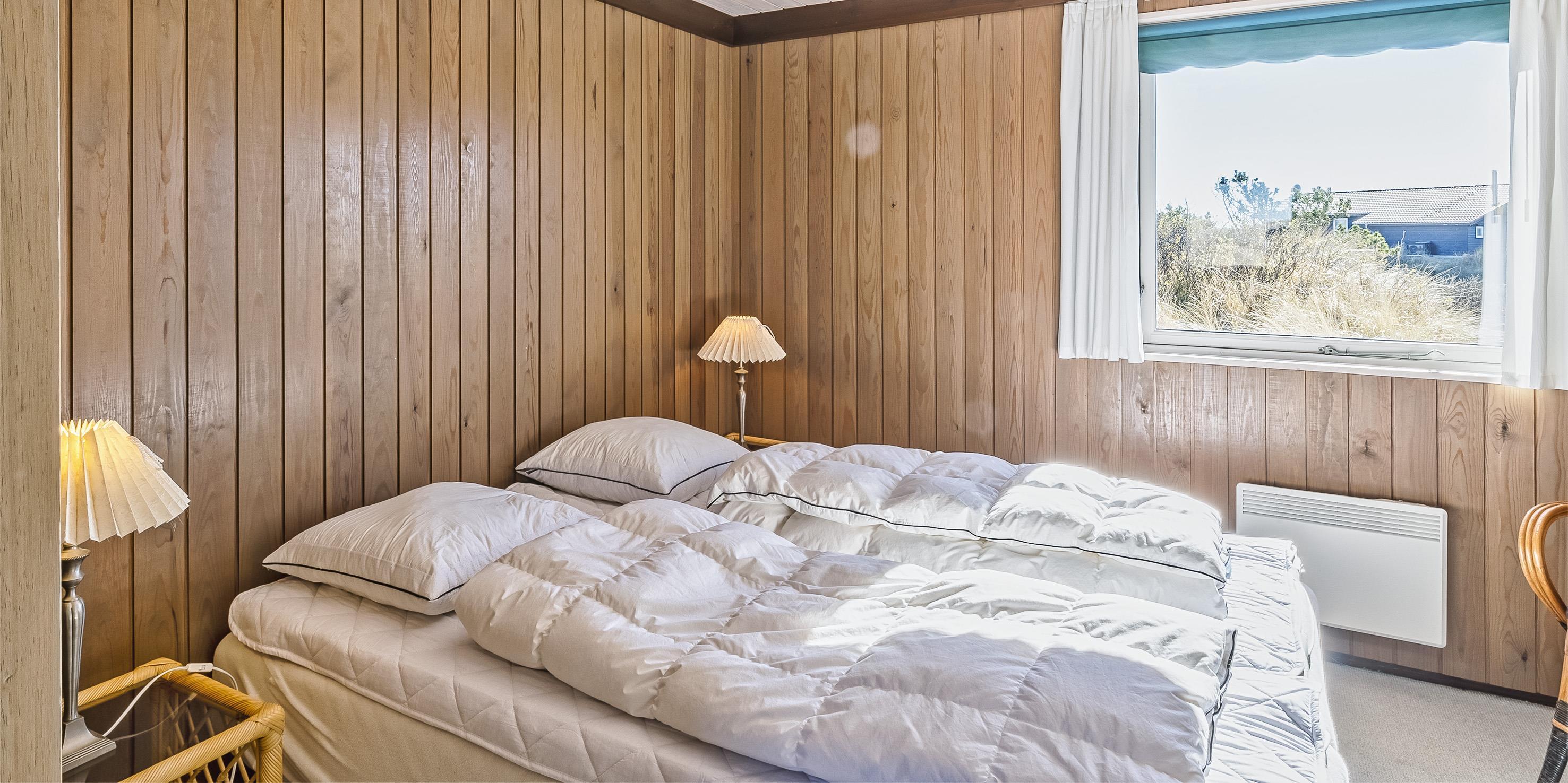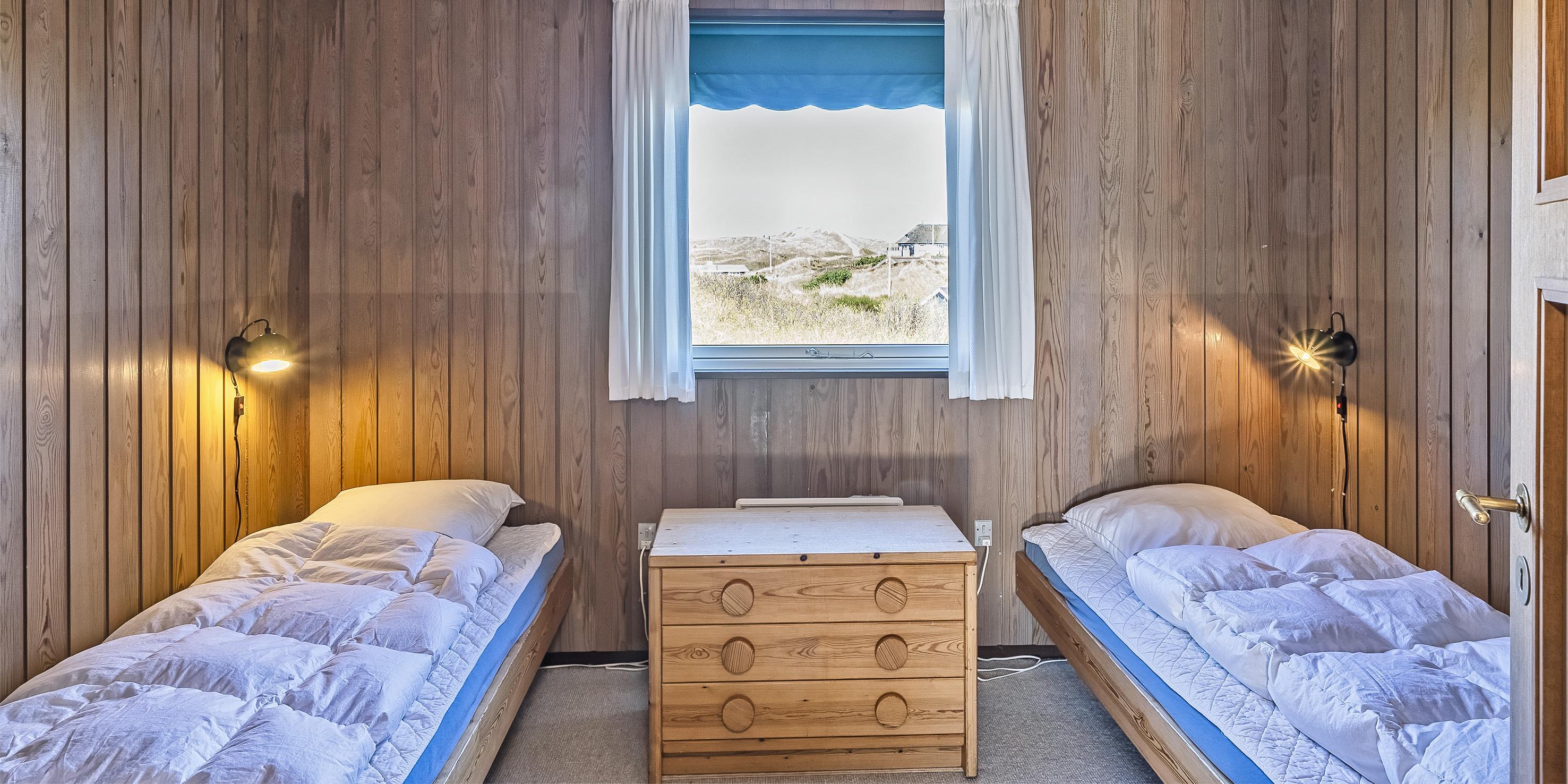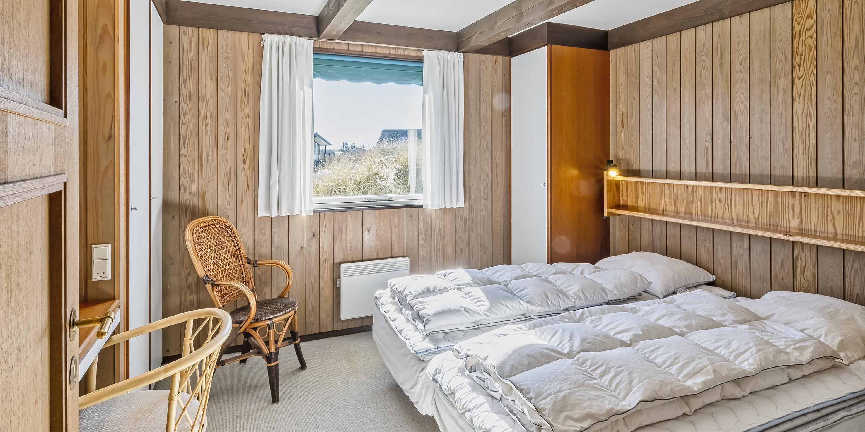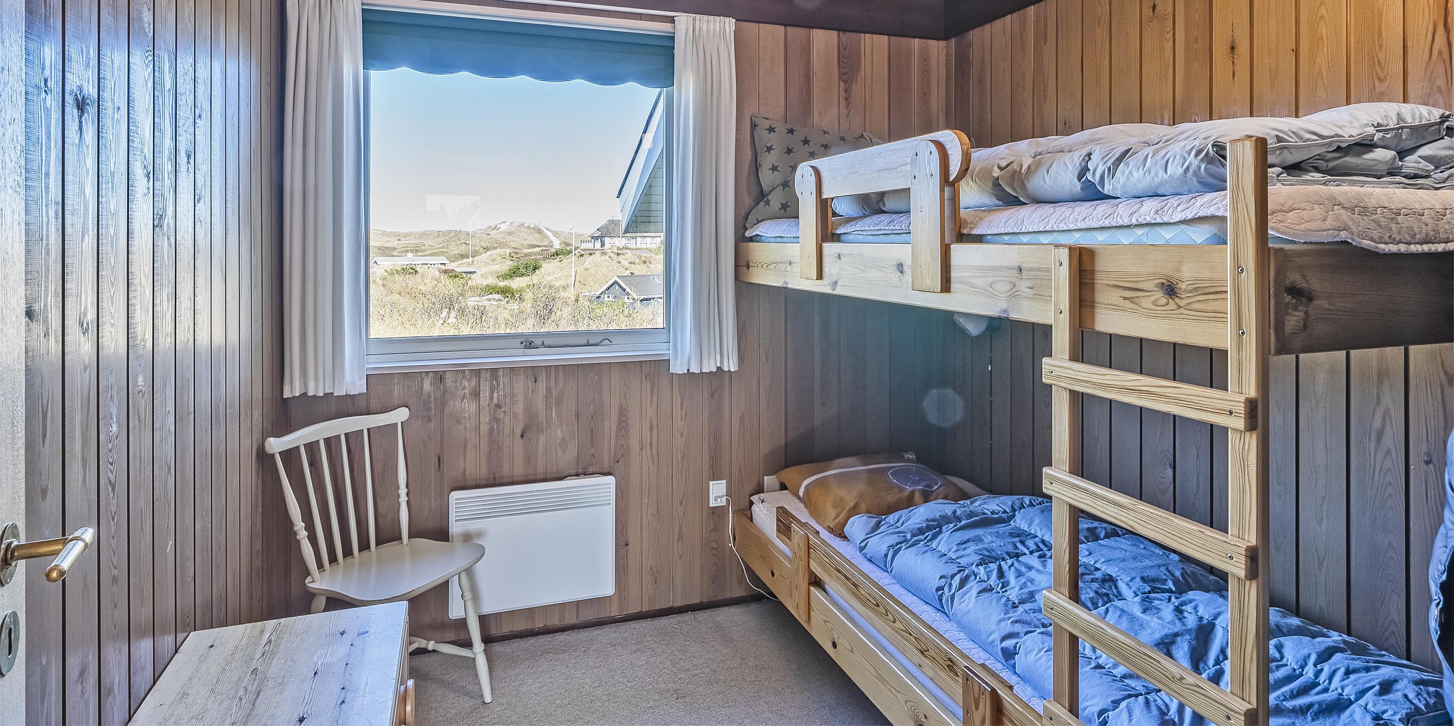 4 soveværelser. 2 med dobbeltseng 180x200 cm. 1 med 2 enkeltsenge (á 90x200 cm). 1 med køjeseng.