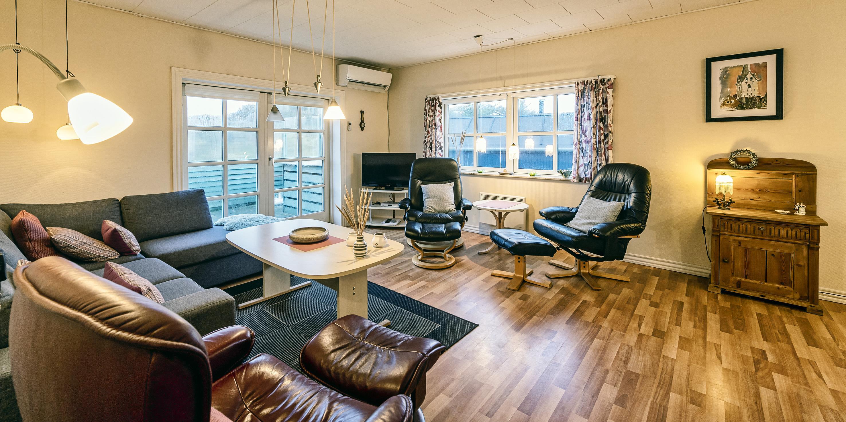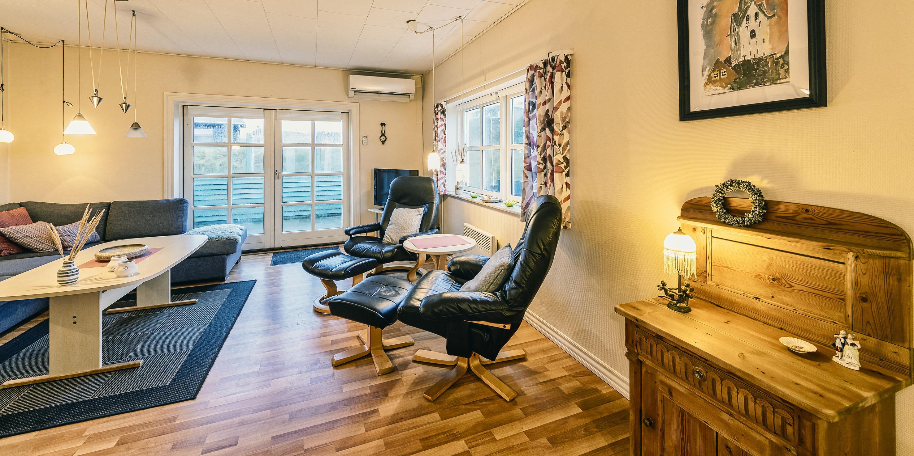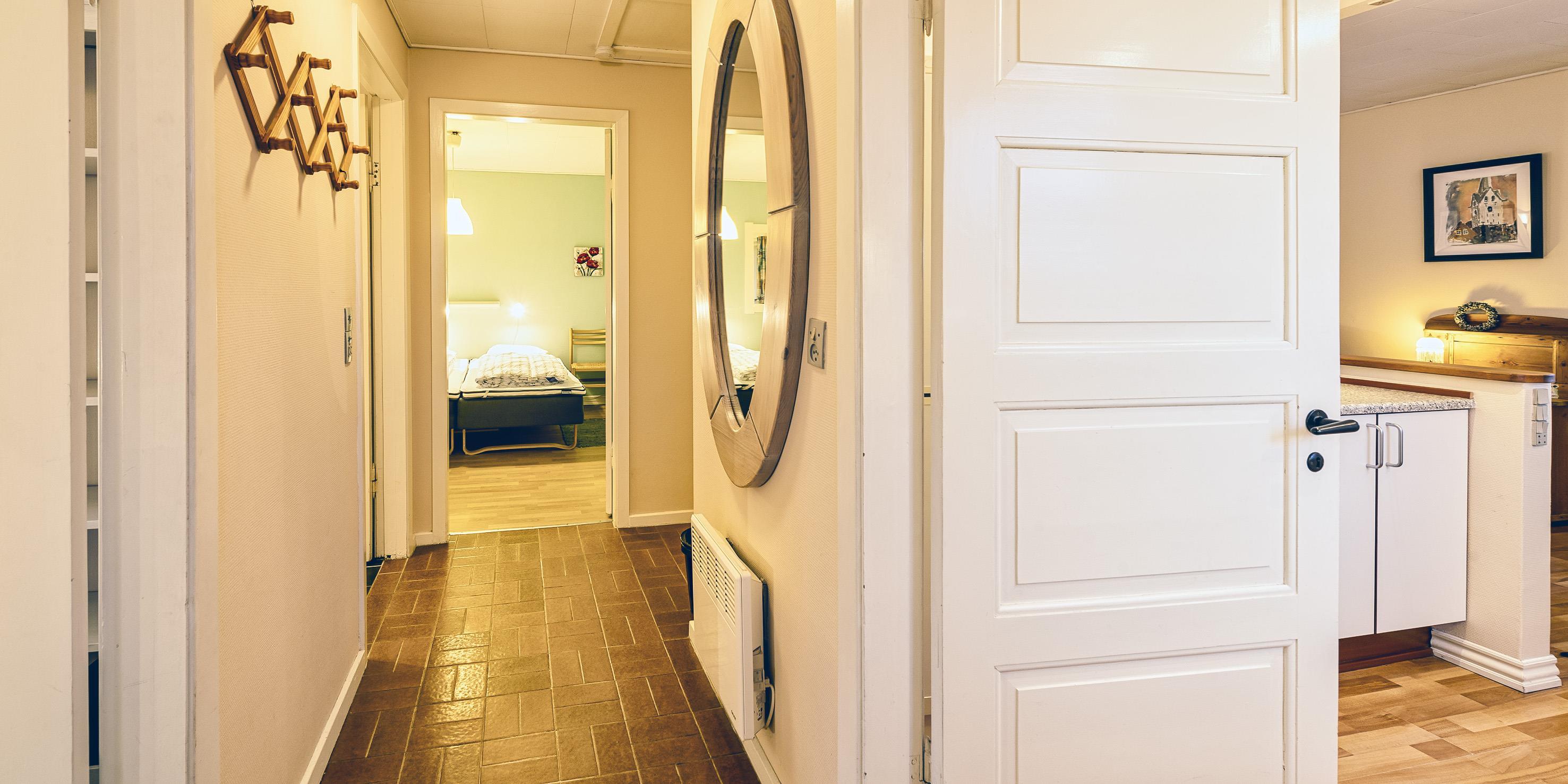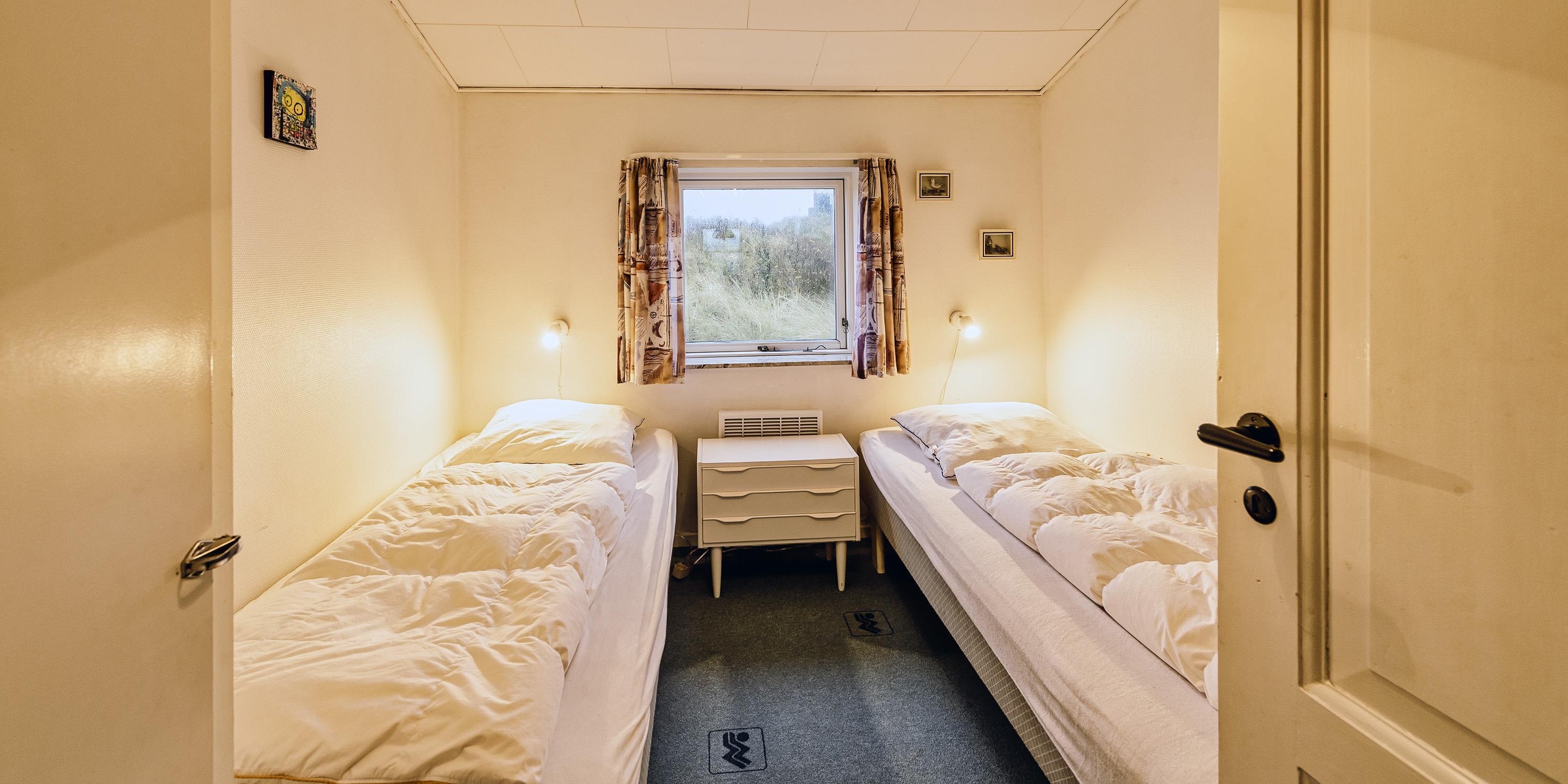 2 soveværelser, 1 med dobbeltseng 180x200 cm. 1 med 2 enkeltsenge (á 90x200 cm).