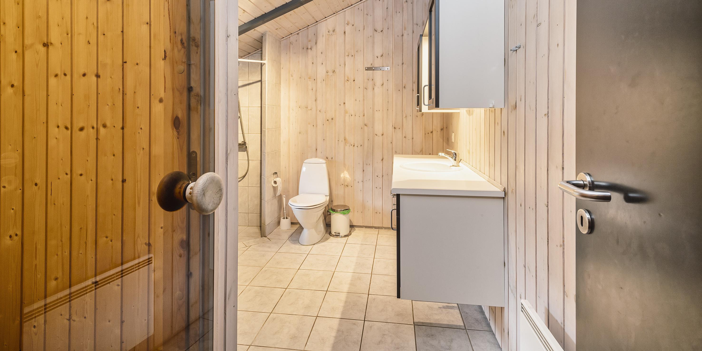 Bad med toilet, bruser og vask