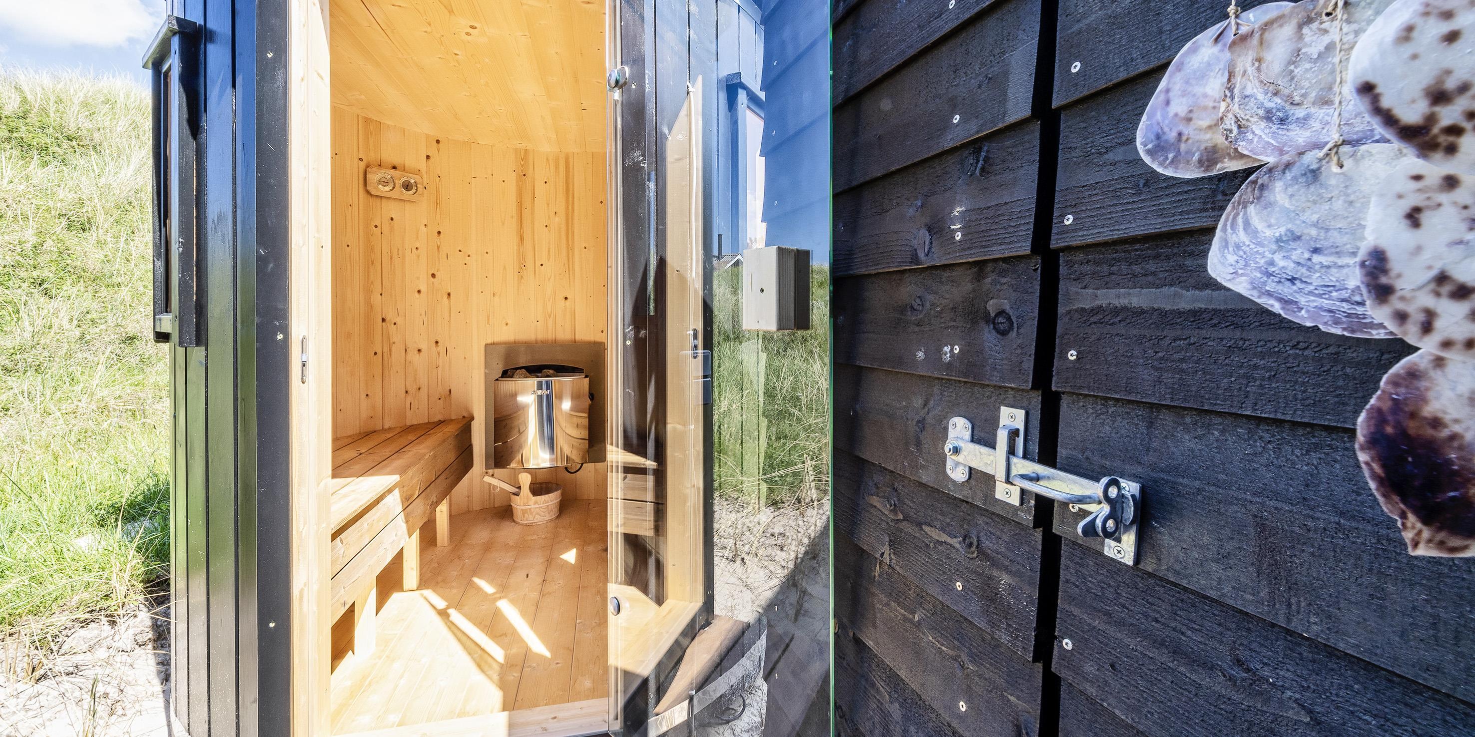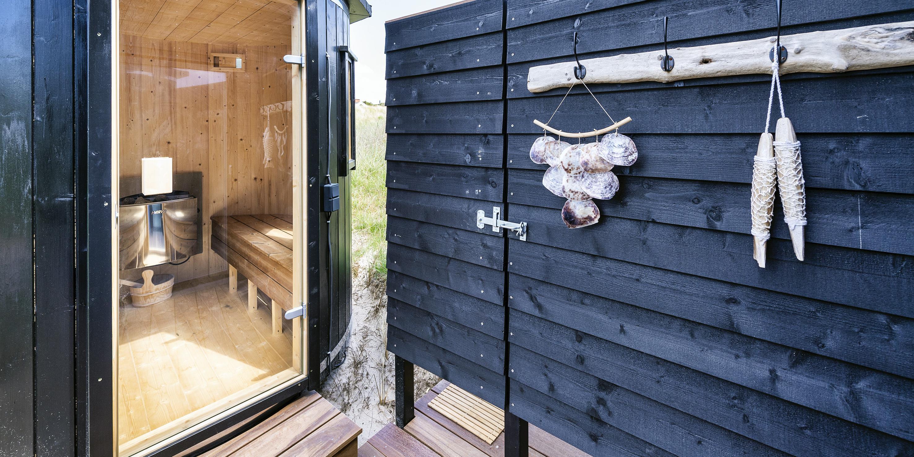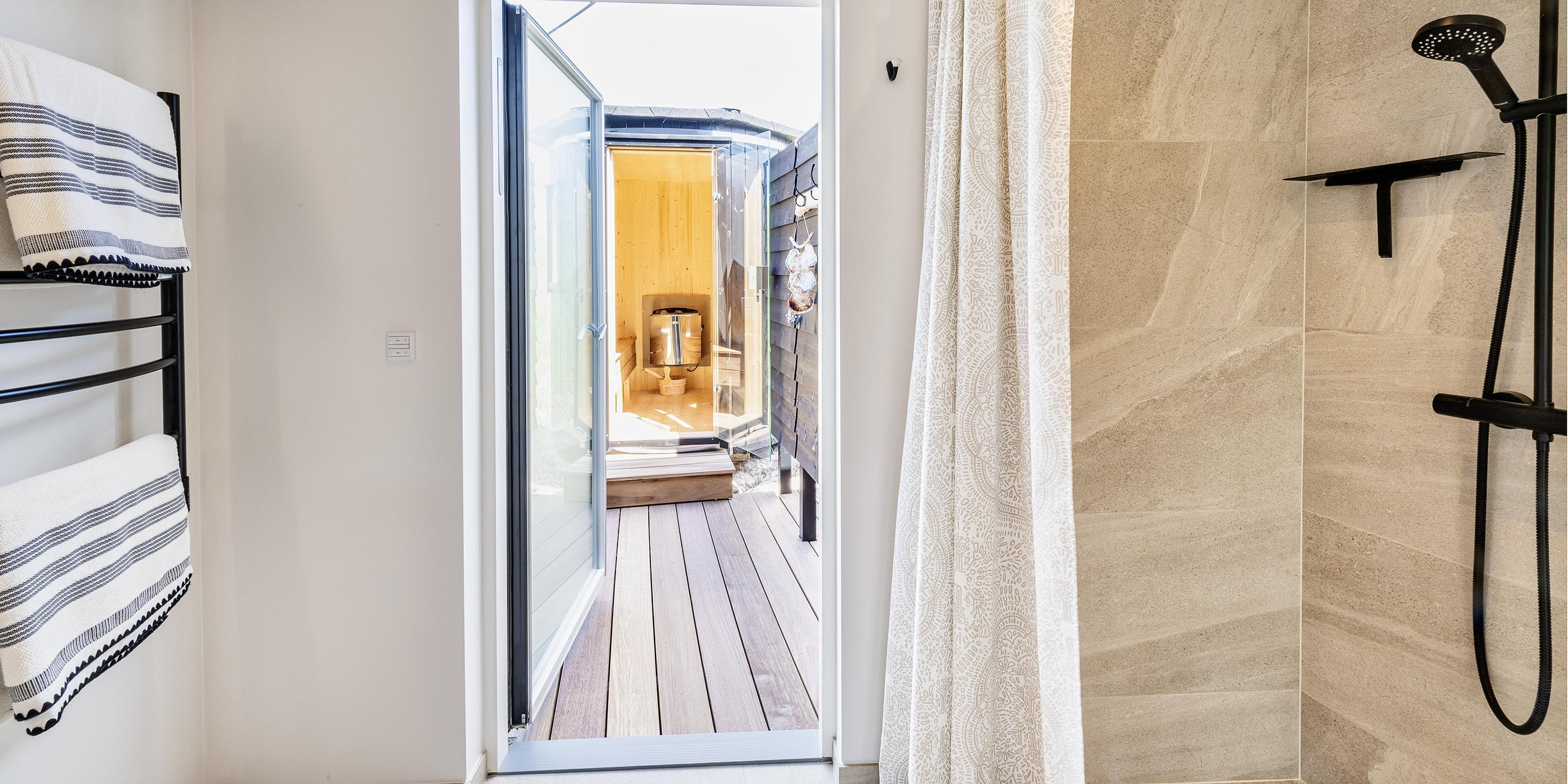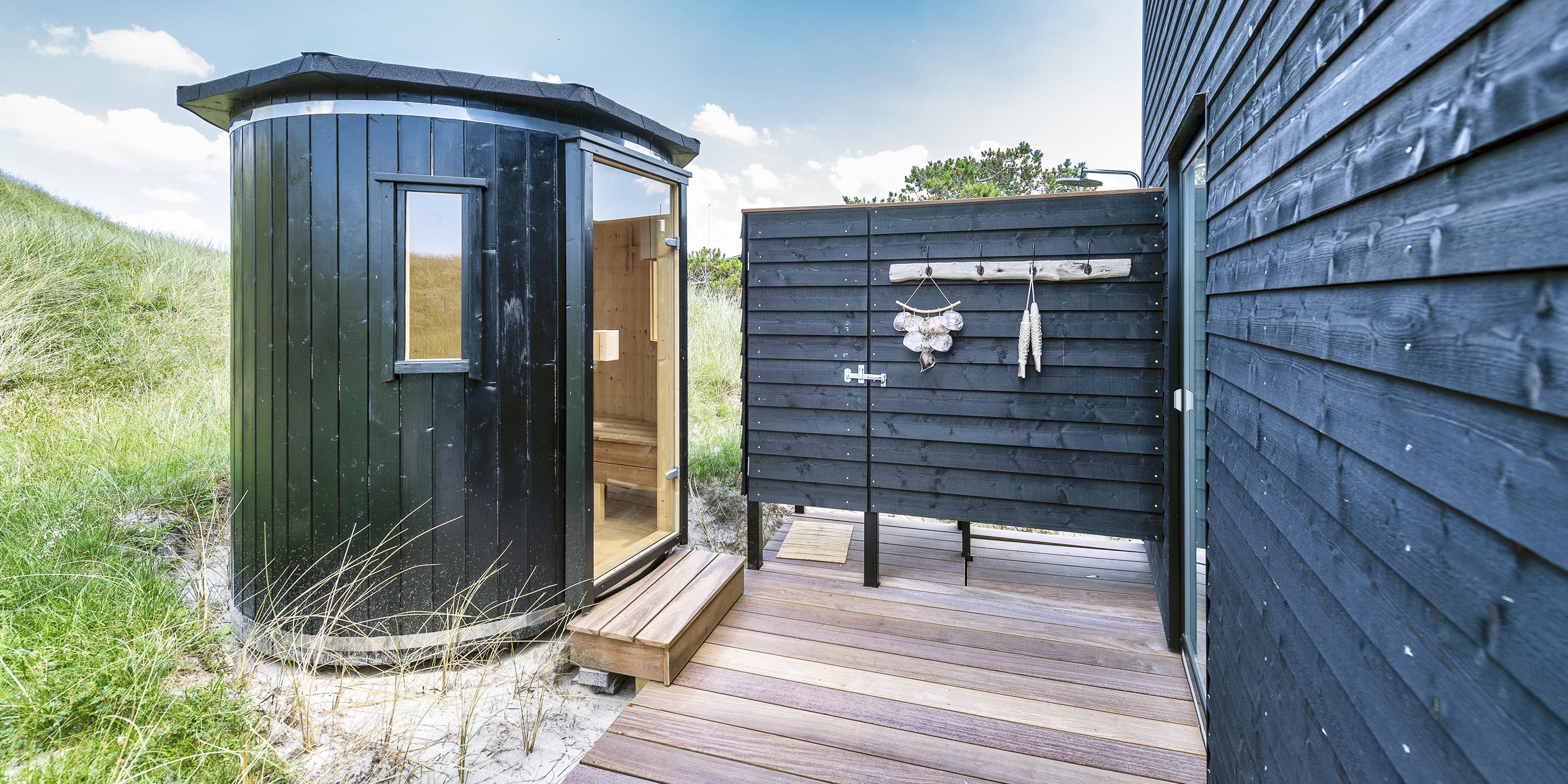 Udendørs spa, sauna og bruser.