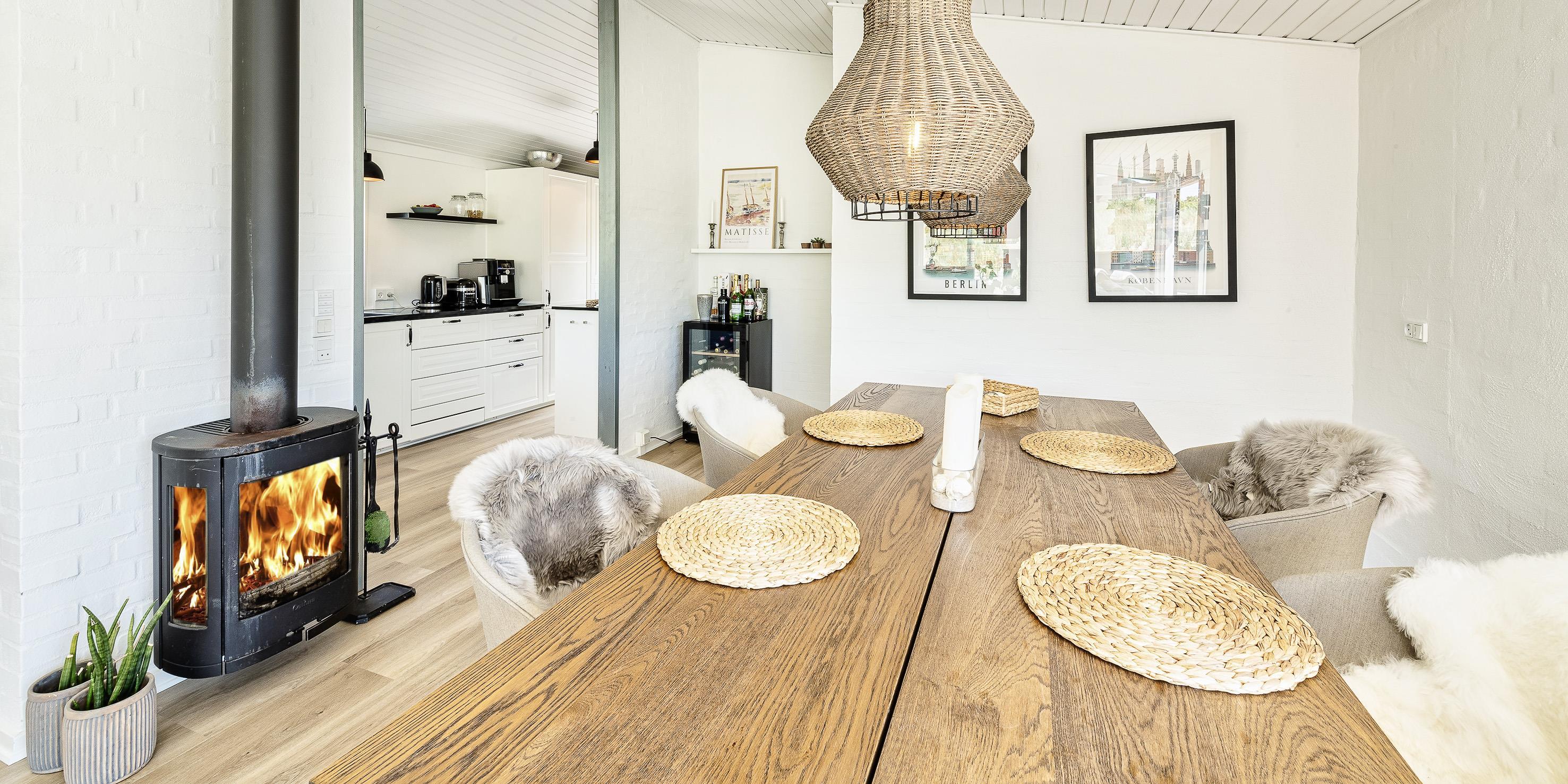 Huset opvarmes med gulvvarme samt der er en varmepumpe i stuen. Der er skydedøre fra stuen ud til en stor lukket terrasse med nedbygget vildmarksbad. Husdyr og rygning er ikke tilladt. Vand inkl. i lejen.