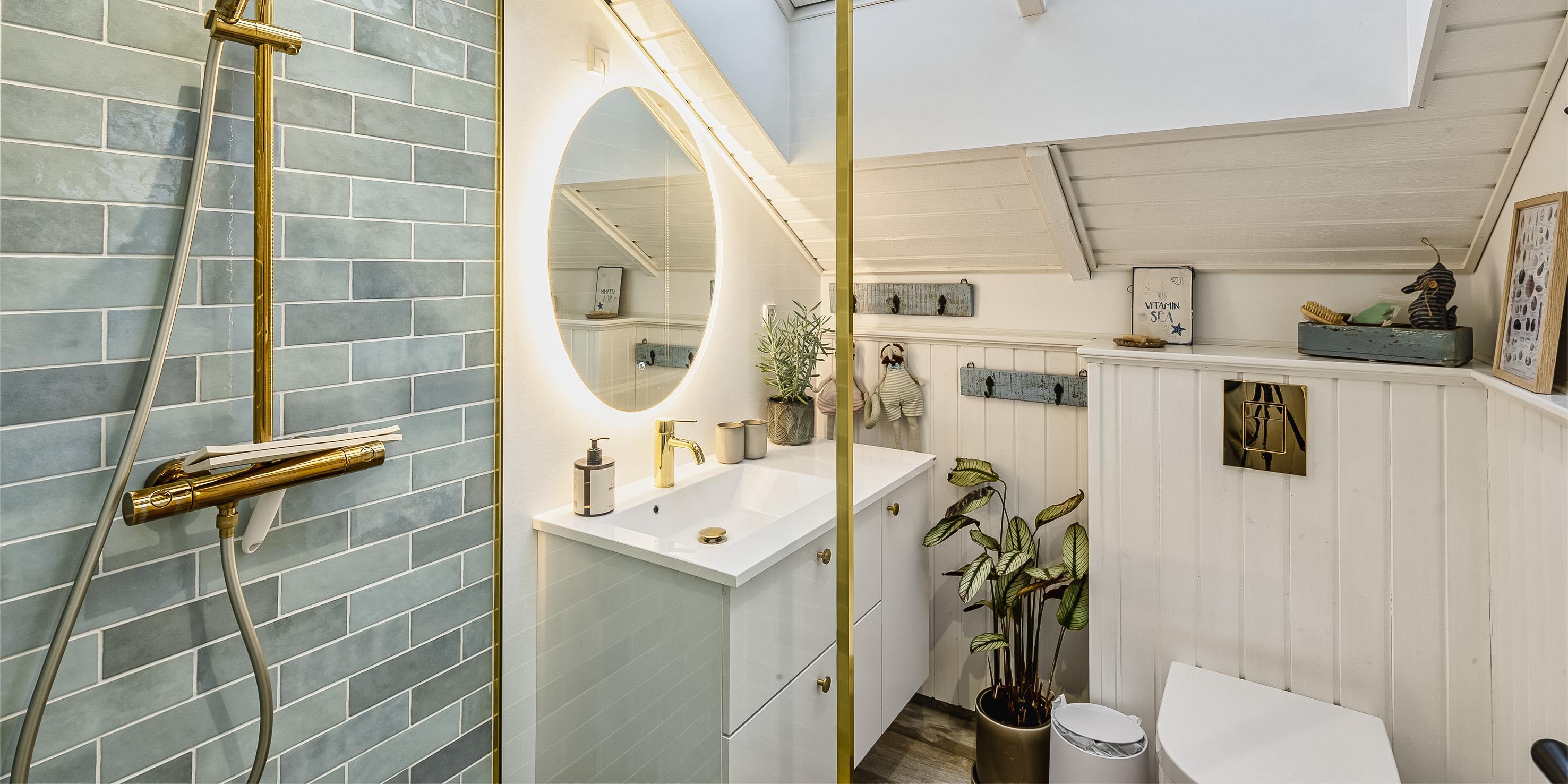 Bad med toilet, bruser og vask