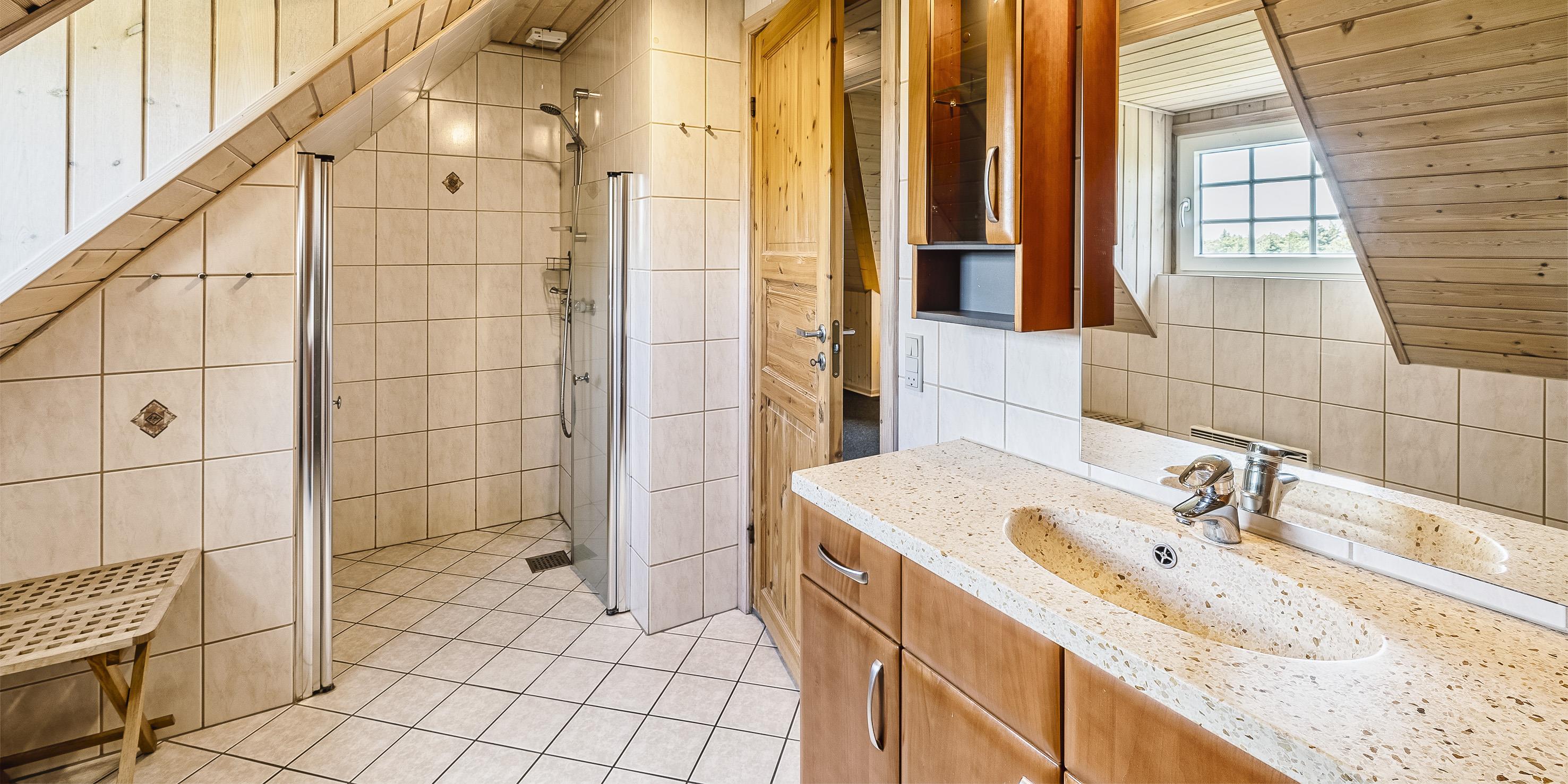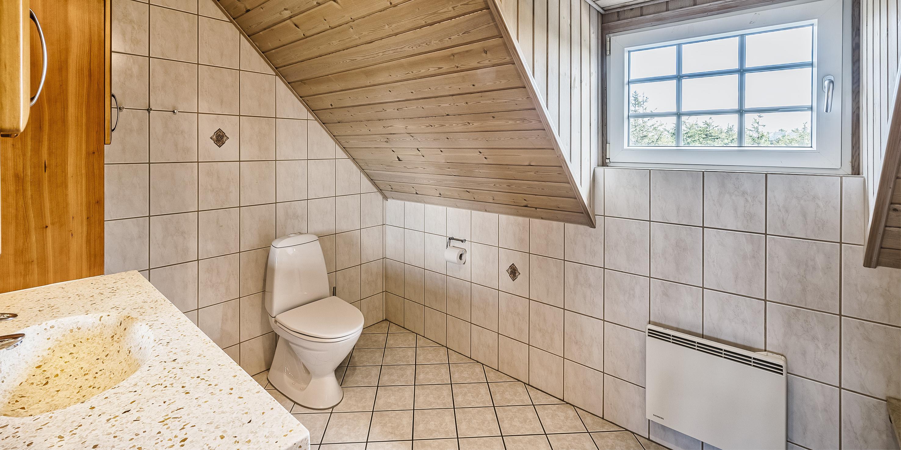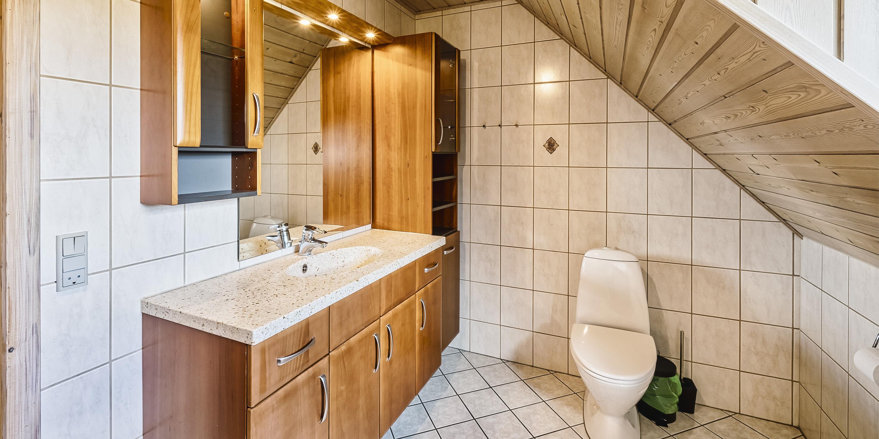 Bad med toilet, bruser og vask