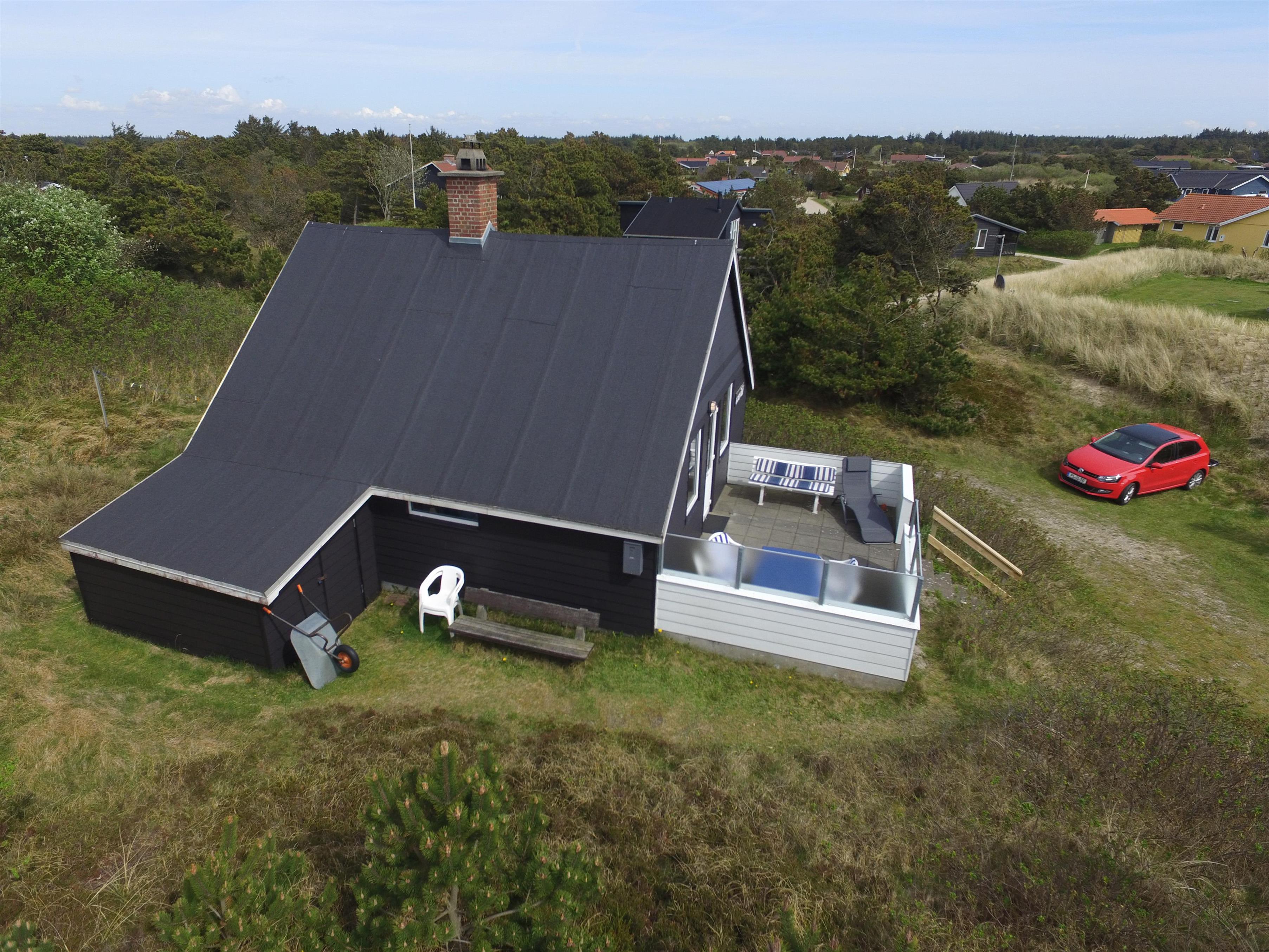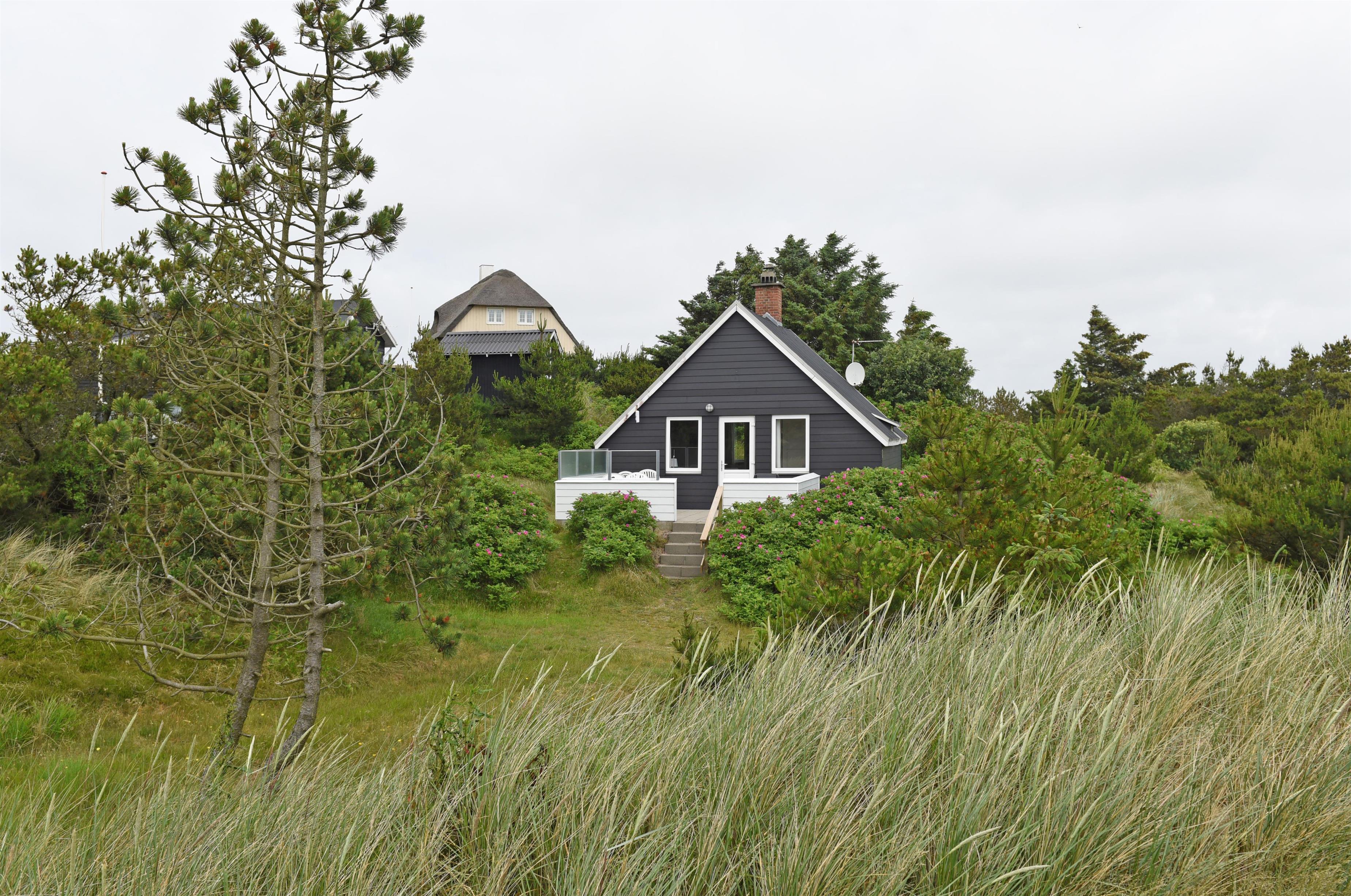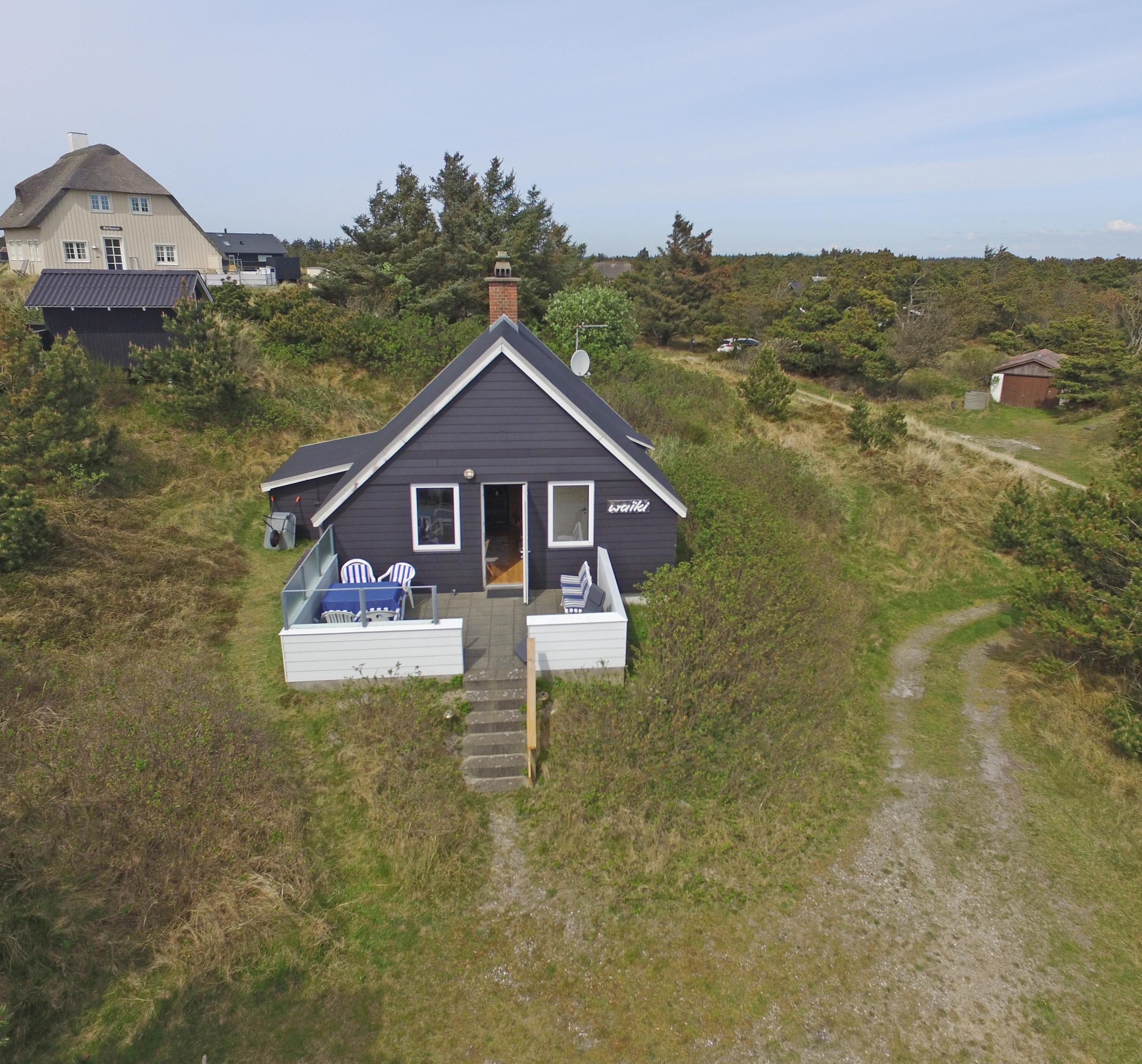 Charmerende Vejers sommerhus til 3 personer, beliggende på lukket klitgrund for enden af en blind vej i rolige omgivelser, ca. 450 meter fra stranden. Huset indeholder: Charmerende opholdsstue med brændeovn, fjernsyn med danske kanaler (DR programmer) og parabol.Radio og CD-afspiller. Trådløs internet. Seperat køkken med komfur med keramiske kogeplader, mikroovn og køleskab med lille skabsfryser. Lille kælder med viktualierum. Fra køkkent kommer man ind på badeværelset, der fremstår med åben bruseniche, håndvask, wc og åbne hylder for henstilling af toiletsager. Huset har 2 soveværelser: DS + 1S. Fra stuen træder man direkte ud på en hyggelig terrasse med gode havemøbler. Fra grunden er der en trappe på 7 trin op til terrassen og huset. Der er kun tilladt én lille hund (30 cm) Rygning er ikke tilladt. Byggeår 1953, delvis renoveret i 2006.