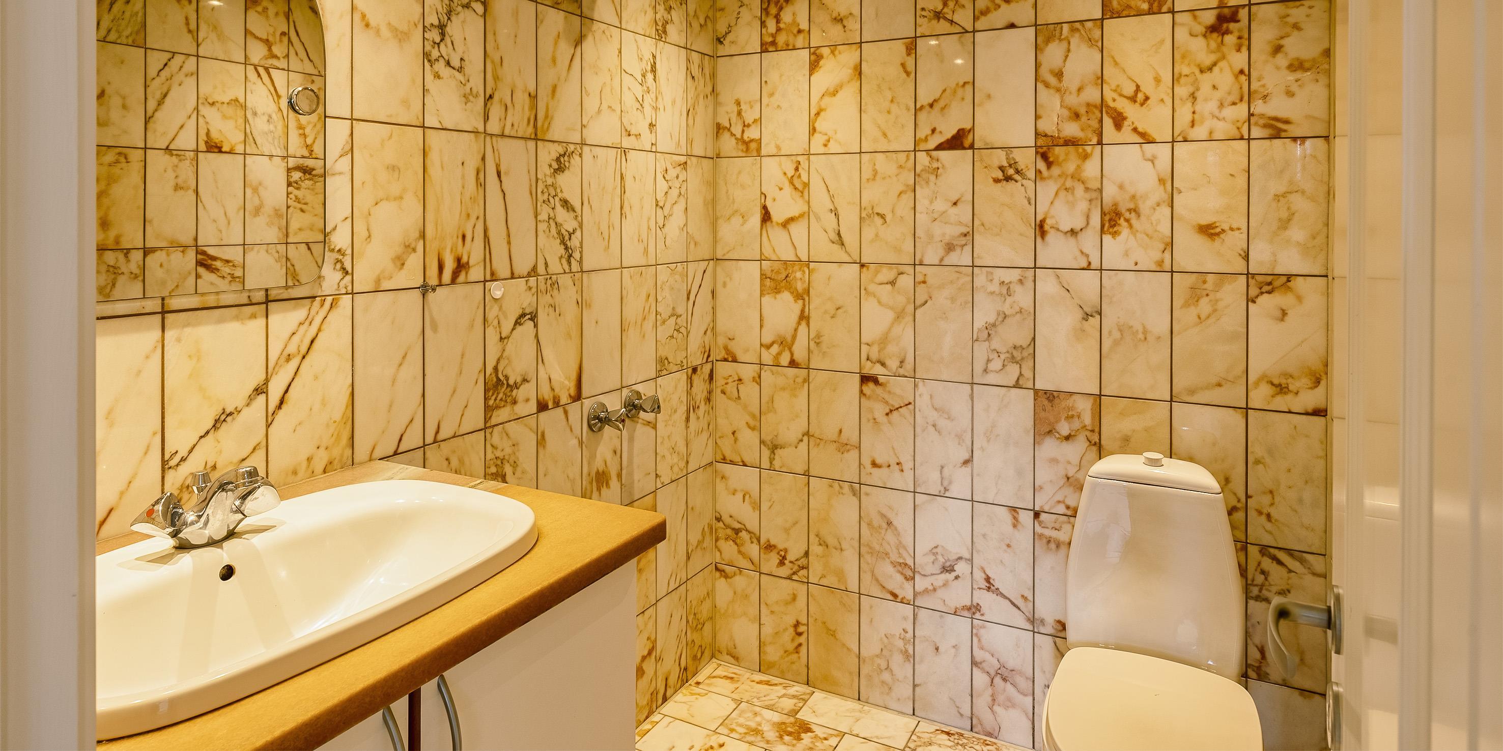 Bad med toilet, bruser og vask