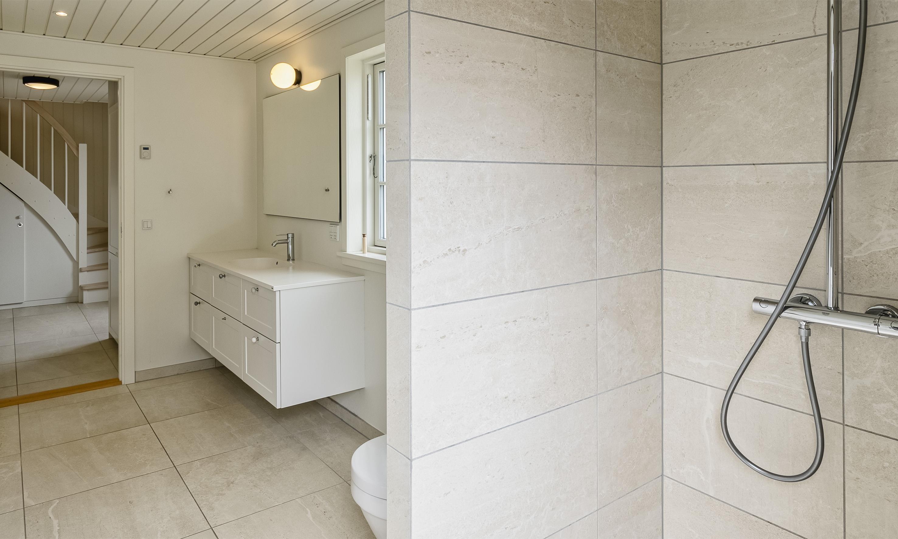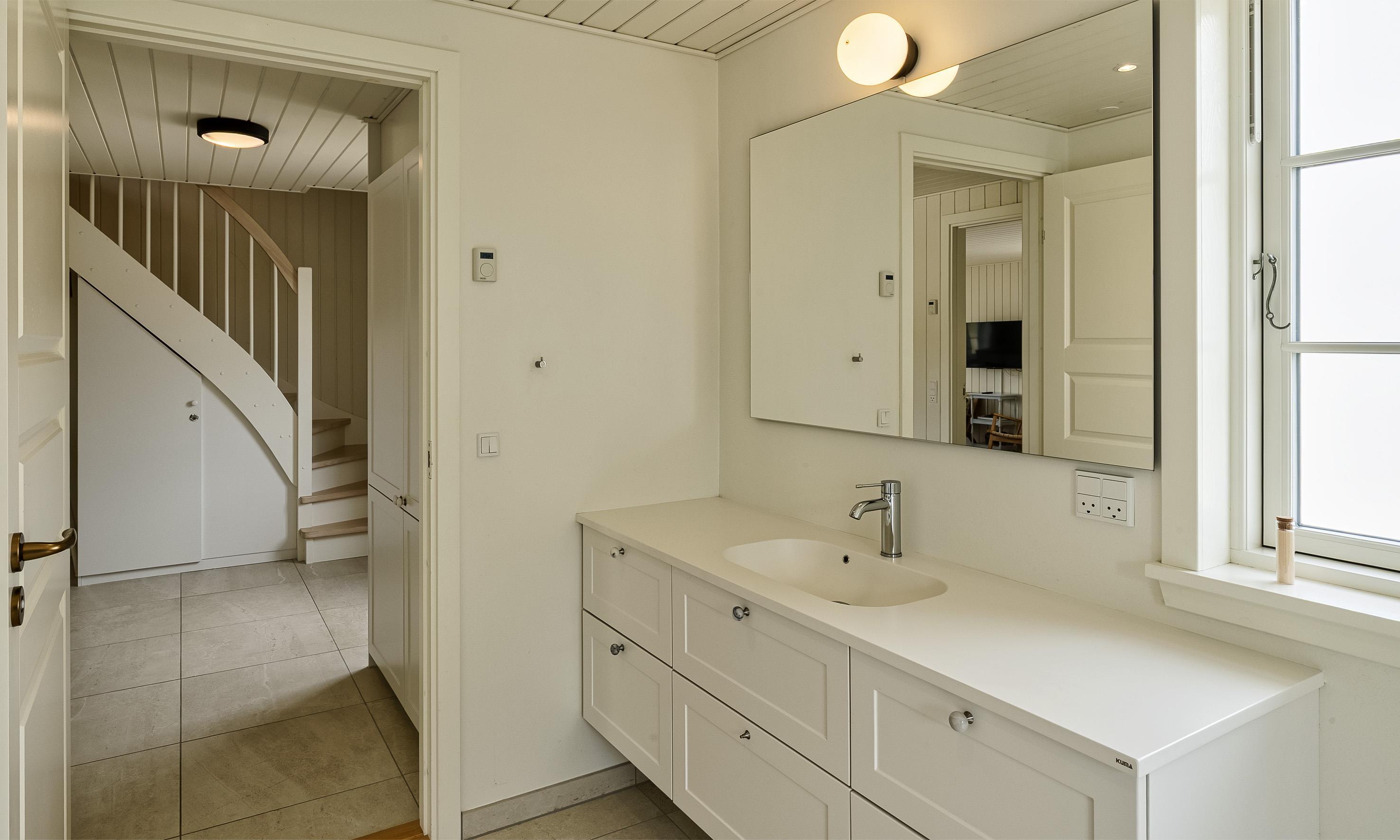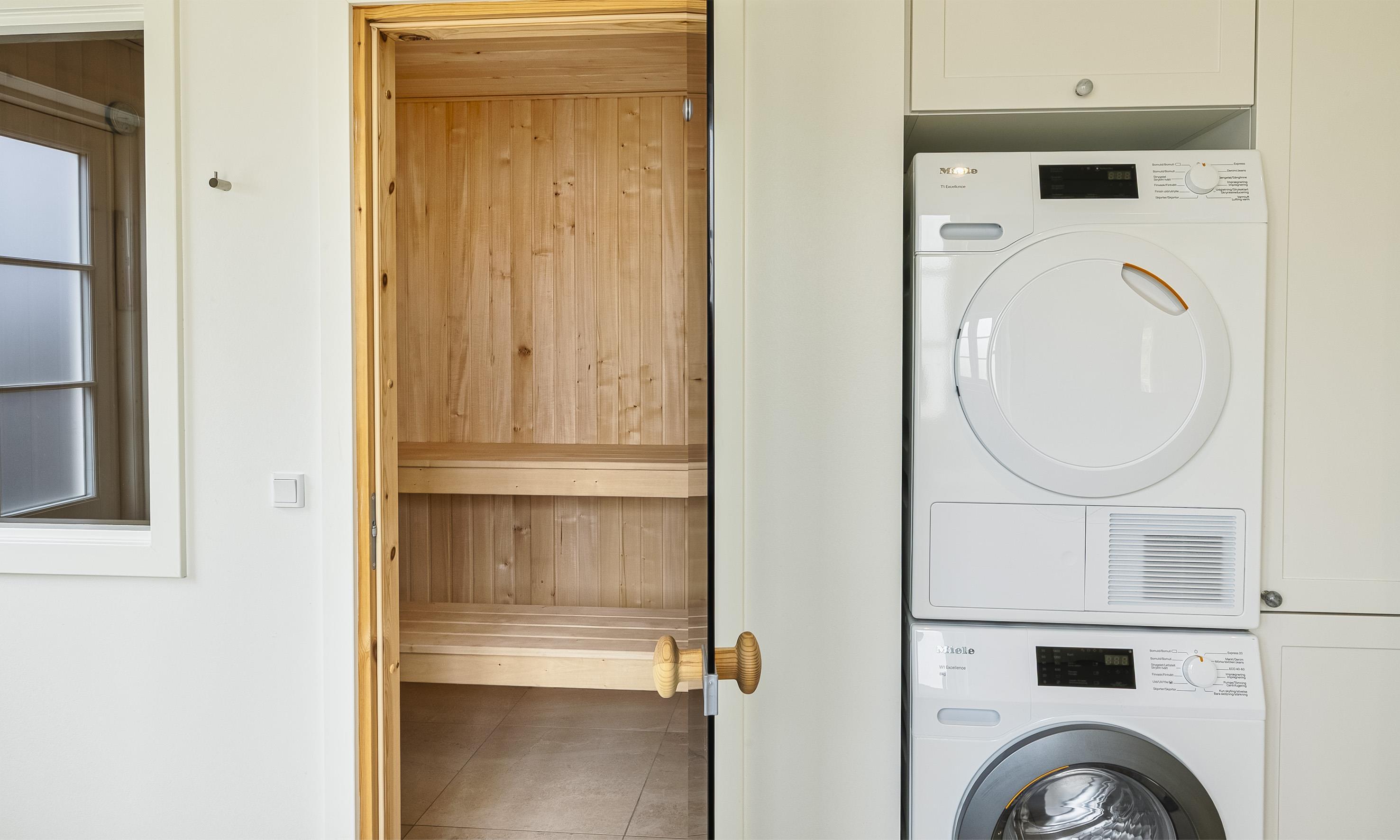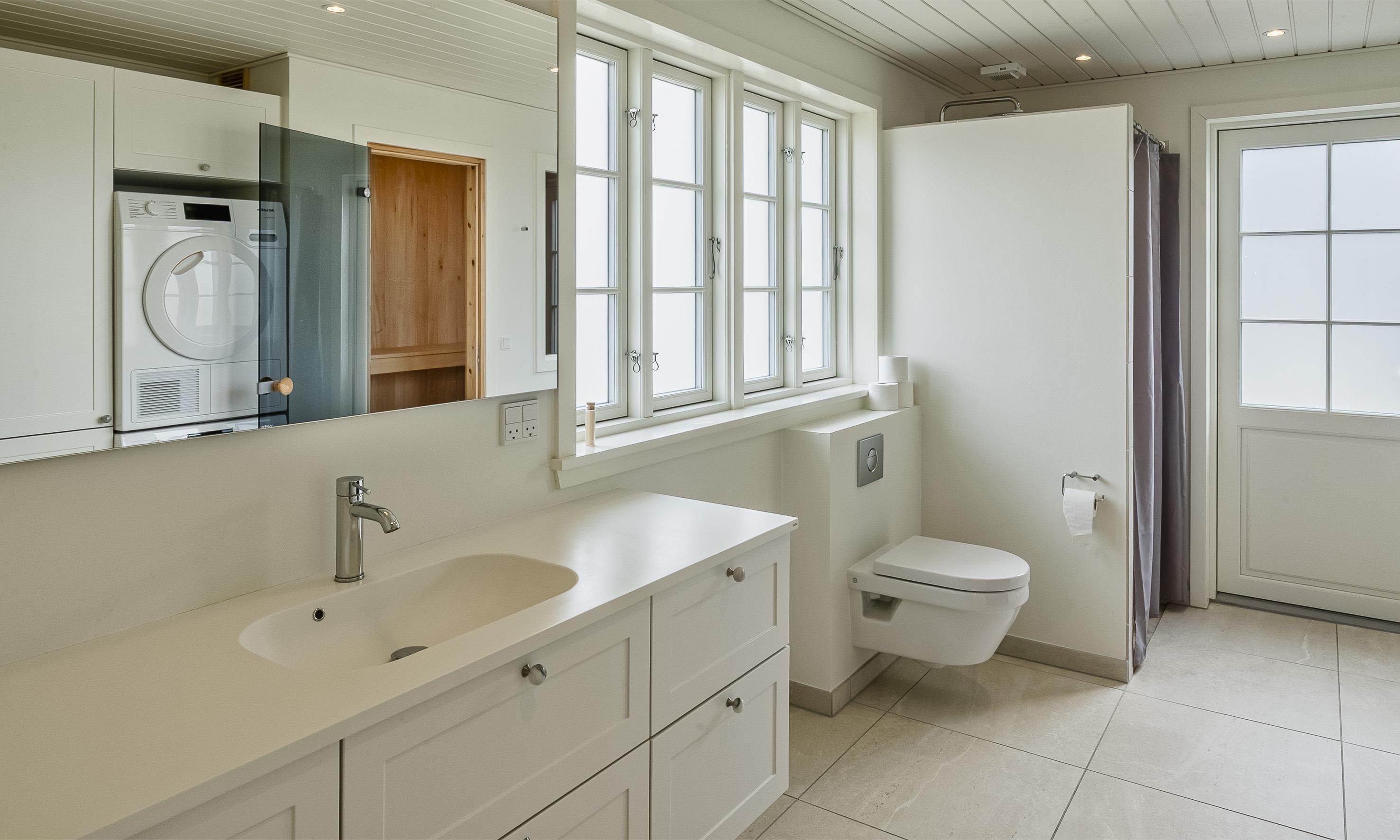 Huset indeholder: entré med opgang til første sal. 4 gode soveværelser: DS + DS + 2S + 2S. Et masterbadeværelse med bruser, vaskearrangement, toilet, vaskemaskine og tørretumbler. Sauna. Gæstetoilet på første sal med bruser, toilet og vaskearrangement. Køkkenet fremstår med alt komfort og er med bageovn, kogeplader, emhætte, køle-fryseskab og opvaskemaskine. Spiseafdelingen og stuen er i åben forbindelse med køkkenet. Rummet er lyst og venligt indrettet med sofa- og hyggehjørne.