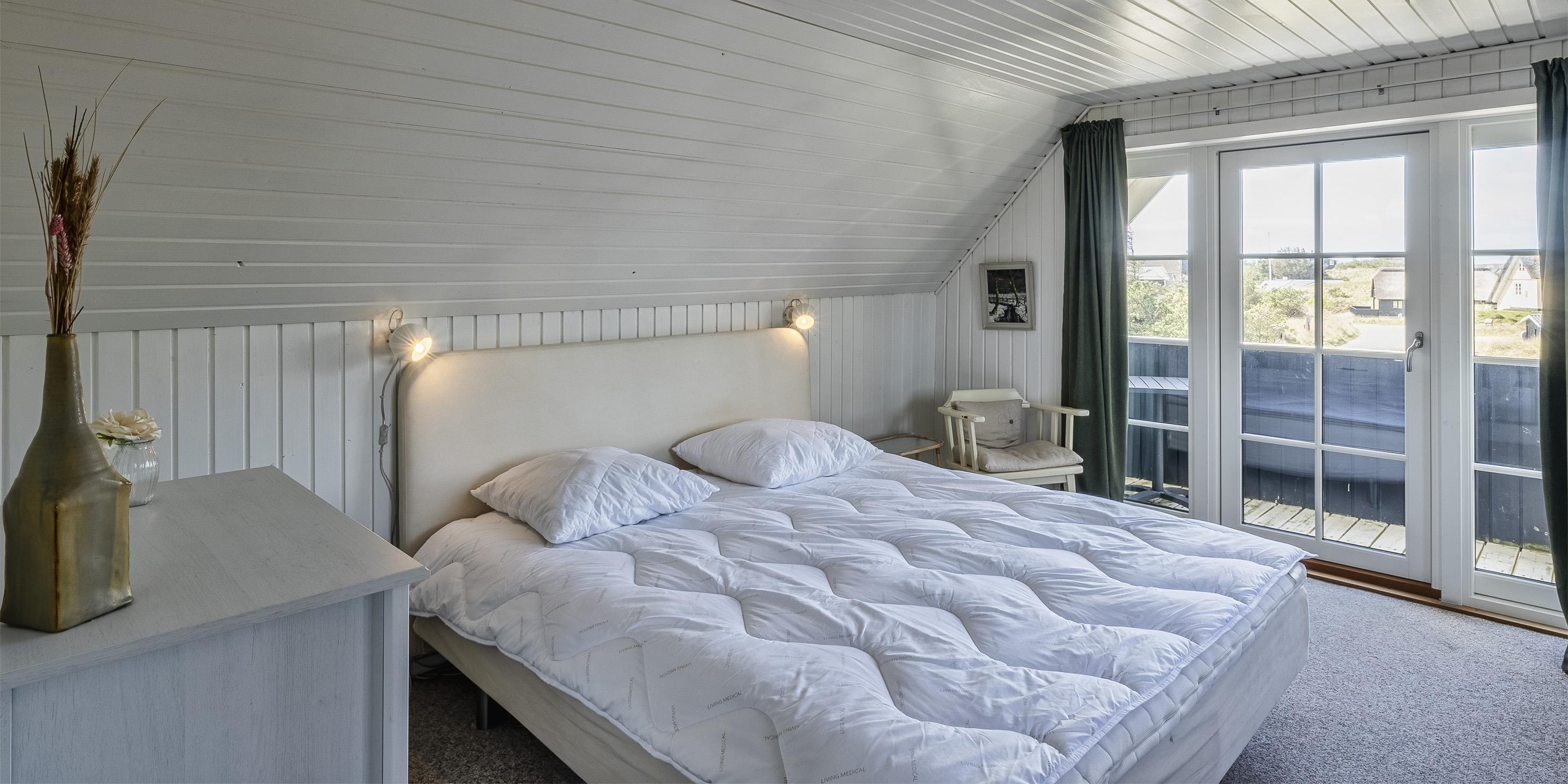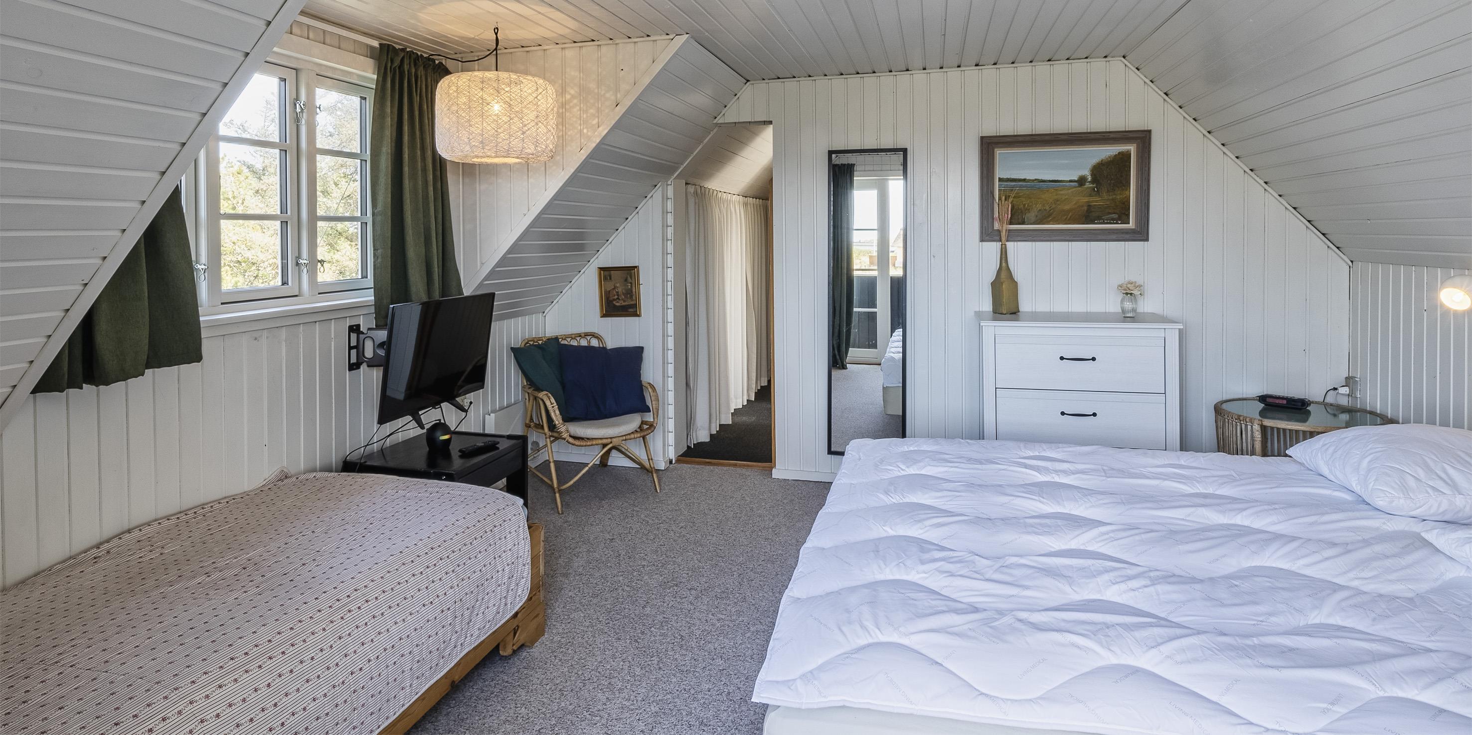3 soveværelser. 2 med dobbeltseng 180x200 cm. 1 med 2 enkeltsenge (á 90x200 cm)