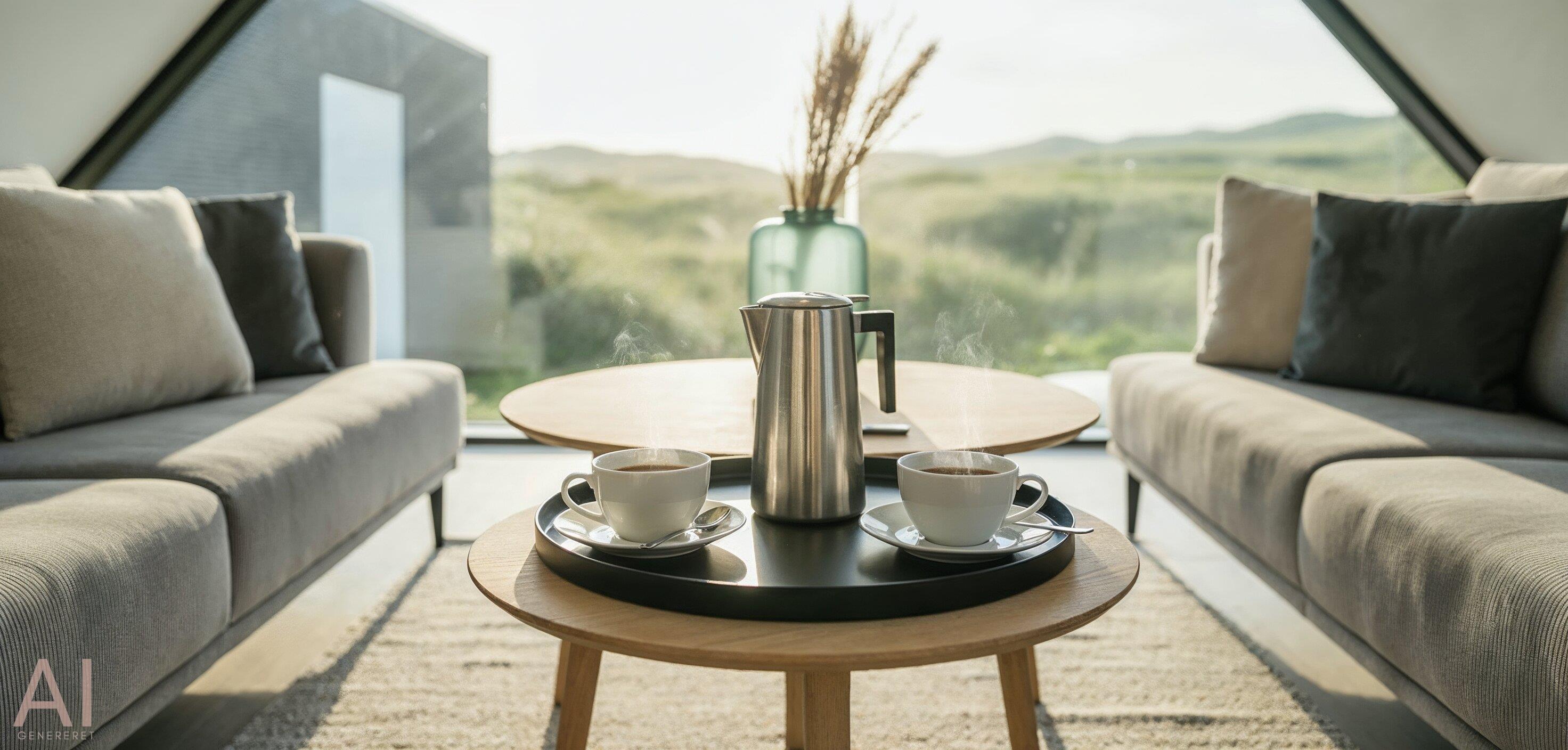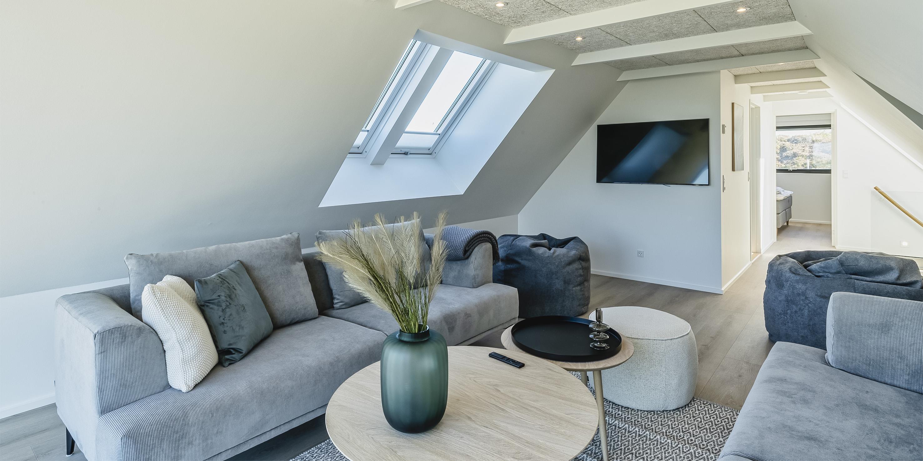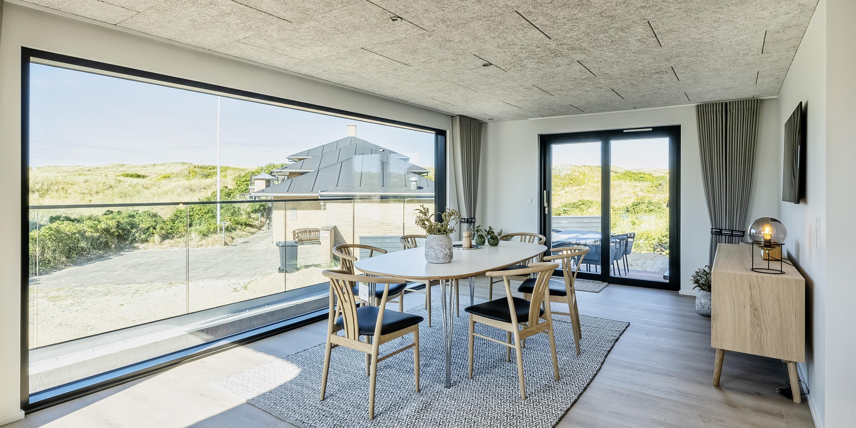 Sommerhuset byder på en skøn atmosfære i en moderne stil og med store panoramavinduer vendt mod havet. Der er hav kig fra første sal.
