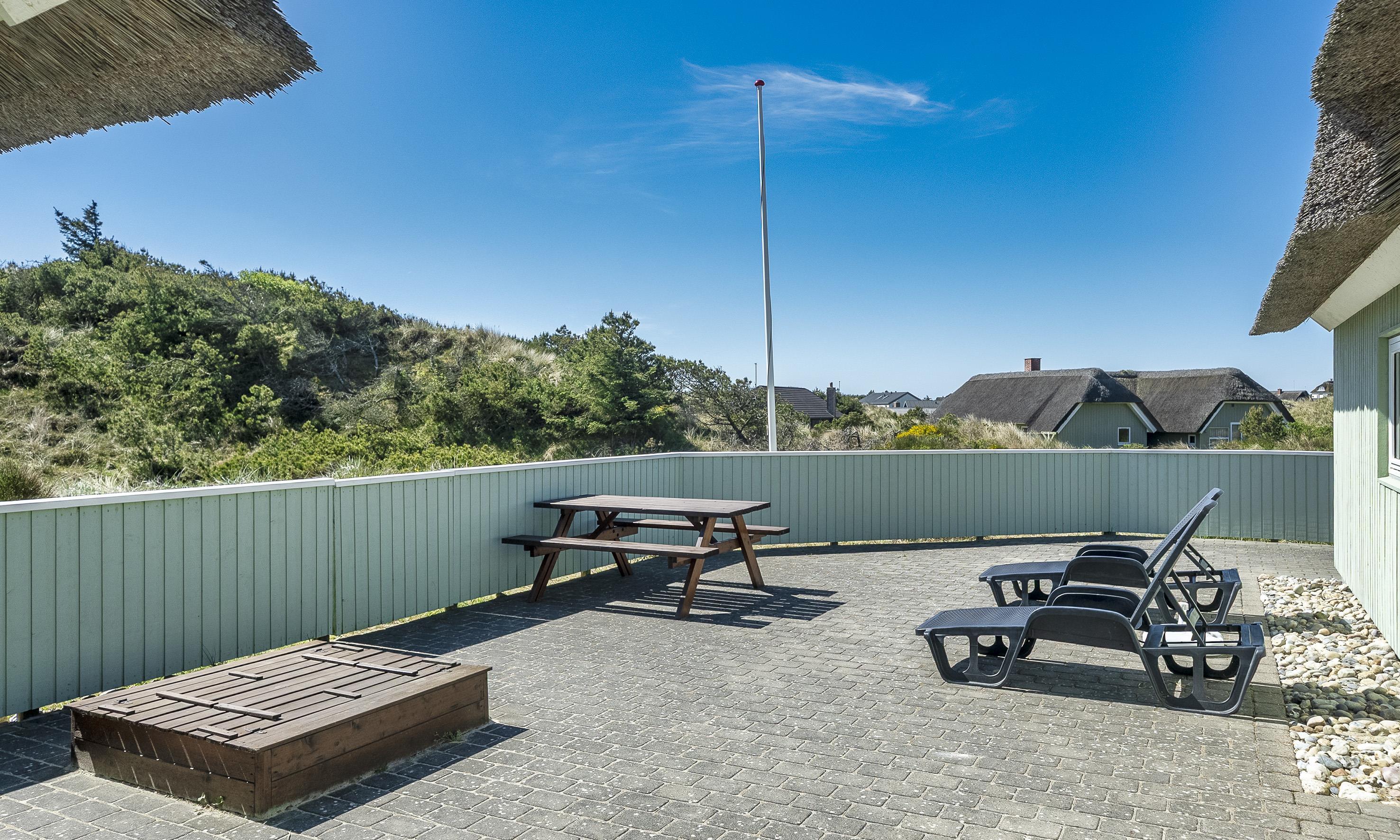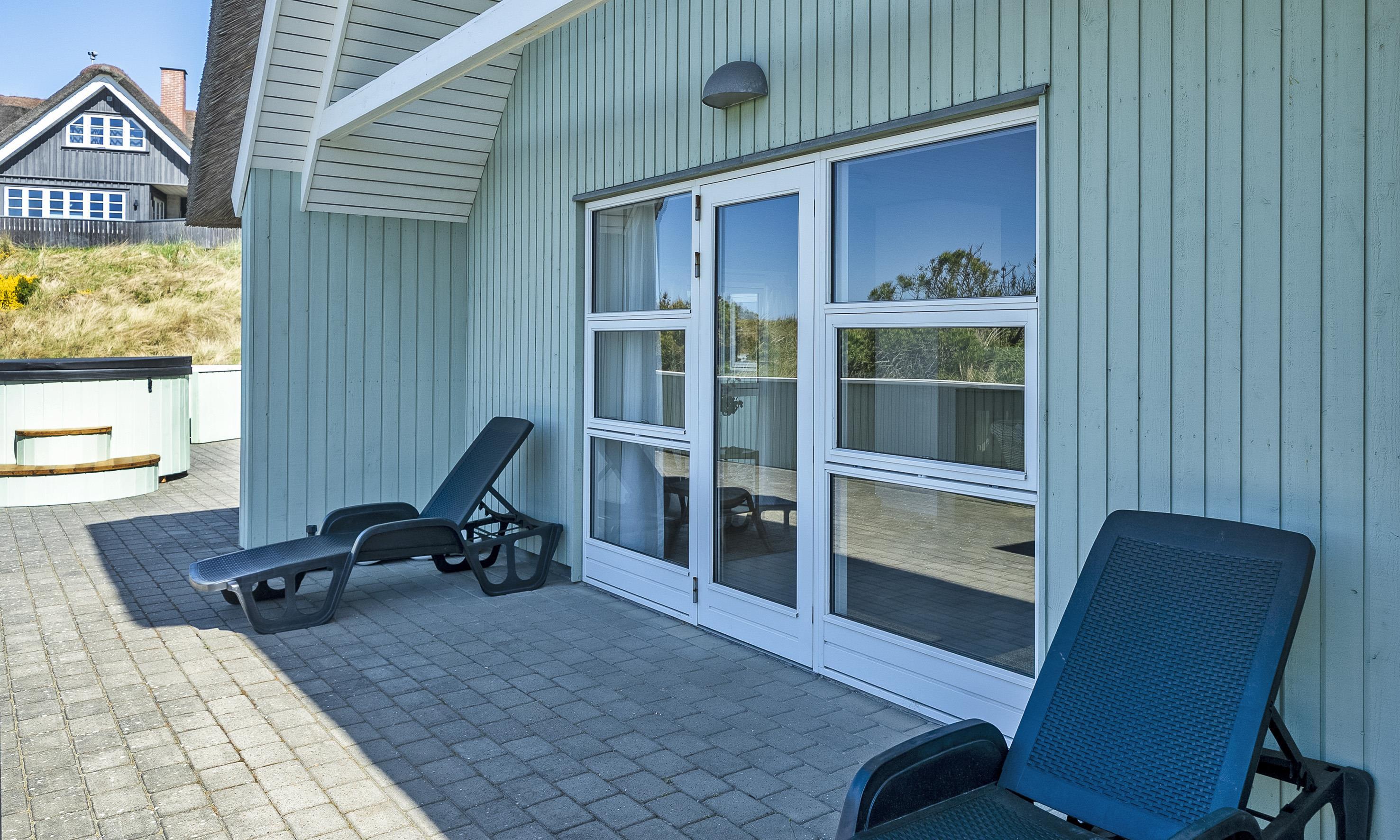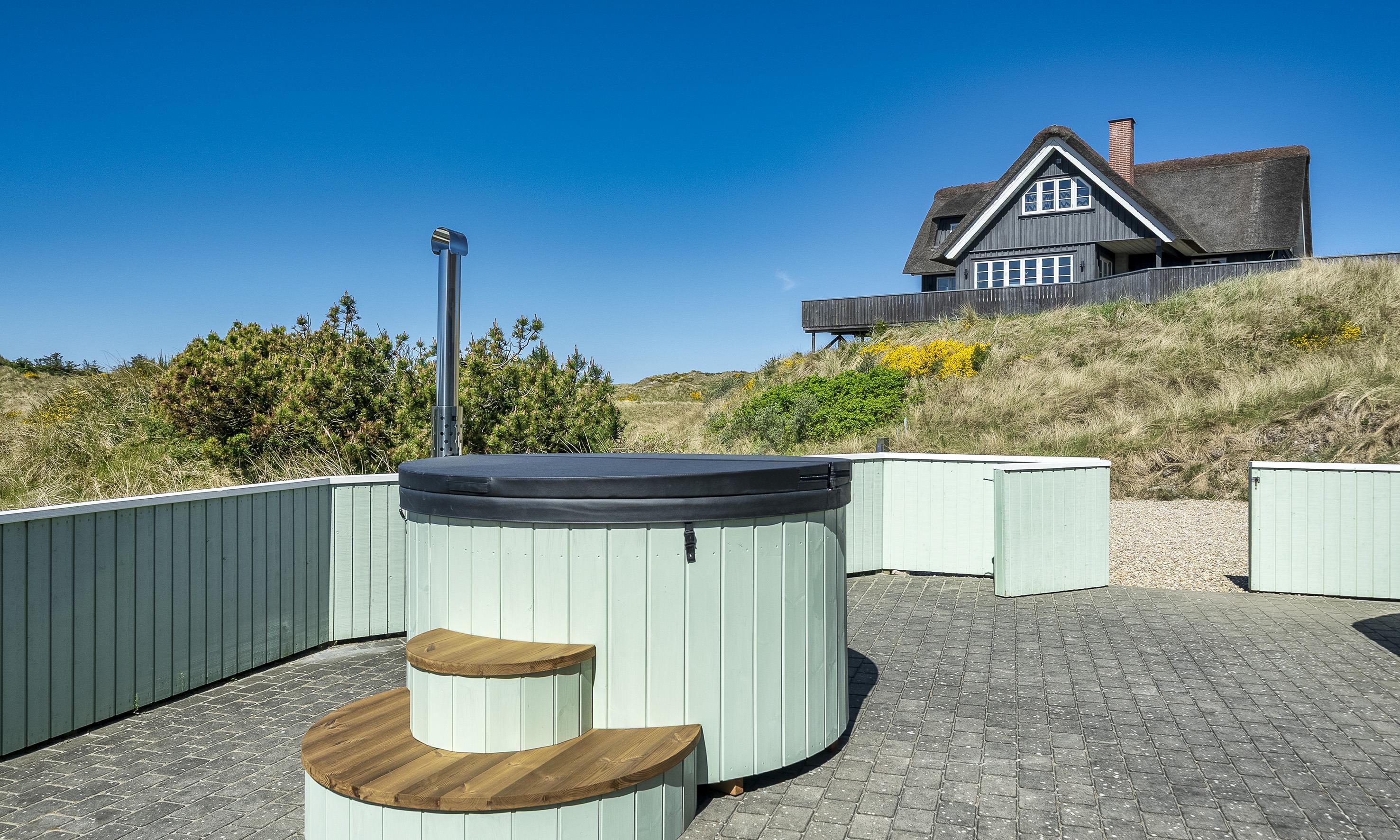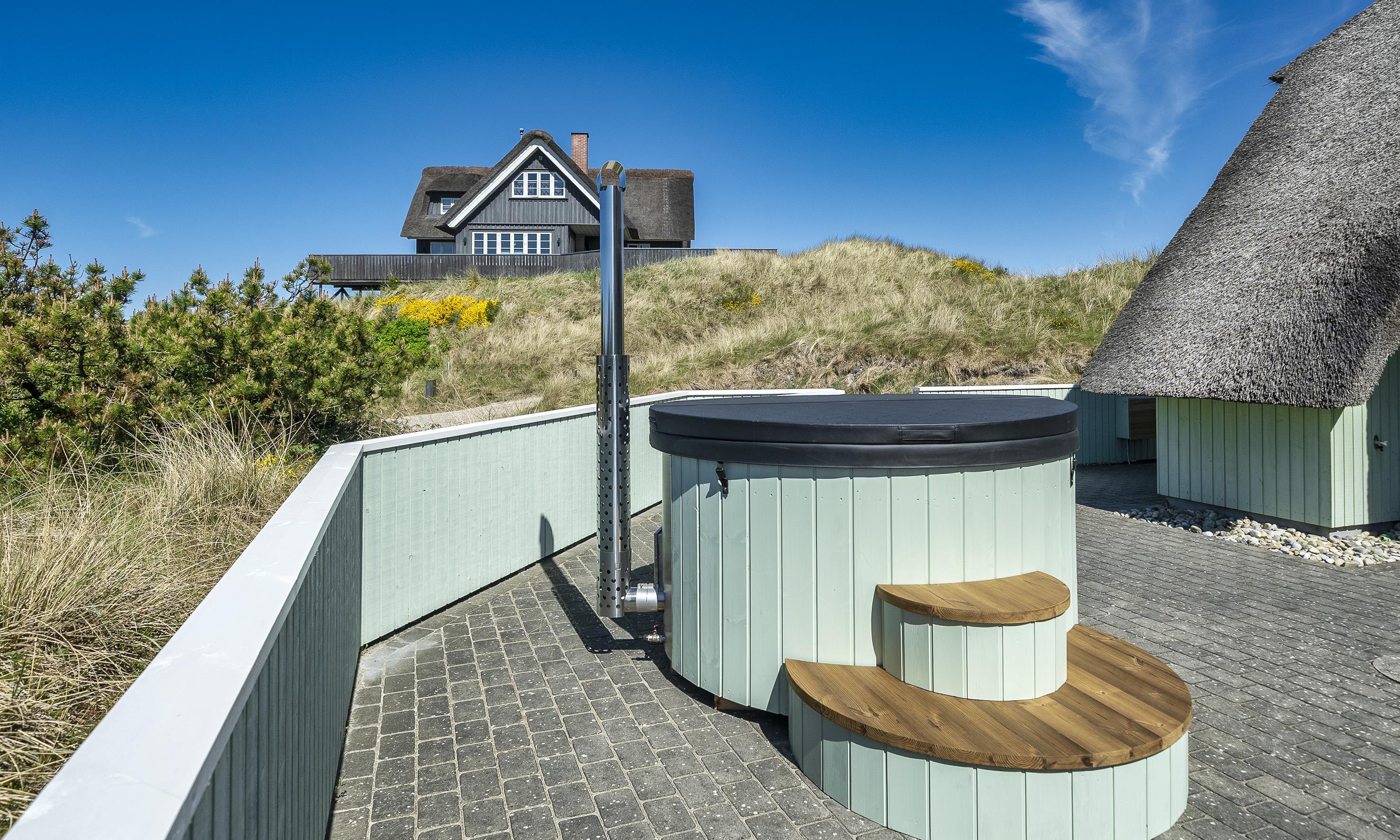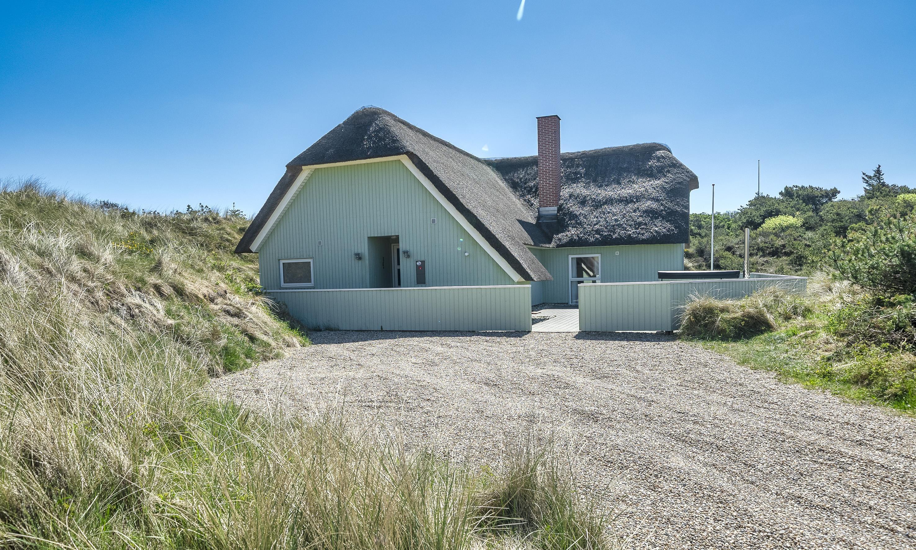Stråtækt idyllisk og smagfuldt sommerhus til 6-8 personer, beliggende i klitområde, ca. 200 meter til stranden. Huset er nyopført i år 2019 og fremstår med en helt fantastisk lukket terrasse med vildmarksbad og udebruser.