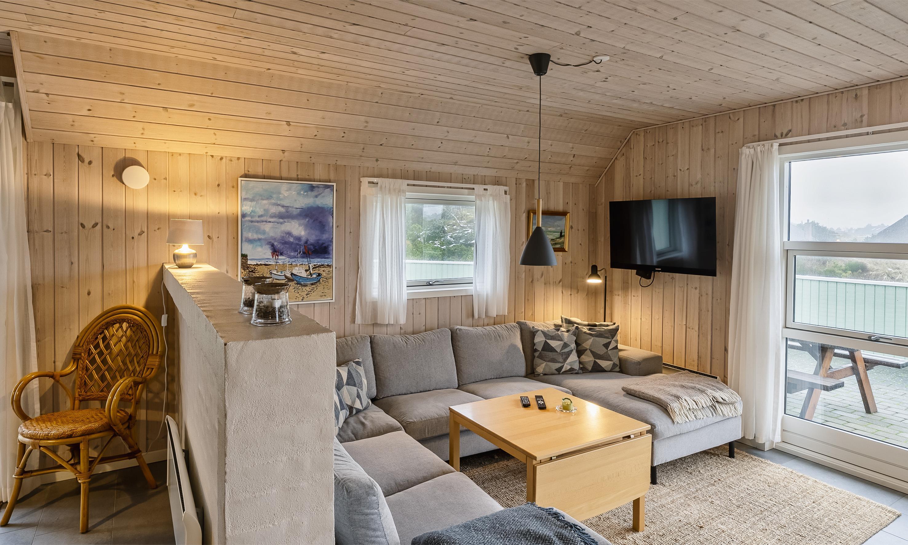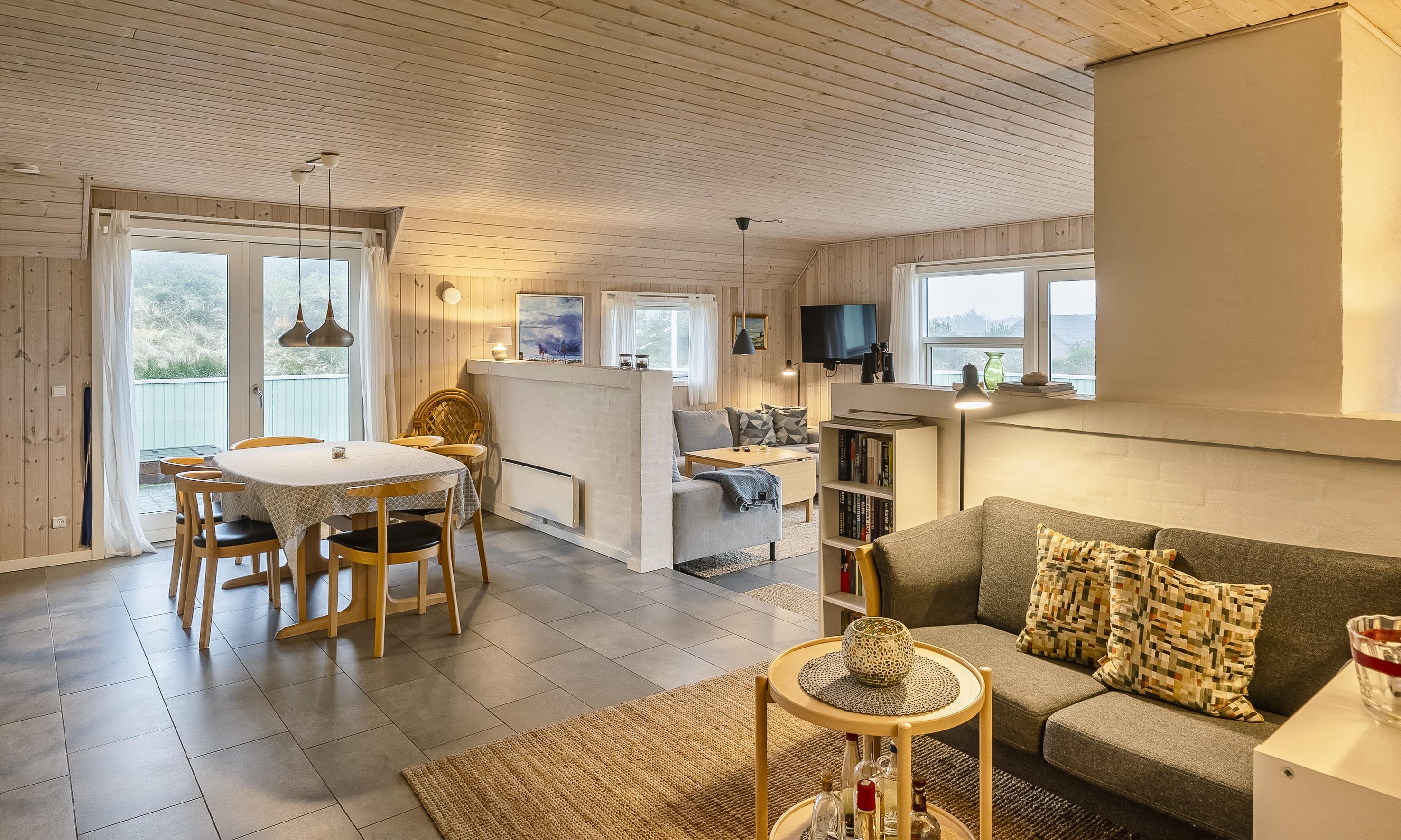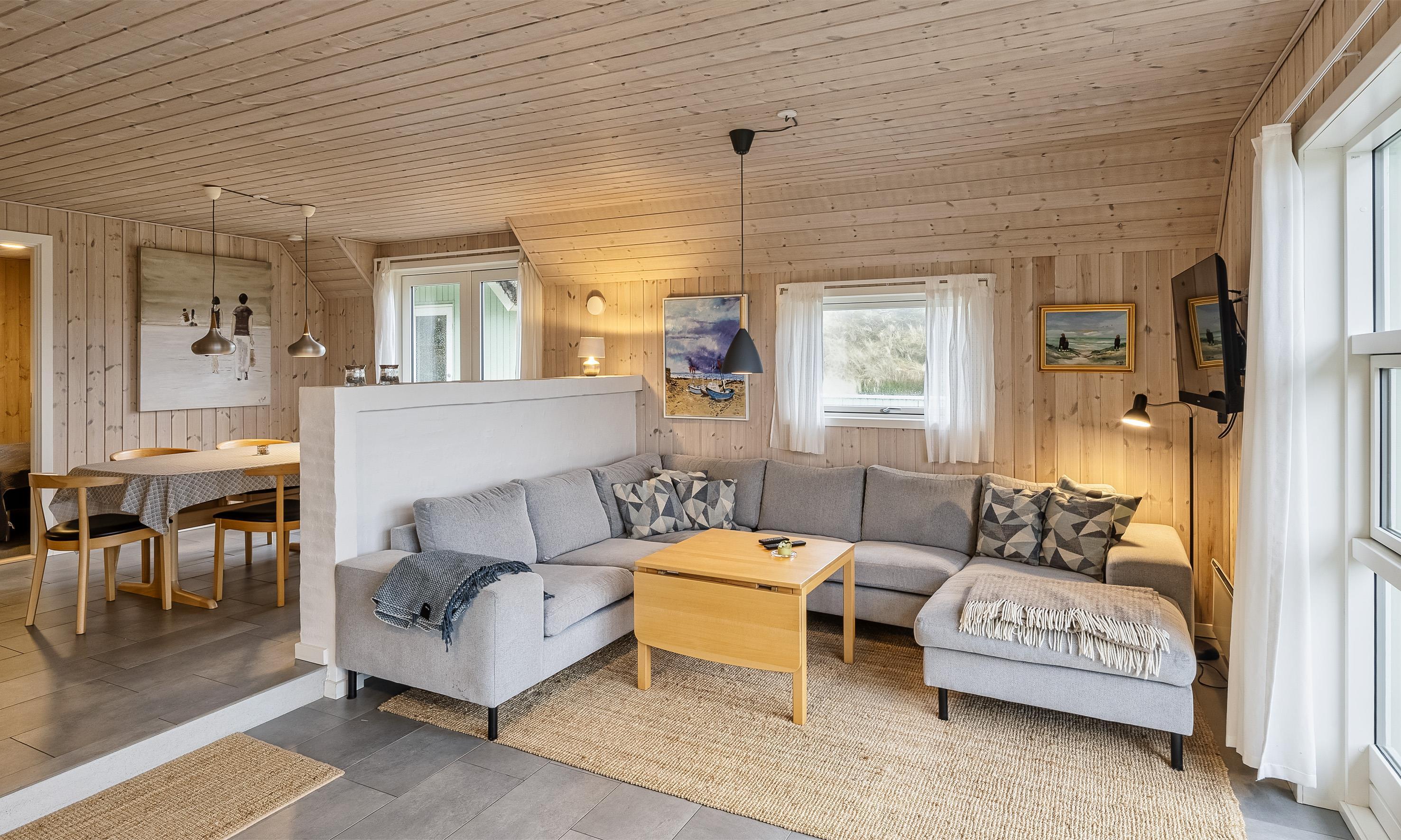 Huset indeholder: Entre/mellemgang, herfra er der indgang til gæstetoilet. Stort badeværelse med bruseniche, hjørnespa, sauna, vaske arrangement og toilet, separat WC og et baderum med bruser, vaskemaskine og tørretumbler. Fra mellemgangen kommer man over i et dejligt lyst køkken-alrum. Det velfungerende u-køkken fremstår med grå låger og køkkenet afgrænses med en halvvæg til hyggekrog med en 2 personers sofa, Ydermere fremstår alrummet med en åben spiseafdeling og terrassedør ud mod syd. 3 Soveværelser: DS+ DS + 2S. Anneks isoleret og opvarmet med køjeseng til 2 personer. Nedsænket pejsestue med et trin ned. Pejsestuen med hjørnesofa, hvor fra der er kig til brændeovnen og fjernsyn med satellitkanaler og danske programmer (DR-kanaler). Endvidere fremstår pejsestuen med 1 højrygged lænestole, tæt ved brændeovnen hvorfra varmen kan nydes. Udgang til stor lukket terrasse hvoraf en del er overdækket. Trådløs internetadgang. Byggeår 2019. Ungdomsgrupper er ikke tilladt.