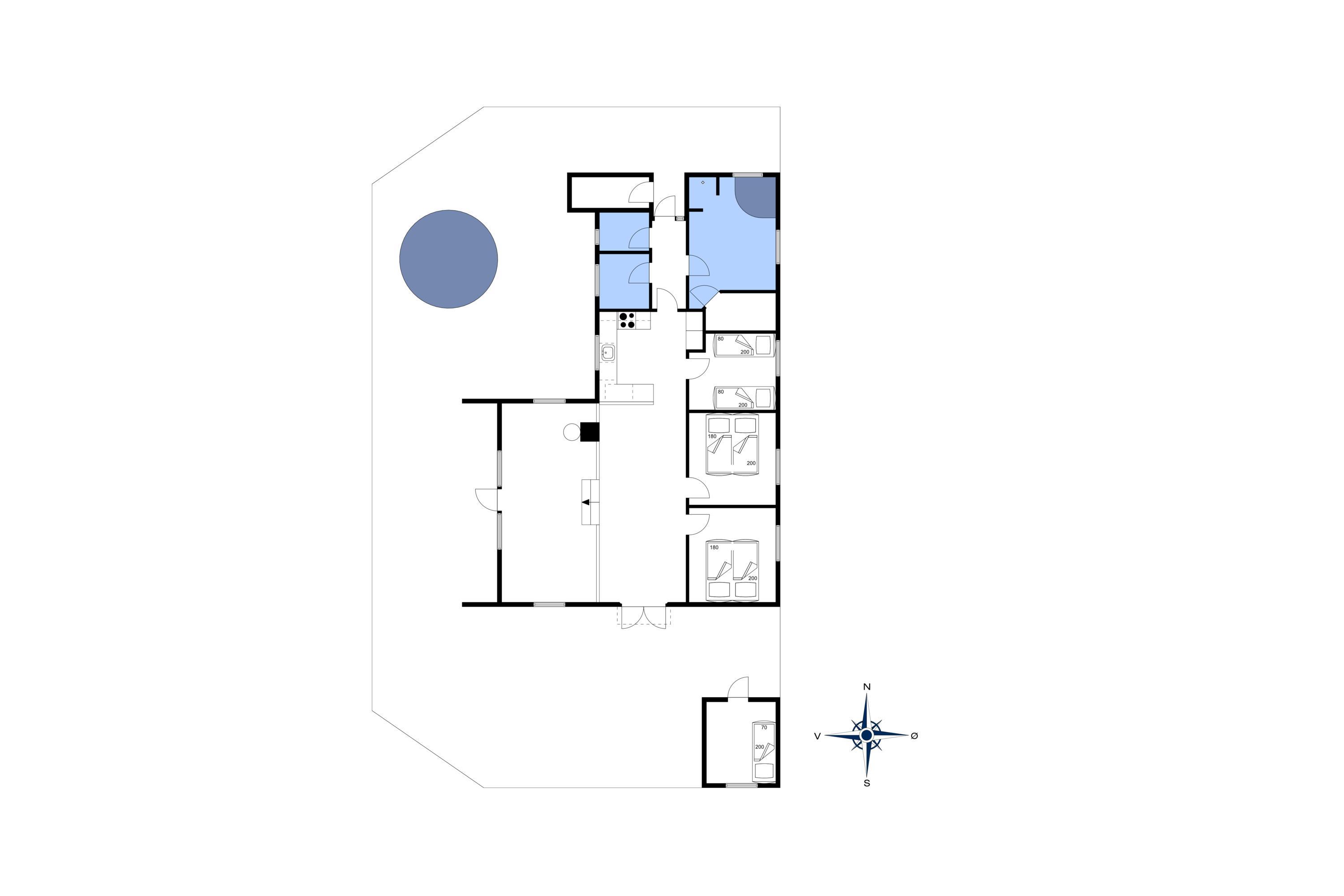 3 soveværelser. 2 med dobbeltseng 180x200 cm. 1 værelse med 2 enkeltsenge (á 80x200 cm)