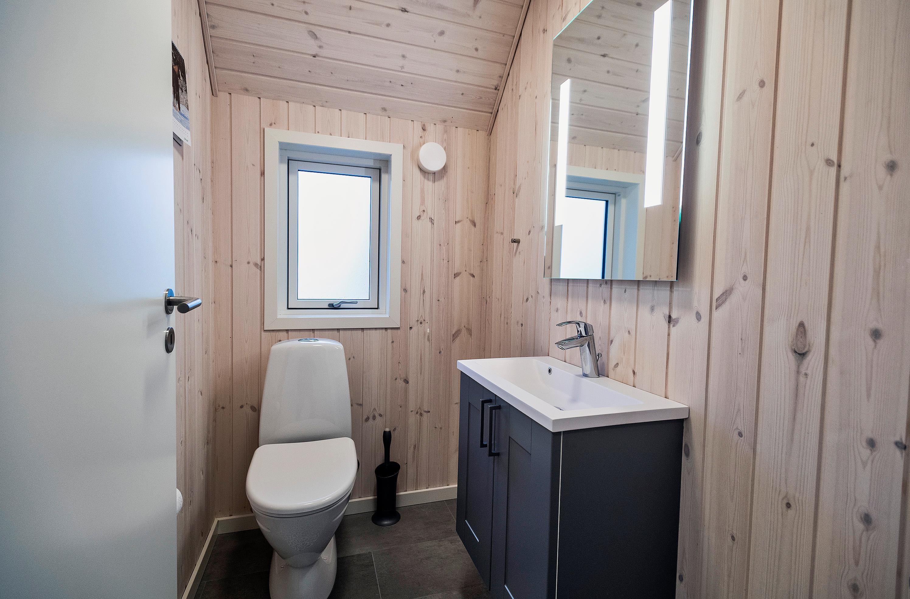 Bad med toilet, bruser og vask