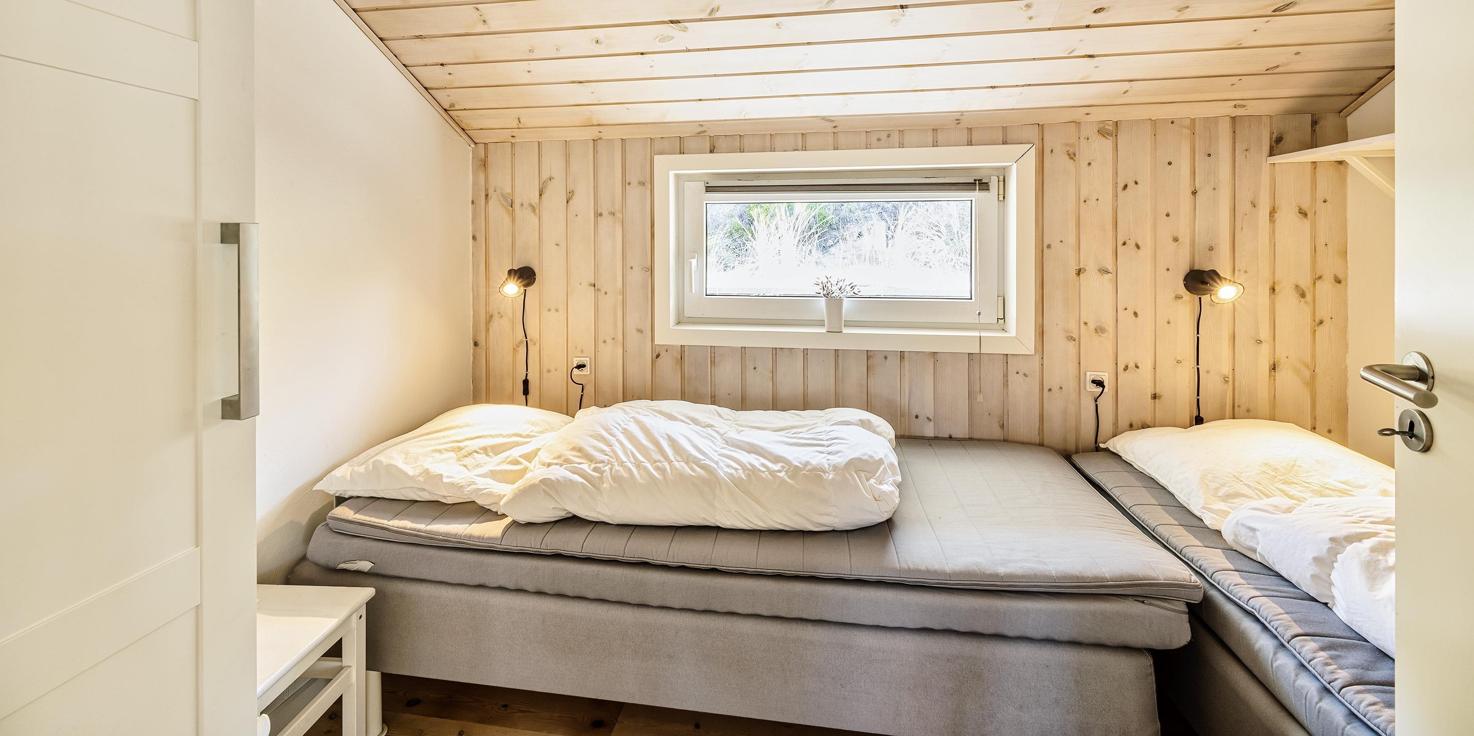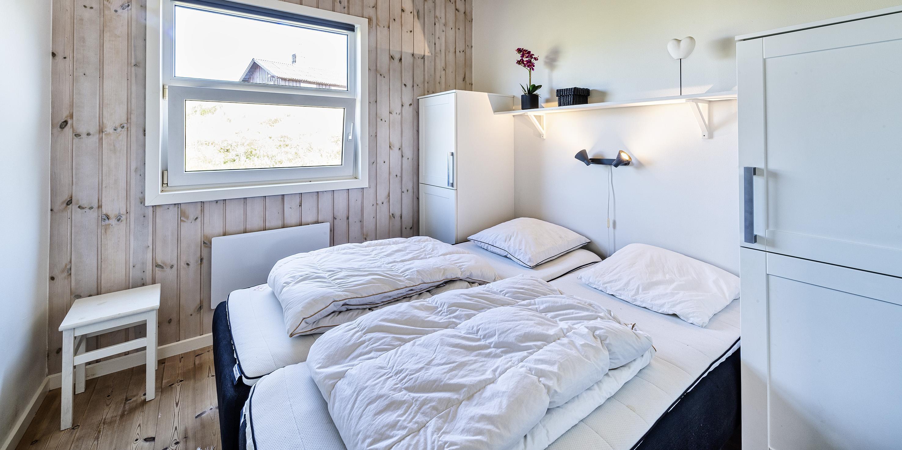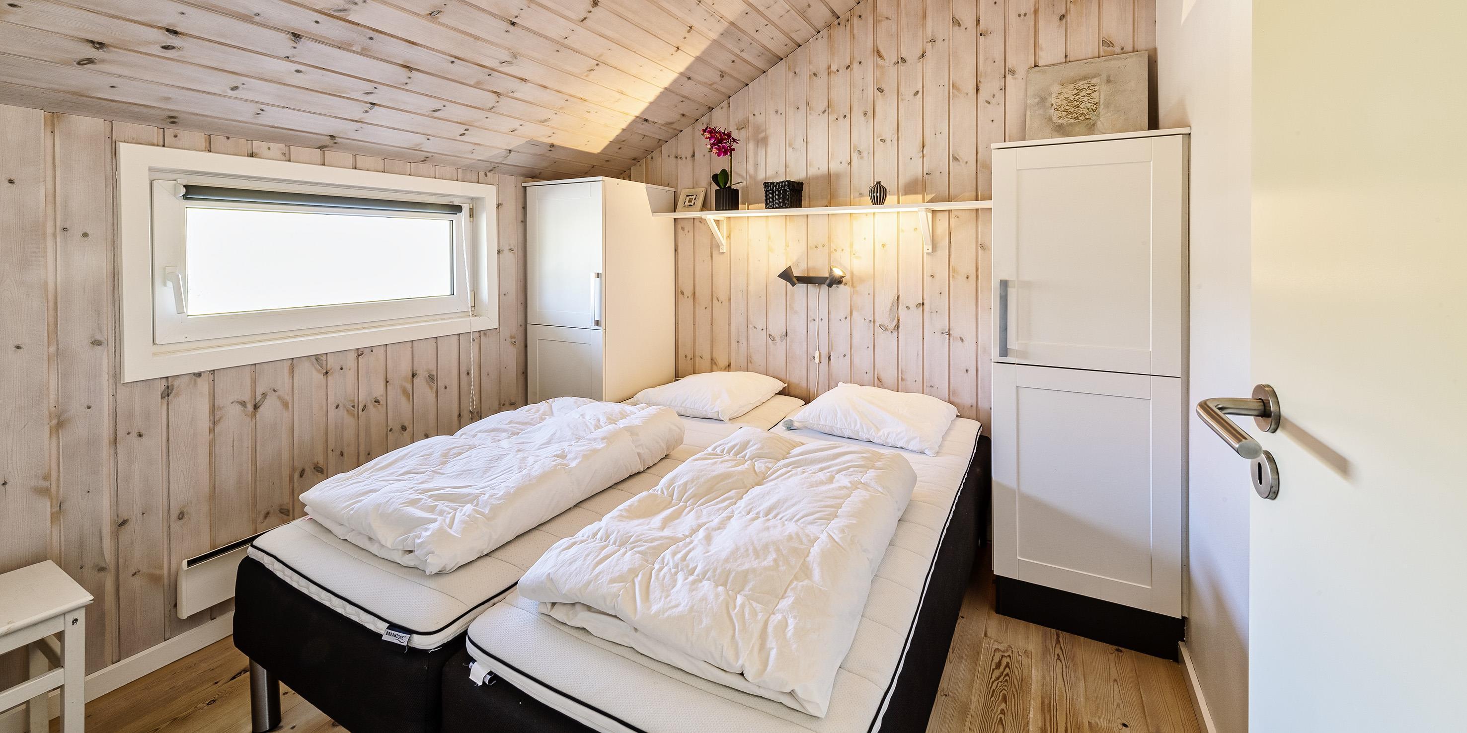 2 soveværelser med dobbeltseng 180x200 cm. 1 med 2 enkeltsenge (á 90x200 cm)