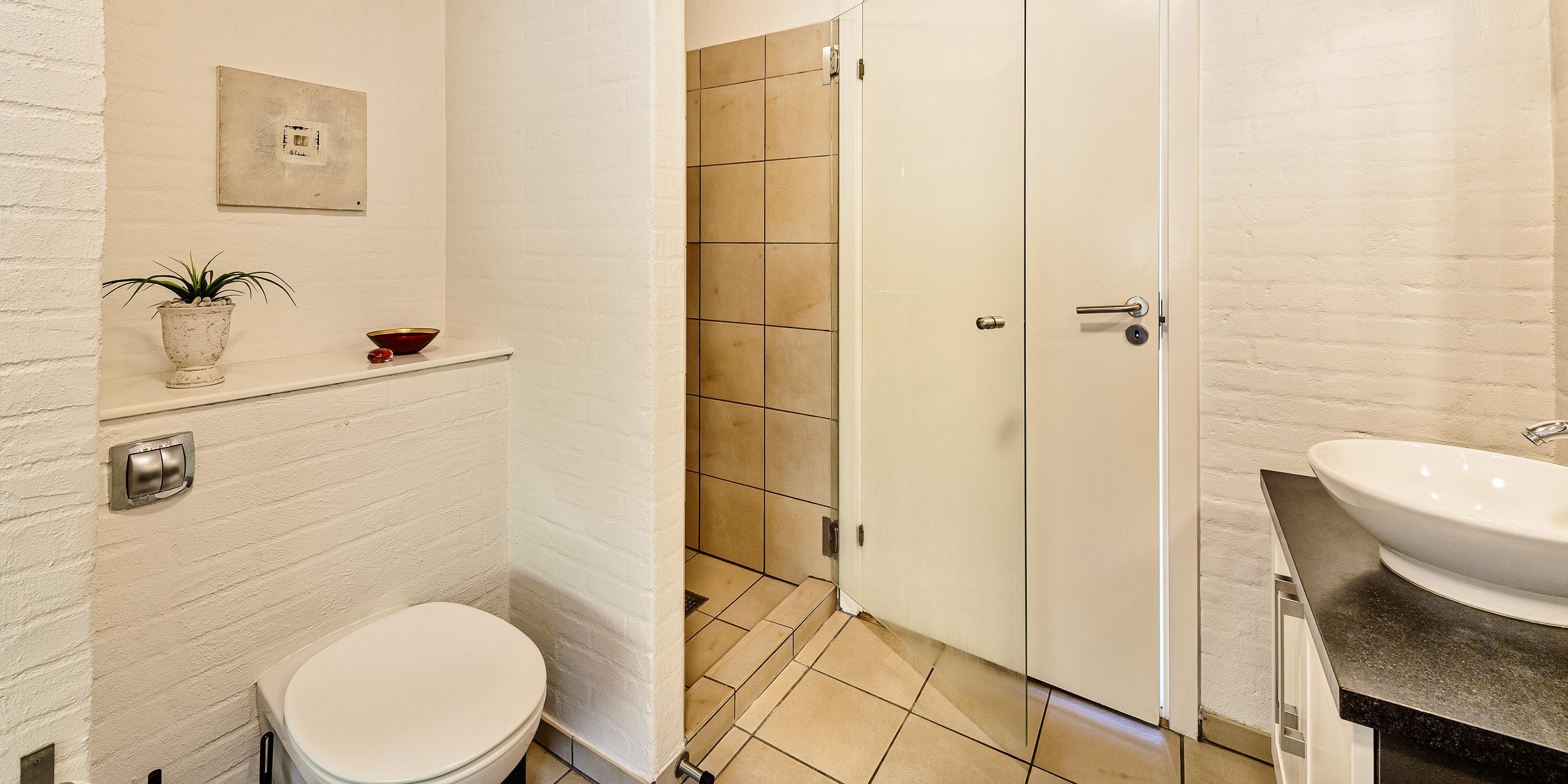 Bad med toilet, bruser og vask