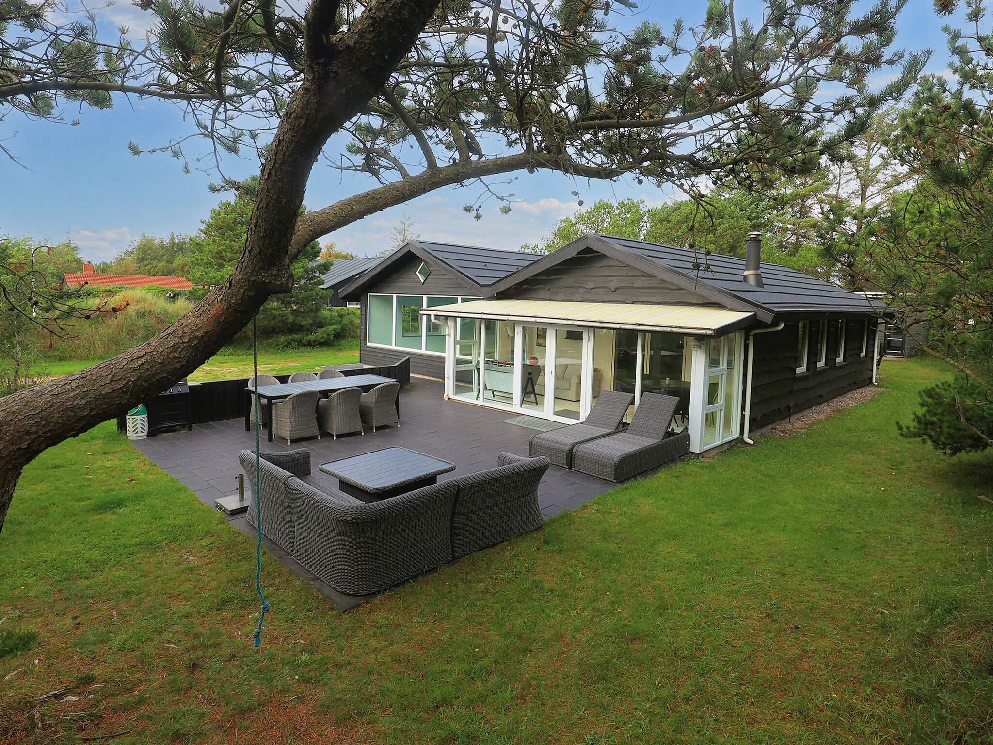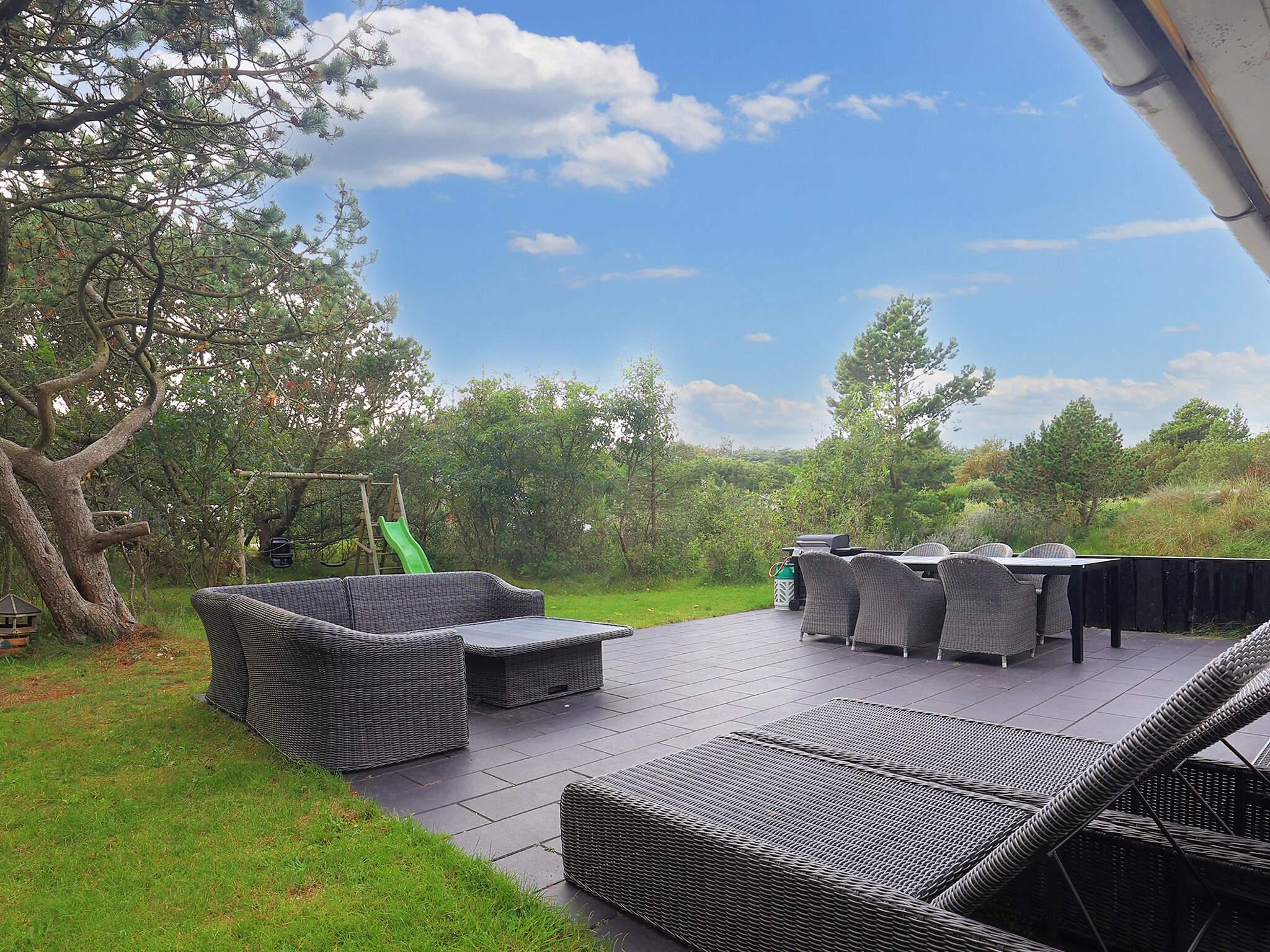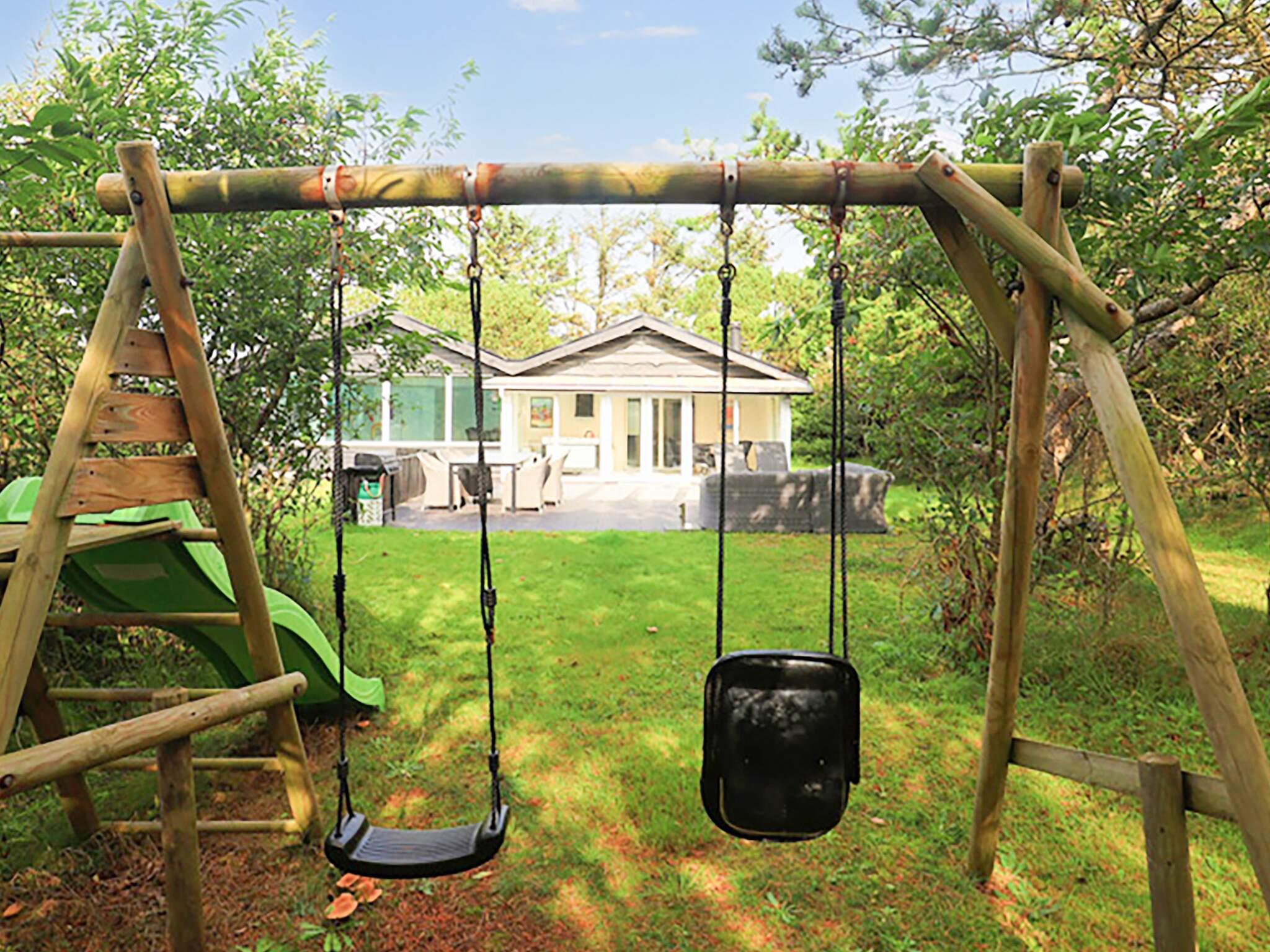Der er sandkasse, gynger og en høj stol. Feriehuset ligger på en dejlig naturgrund med bevoksning.
