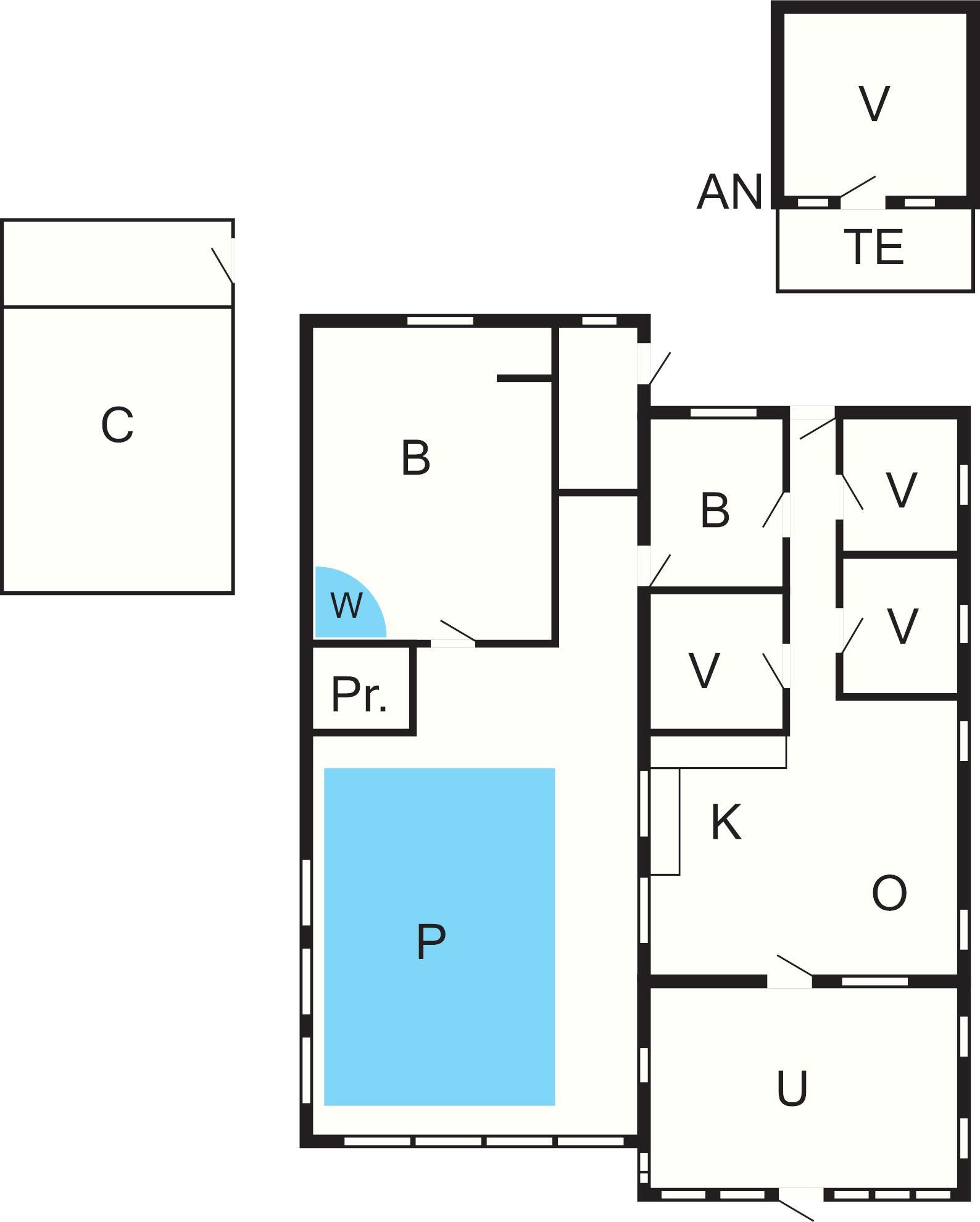 Udestuen har møbler og forskellige aktiviteter som bordfodbold og airhockey. Køkkenet har opvaskemaskine, komfur og ekstra fryser.