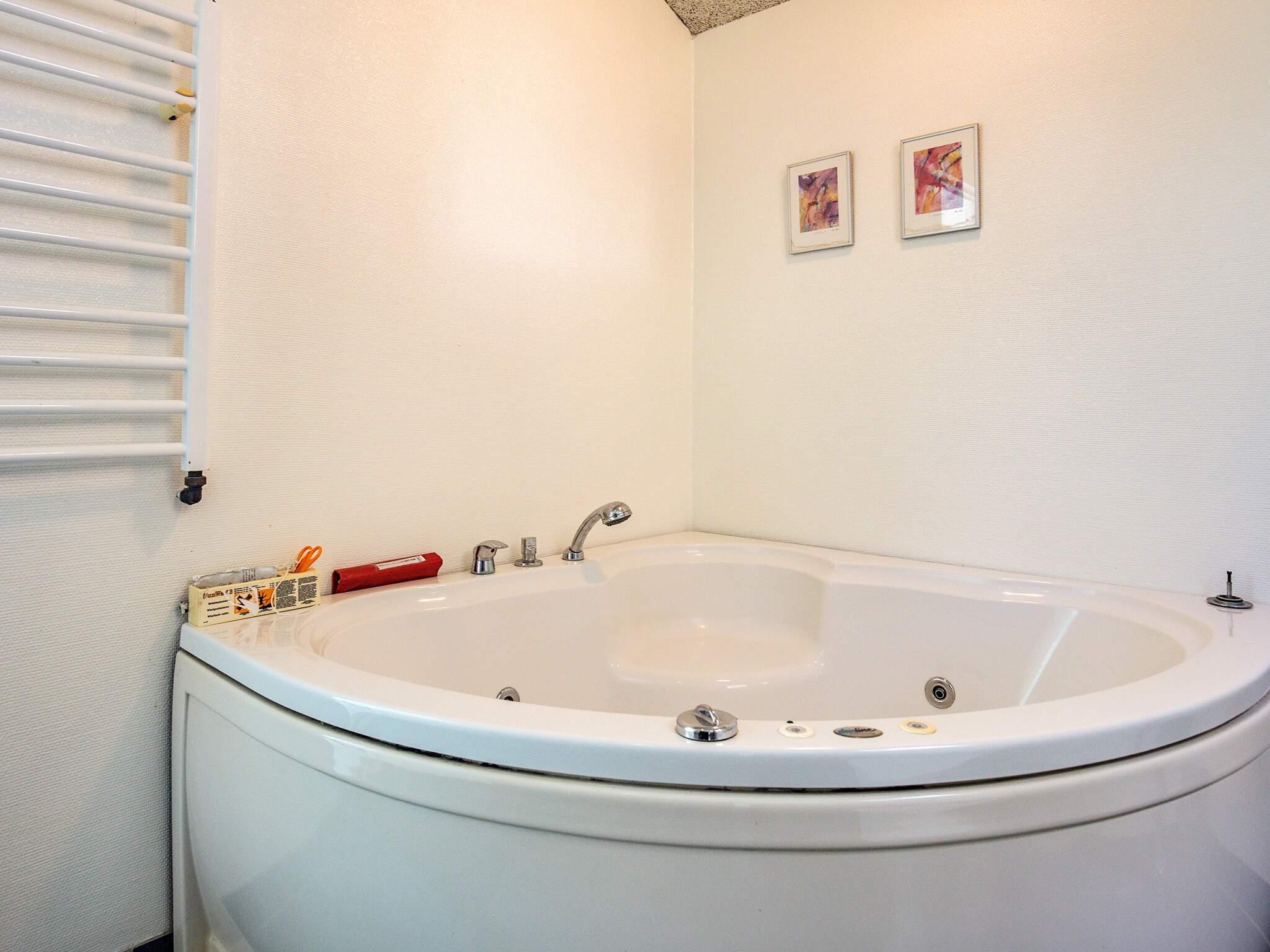 Badeværelse med gulvvarme, 2-personers whirlpool, toilet, håndvask og bruser. Stuen og køkkenet er i åbent plan med personlige møbler med lædersofaer og spisebord. Stuen har fladskærms-tv og brændeovn.