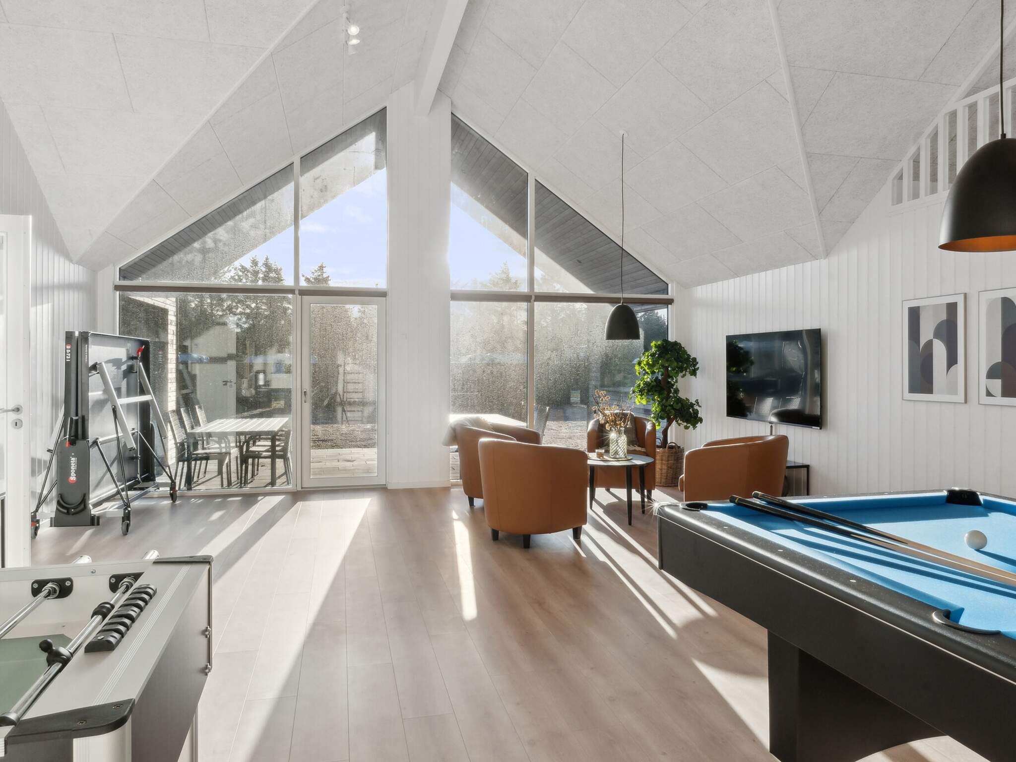 Når I træder ind i huset, vil I blive mødt af en stor indendørs pool afdeling med vandrutsjebane og svømmetræner, som både store og små vil elske. Når I bevæger jer videre gennem huset, vil I træde ind i sommerhusets hjerte. Her finder I et fuldt udstyret køkken, hvor I kan nyde jeres yndlingsmusik på Sonos-anlægget, mens I laver mad. Måltiderne kan nydes ved det store spisebord med plads til alle, og efterfølgende kan I slappe af i den hyggelige sofaafdeling. Alrummet skaber de perfekte rammer for hyggelige stunder og fælles måltider. Huset byder også på det store aktivitetsrum, hvor der er noget for enhver smag – fra billard og bordtennis til bordfodbold og dart.
