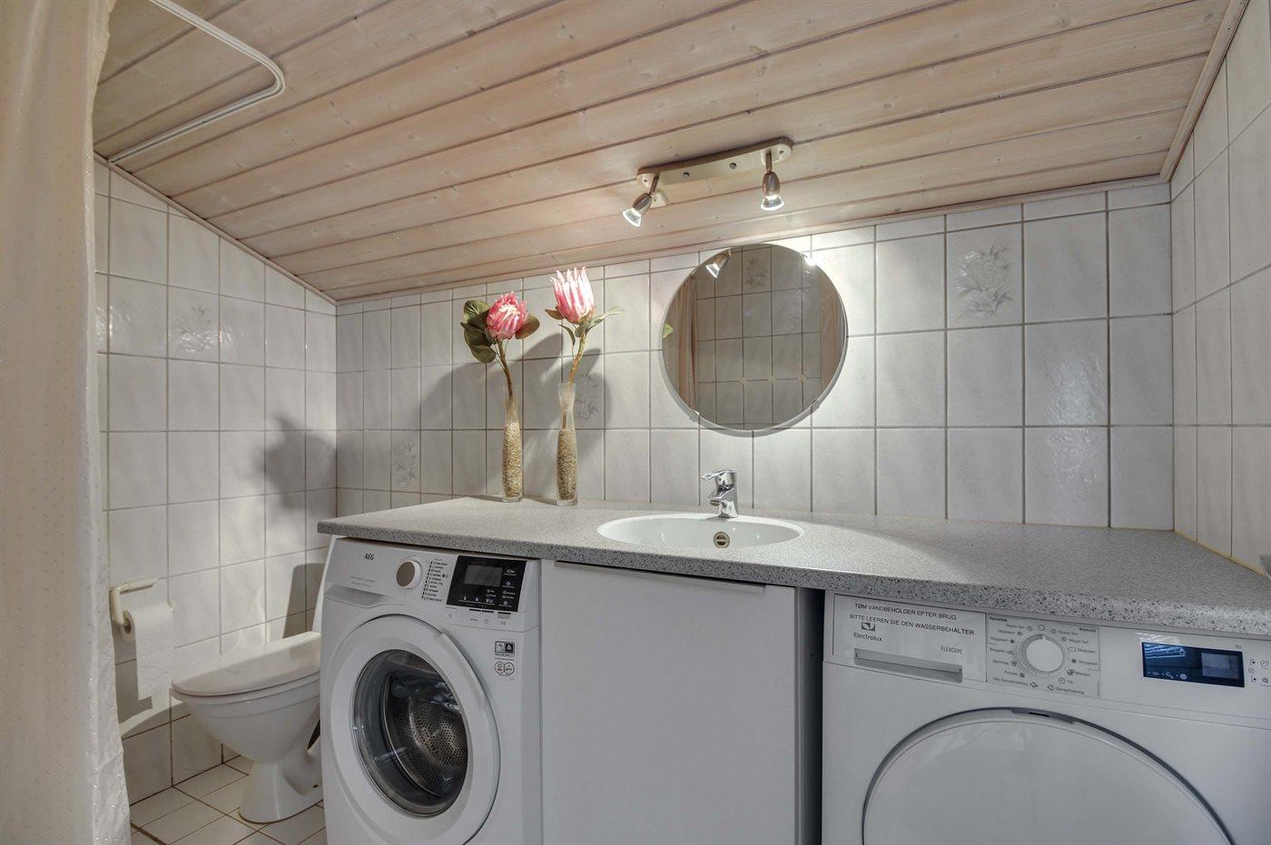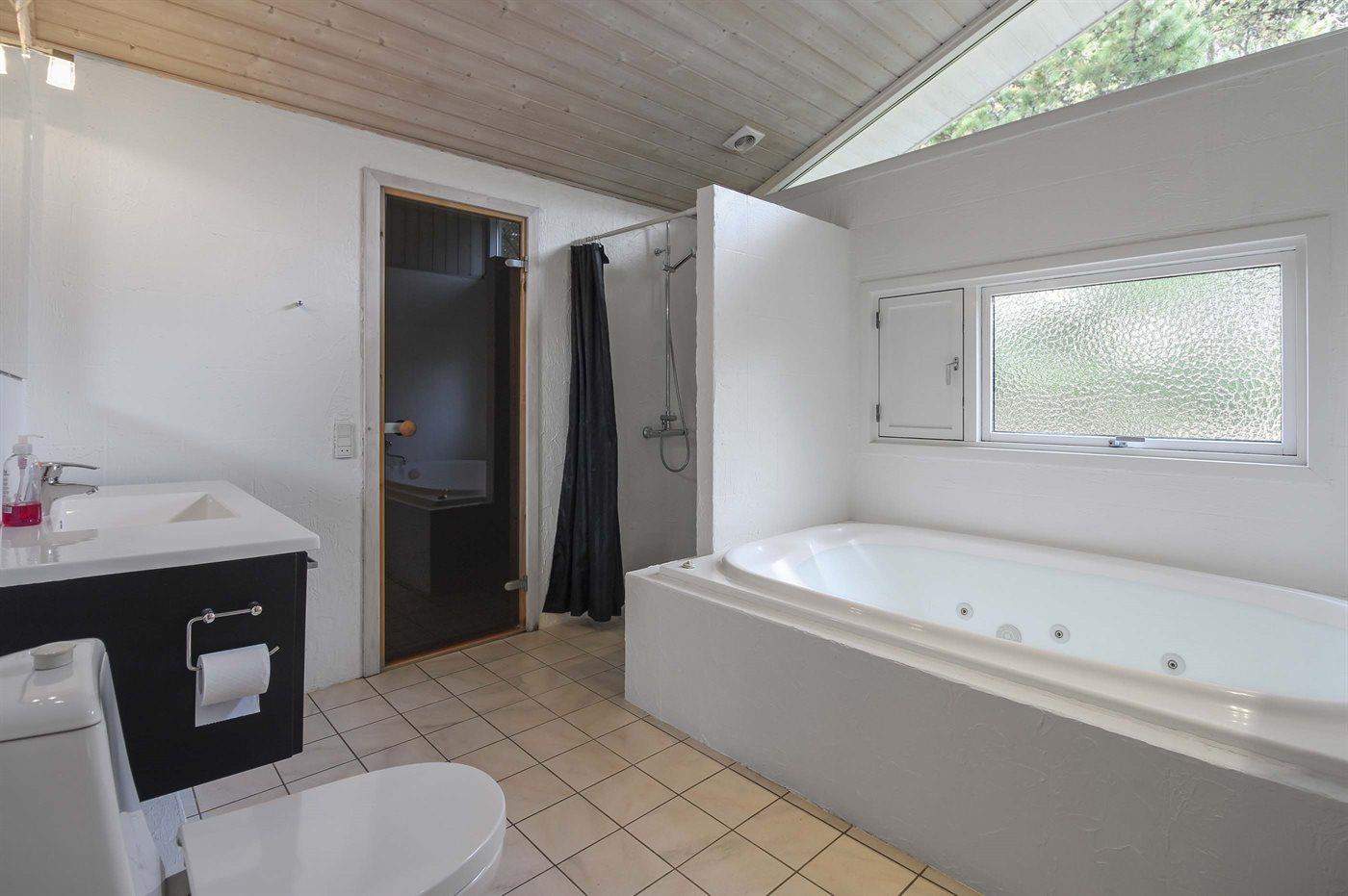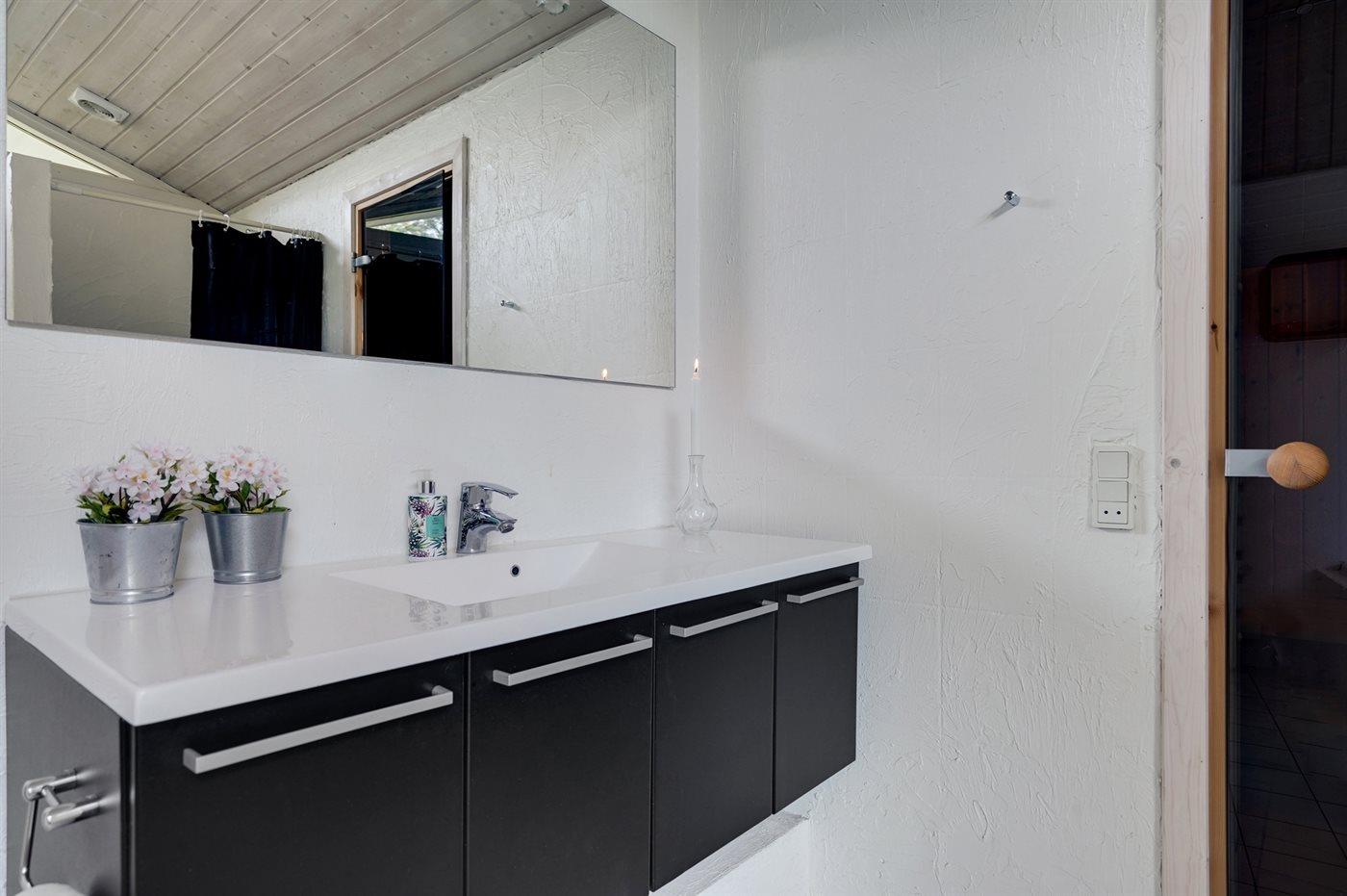 Der er 2 badeværelser med bruseniche og 2 toiletter. Der er gulvvarme på 2 badeværelser. I saunaen er der mulighed for afslapning.
