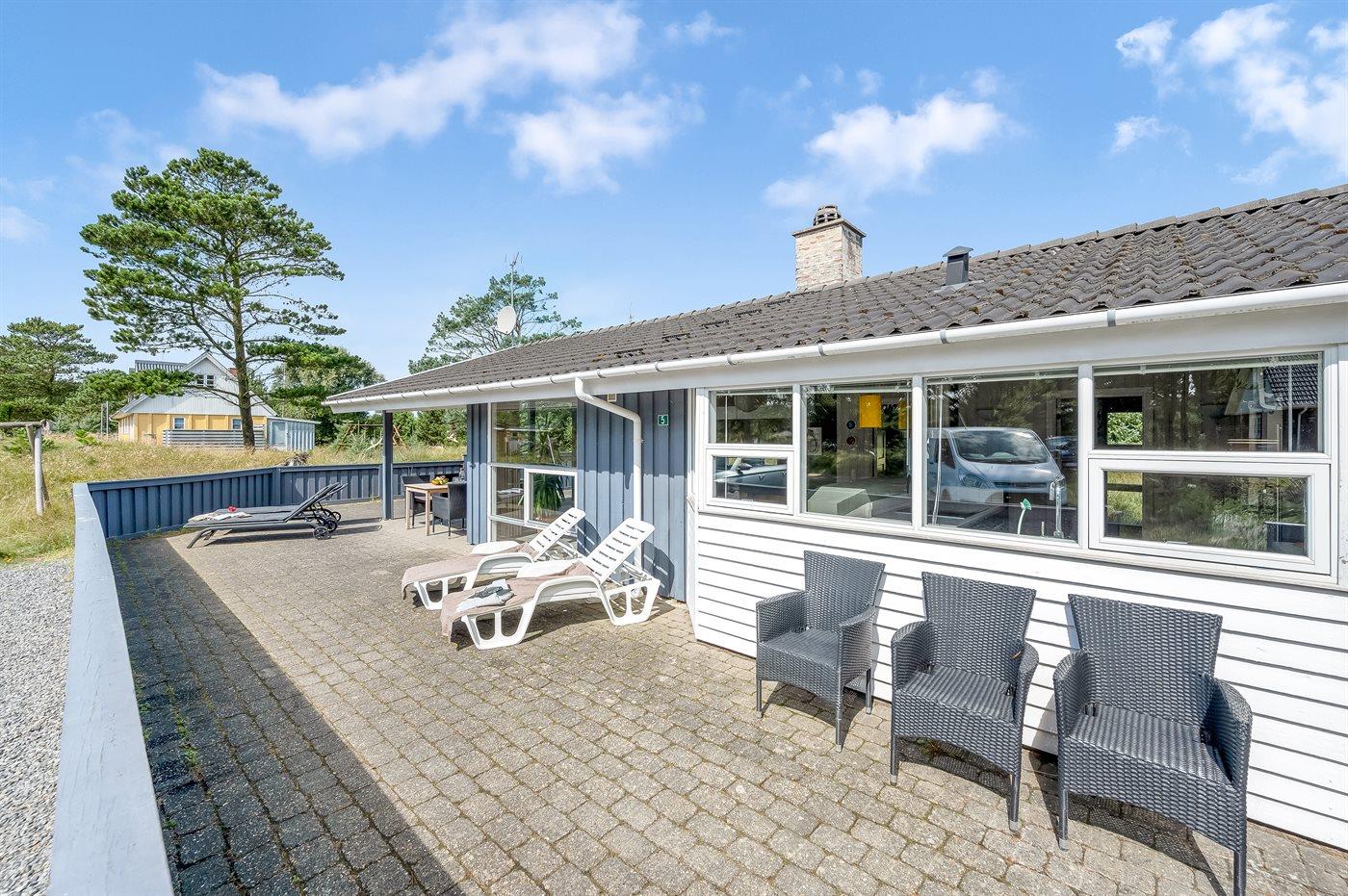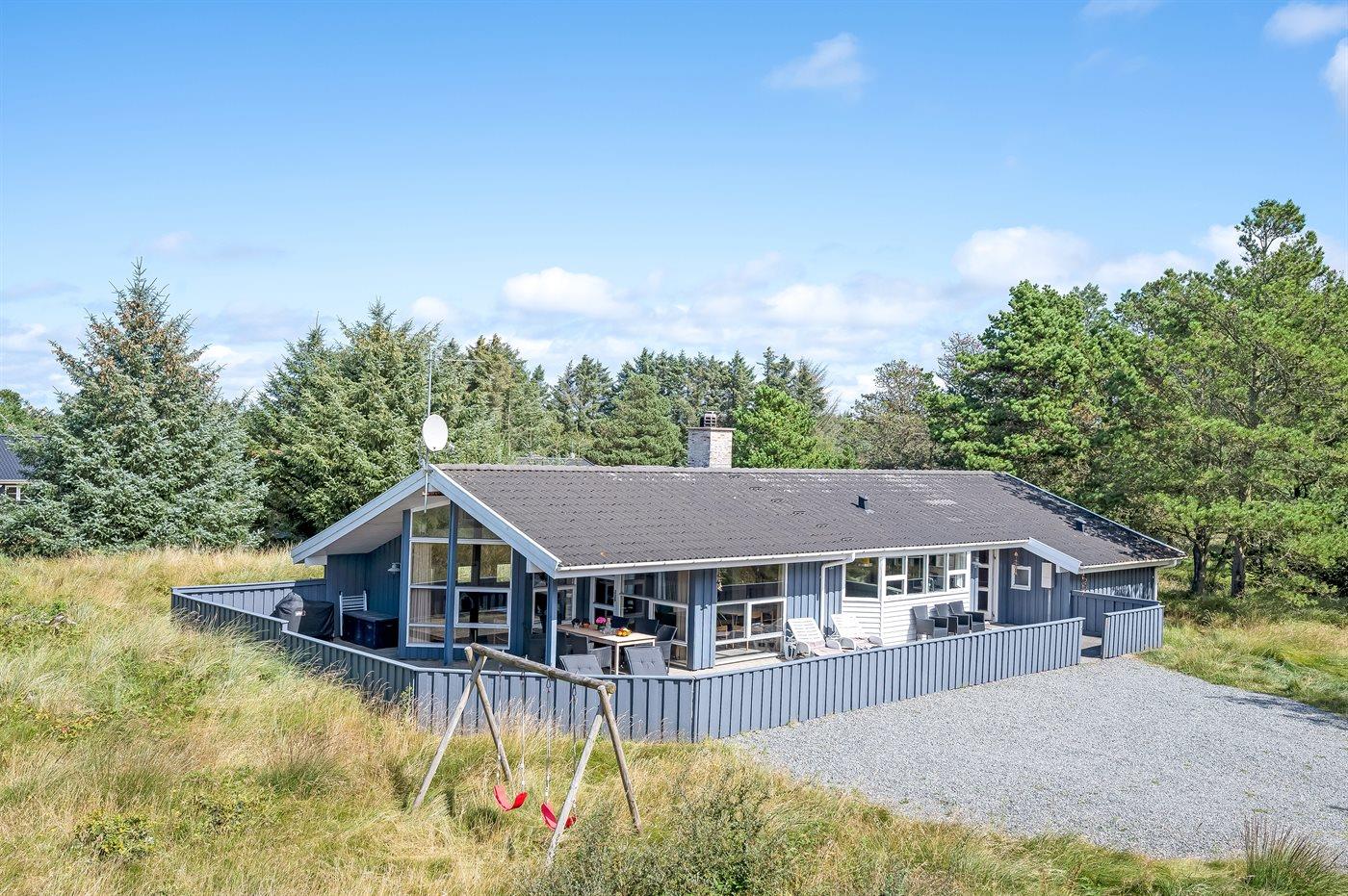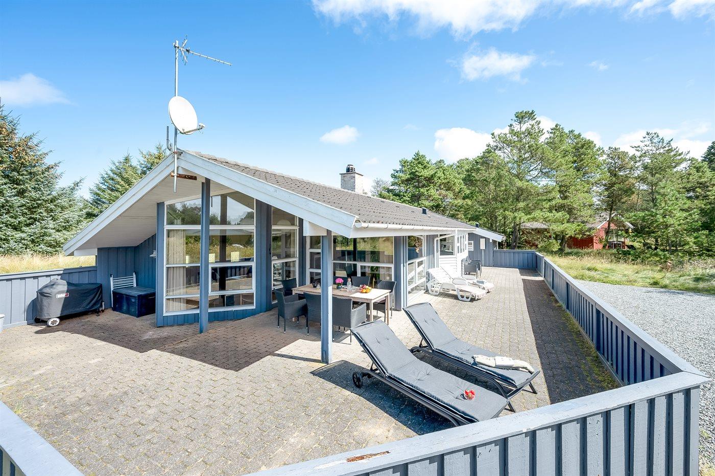Hyggeligt og velholdt sommerhus i Vejers Strand med spa, sauna og stor terrasse tæt på havet.