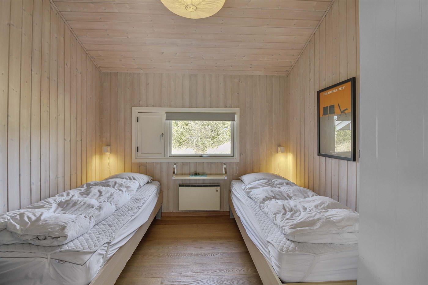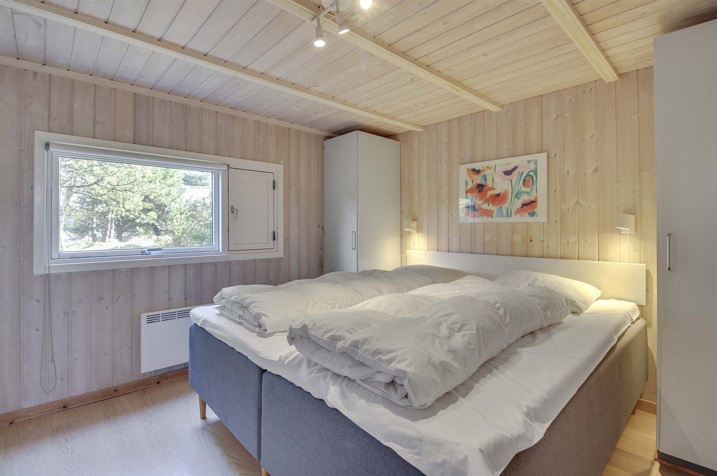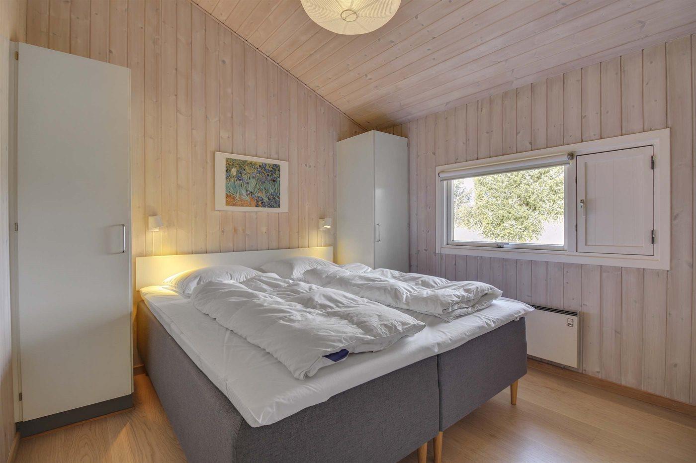Der er i alt 4 soveværelser. Sovepladserne fordeler sig på: 4 sovepladser i dobbeltsenge. 2 sovepladser i enkeltsenge. 2 sovepladser i køjeseng.
