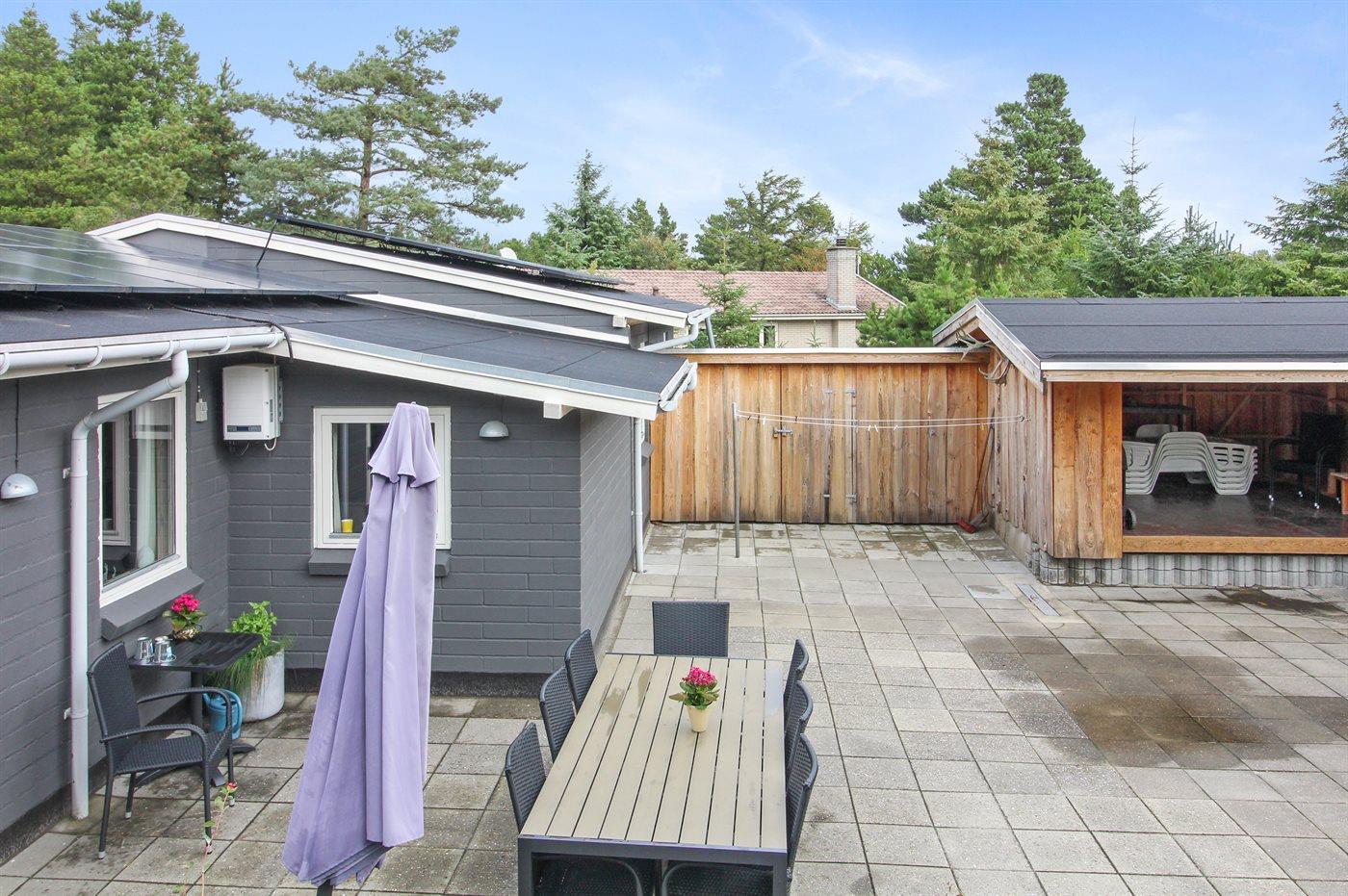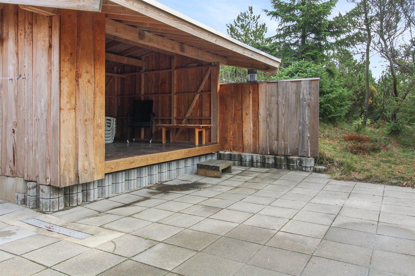 Ferieboligen er beliggende på en 1850 m² stor naturgrund. Der er 600 m til havet. Nærmeste forretning er beliggende i en afstand af 300 m. Til ferieboligen hører 45 m² terrasseareal. Der er redskabsrum. Gynge. Sandkasse. Udendørs bruser. Der er carport til rådighed. Parkering ved ferieboligen.