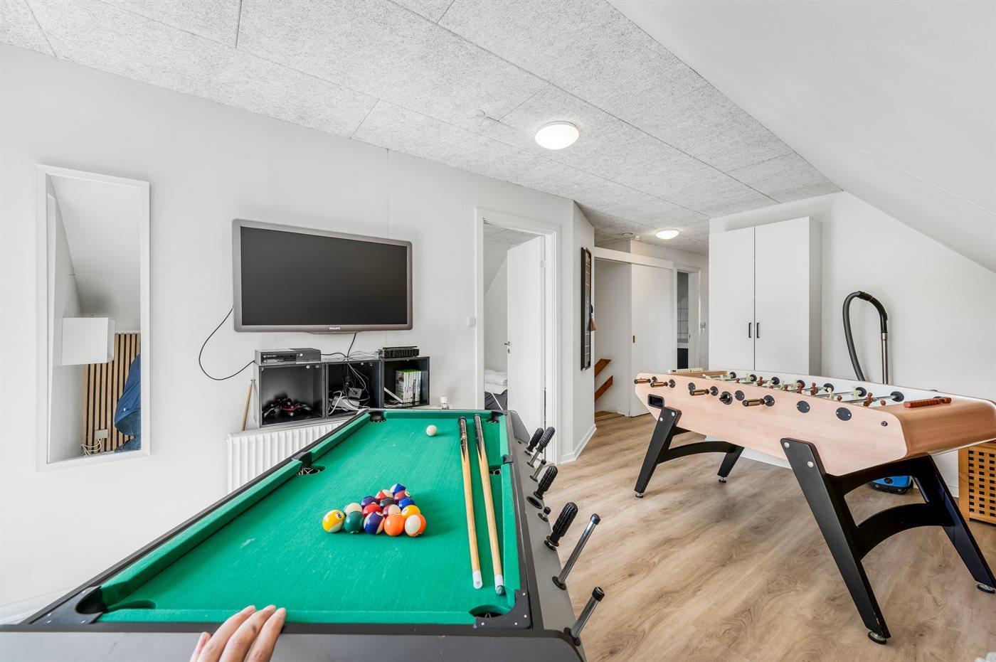 I aktivitetsrummet er der følgende udstyr: Bordfodbold og aktivitetsbord med poolbord og airhockey.