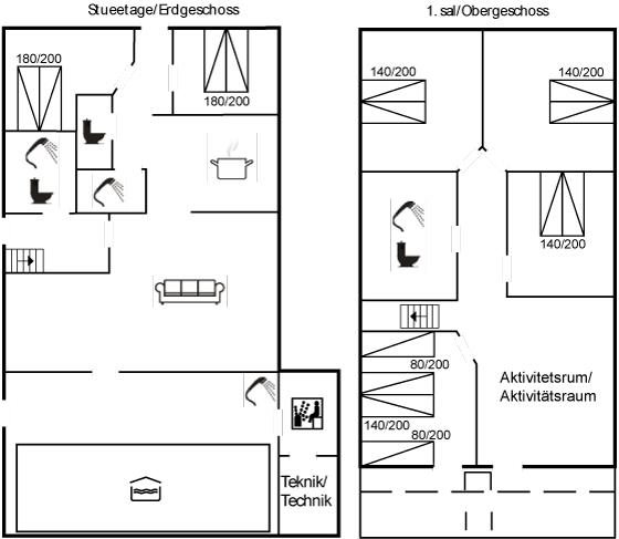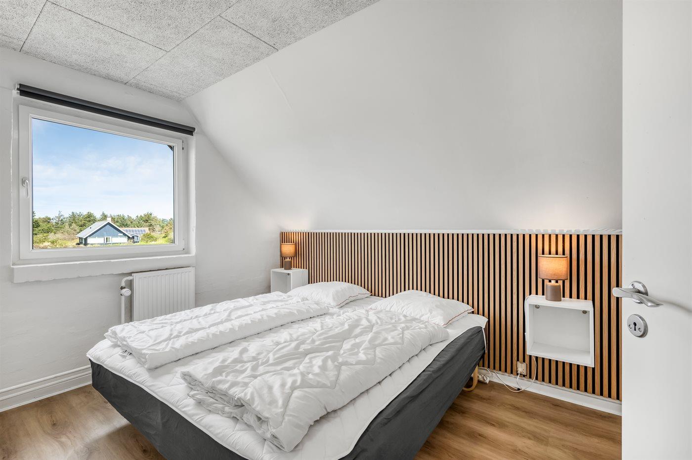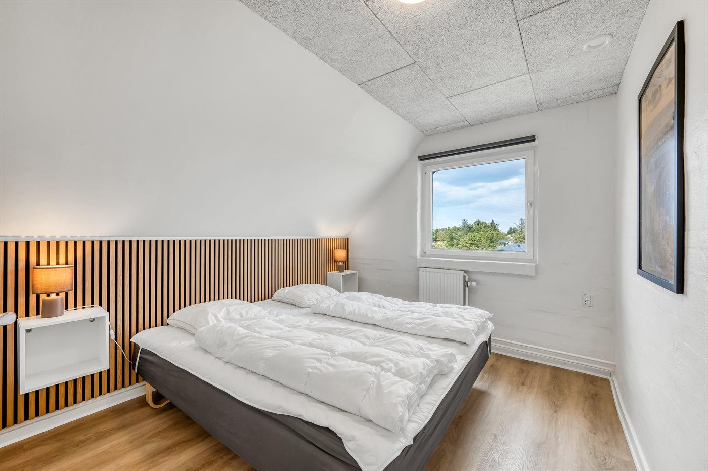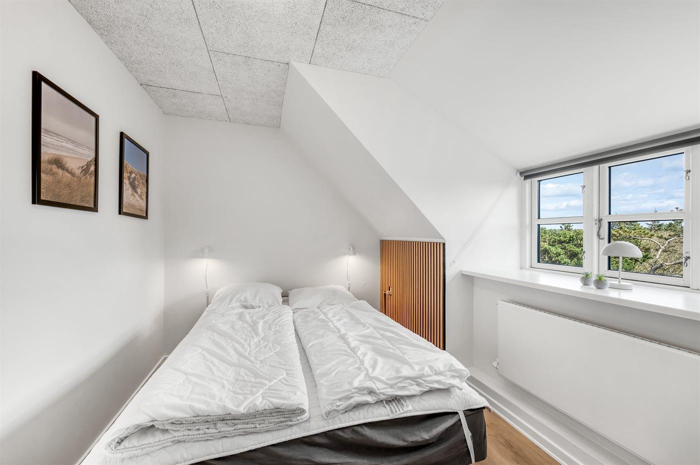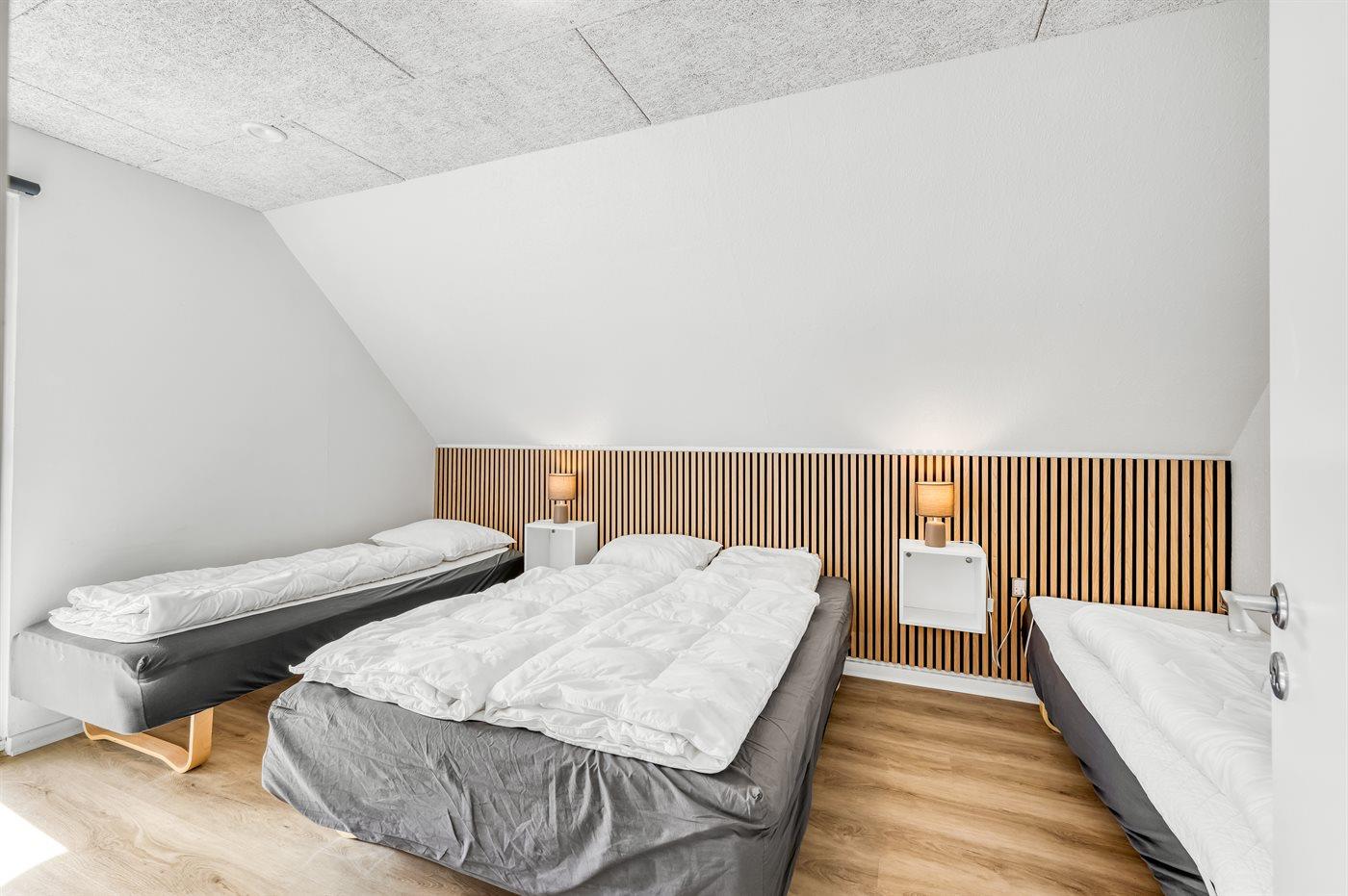 Der er i alt 6 soveværelser. Sovepladserne fordeler sig på: 12 sovepladser i dobbeltsenge. 2 sovepladser i enkeltsenge. Derudover er der 1 stk. barneseng.