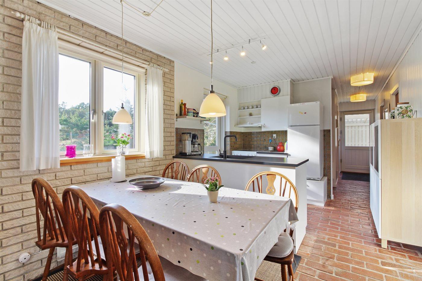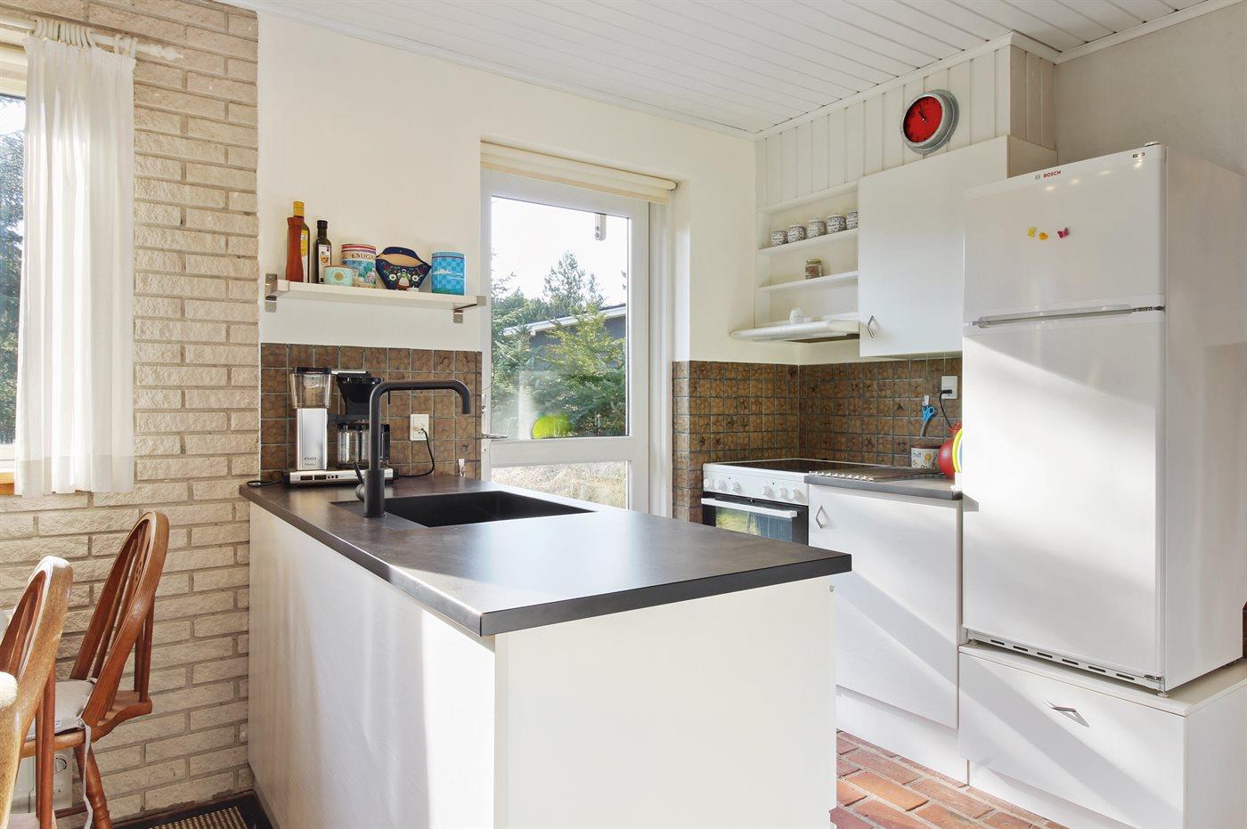 Køkkenet er udstyret med 1 køleskab. Der er 4 keramiske kogeplader, varmluftovn samt opvaskemaskine.