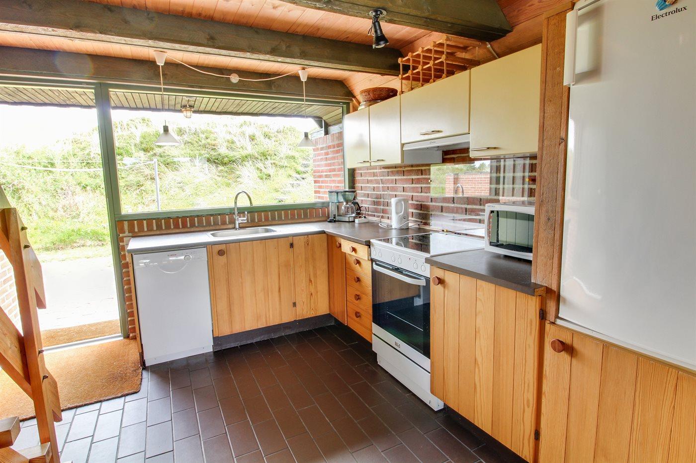 Køkkenet er udstyret med 1 køleskab. Der er 4 keramiske kogeplader, varmluftovn, mikrobølgeovn samt opvaskemaskine.