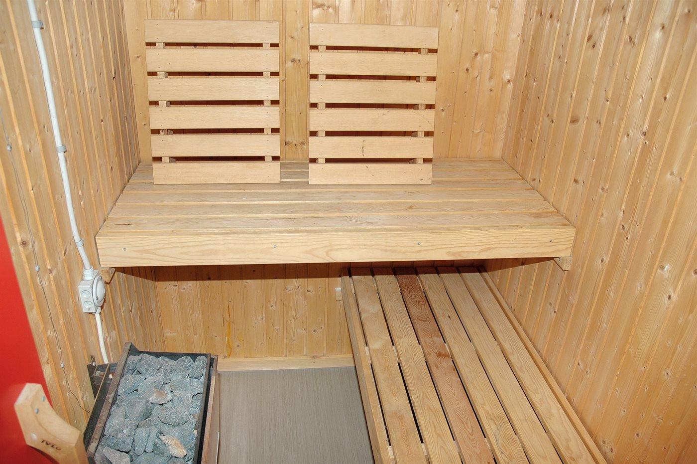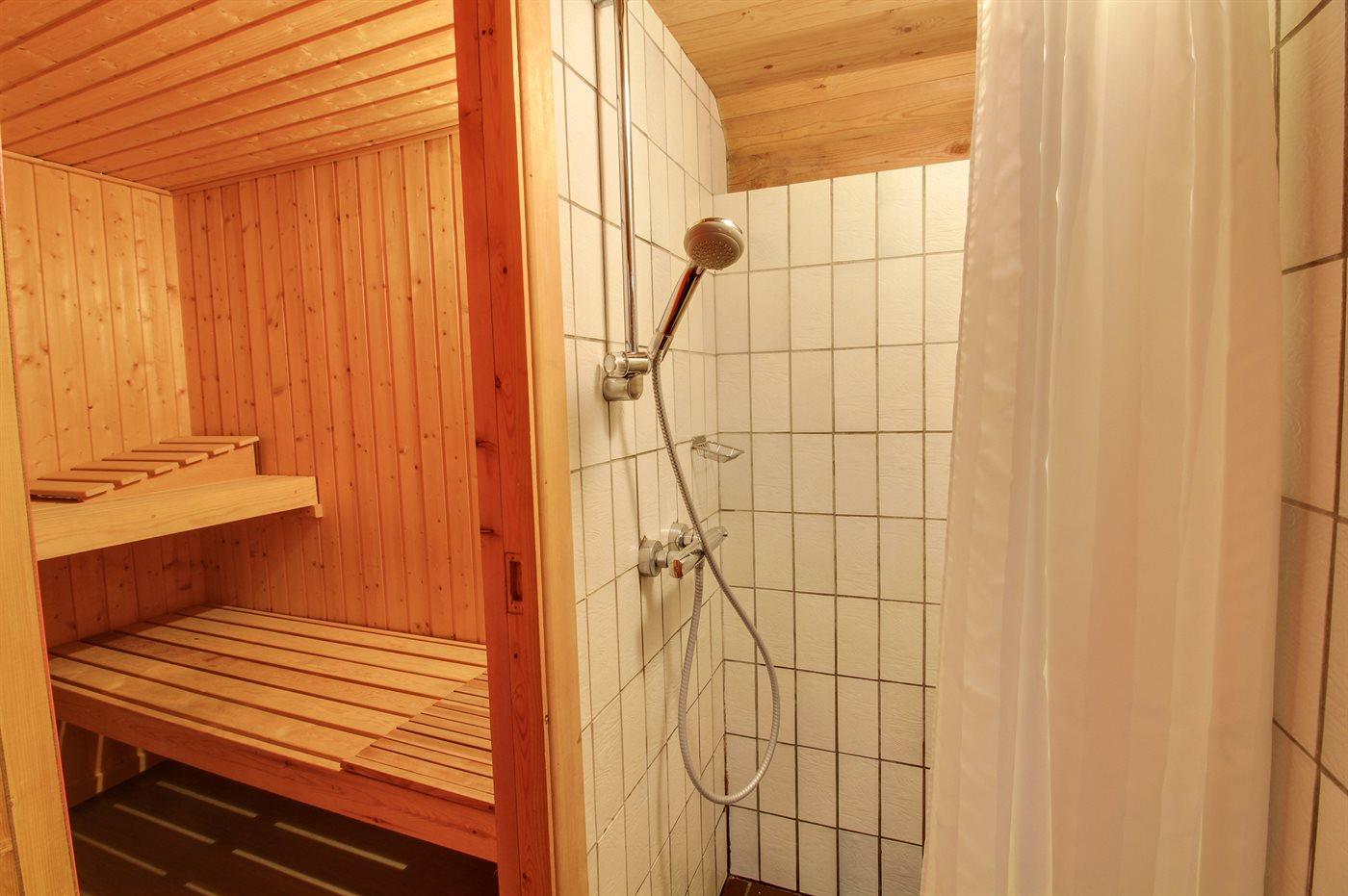 Der er 1 badeværelse med bruseniche og 1 toilet. I saunaen er der mulighed for afslapning.
