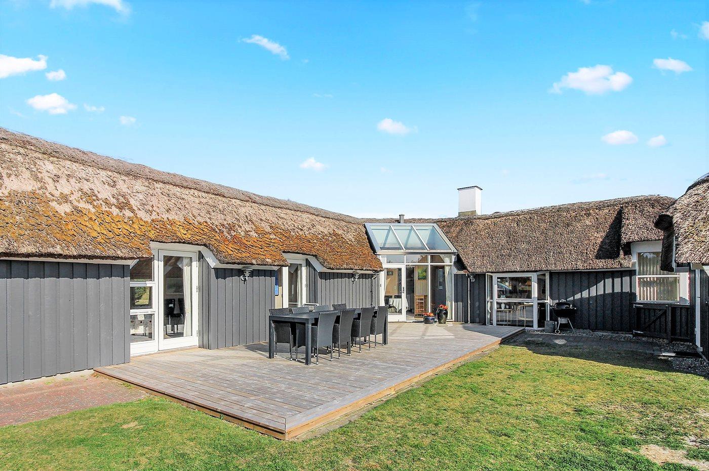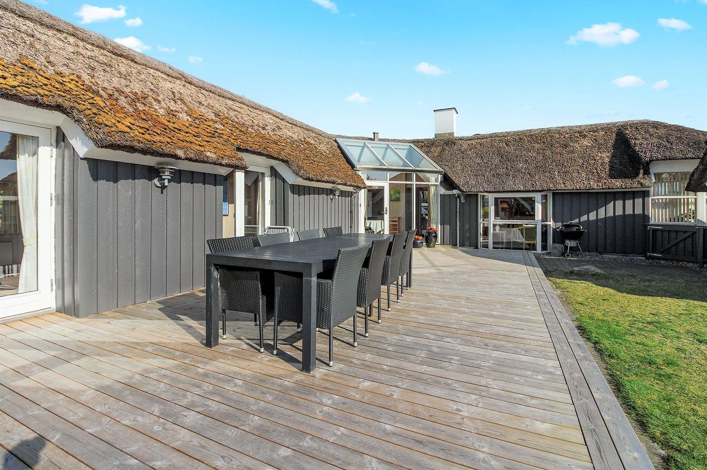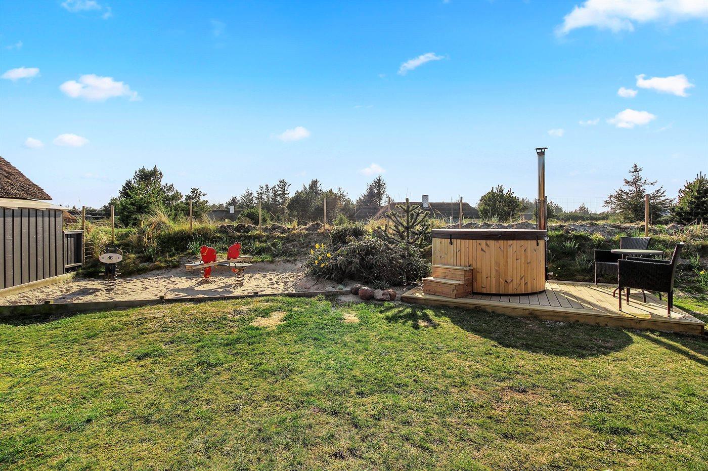 Udenfor finder du en stor og solrig terrasse, perfekt til morgenkaffe, grillmiddage og sene sommeraftener under åben himmel. Grunden er rummelig og børnevenlig med et legeområde til de mindste, så både store og små kan nyde ferien i deres eget tempo.