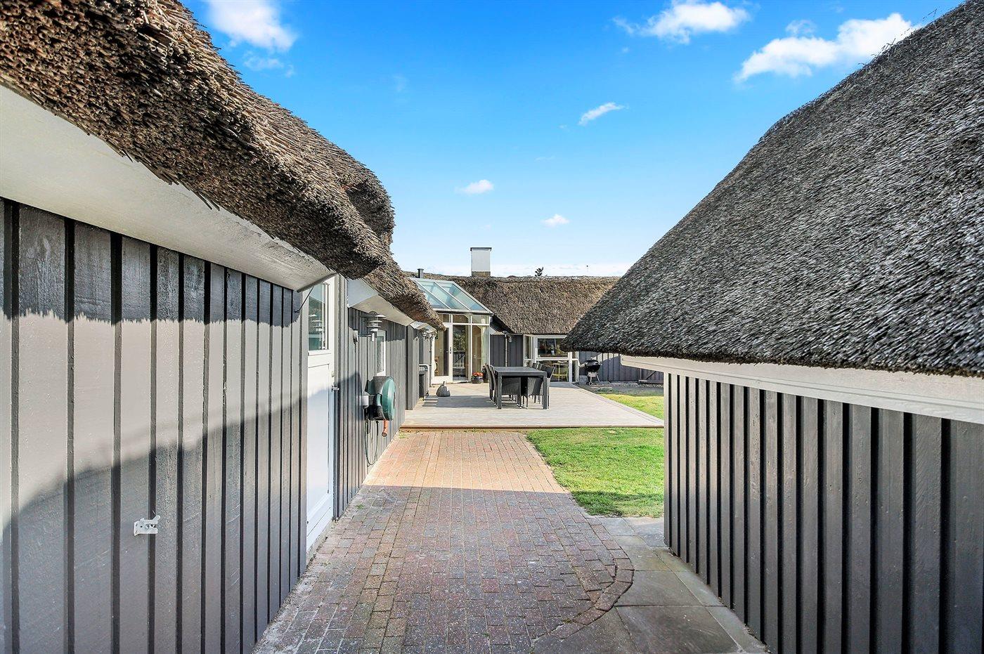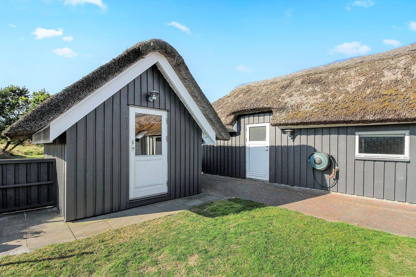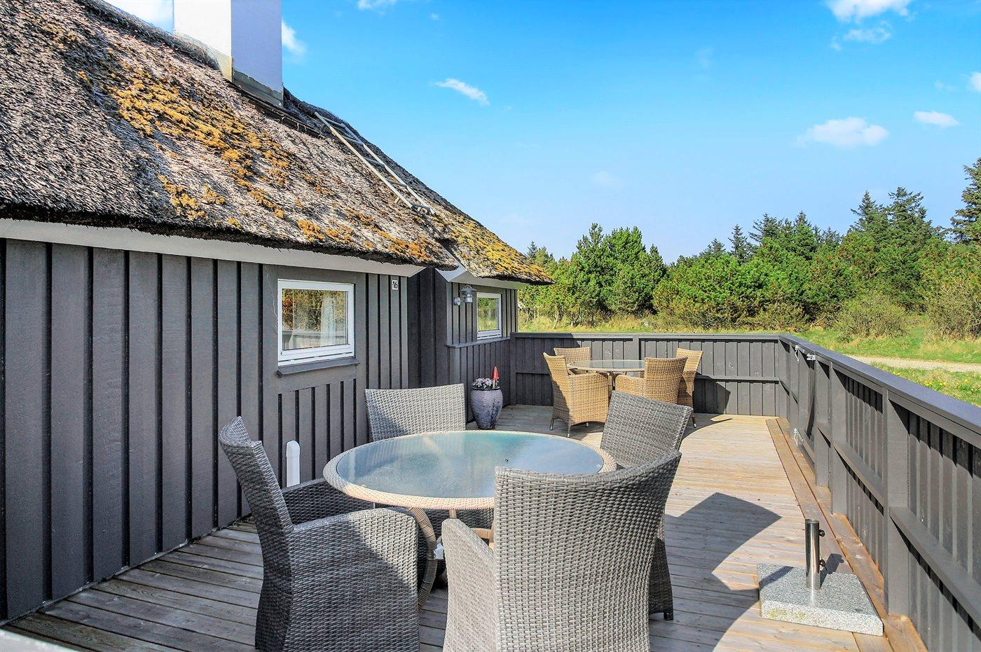 Udenfor finder du en stor og solrig terrasse, perfekt til morgenkaffe, grillmiddage og sene sommeraftener under åben himmel. Grunden er rummelig og børnevenlig med et legeområde til de mindste, så både store og små kan nyde ferien i deres eget tempo.