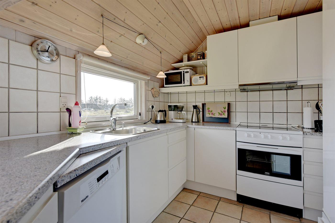 Køkkenet er udstyret med 1 køleskab. Der er 4 keramiske kogeplader, varmluftovn, mikrobølgeovn samt opvaskemaskine Der er gulvvarme i køkkenet.