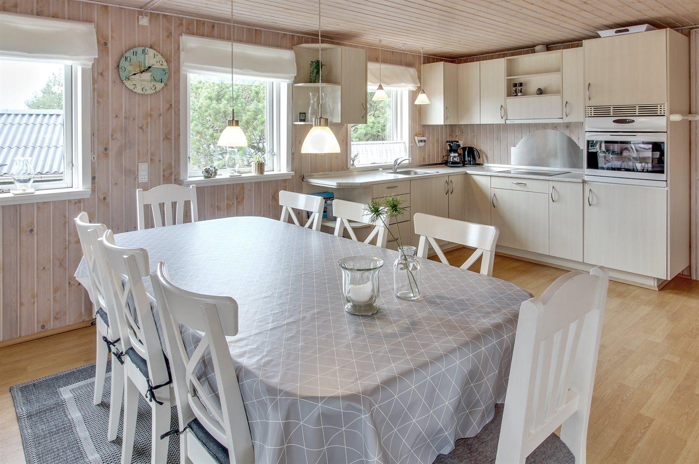 Køkkenet er udstyret med 1 køleskab. Der er 4 keramiske kogeplader, varmluftovn, mikrobølgeovn samt opvaskemaskine.