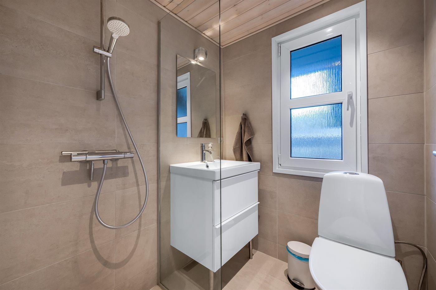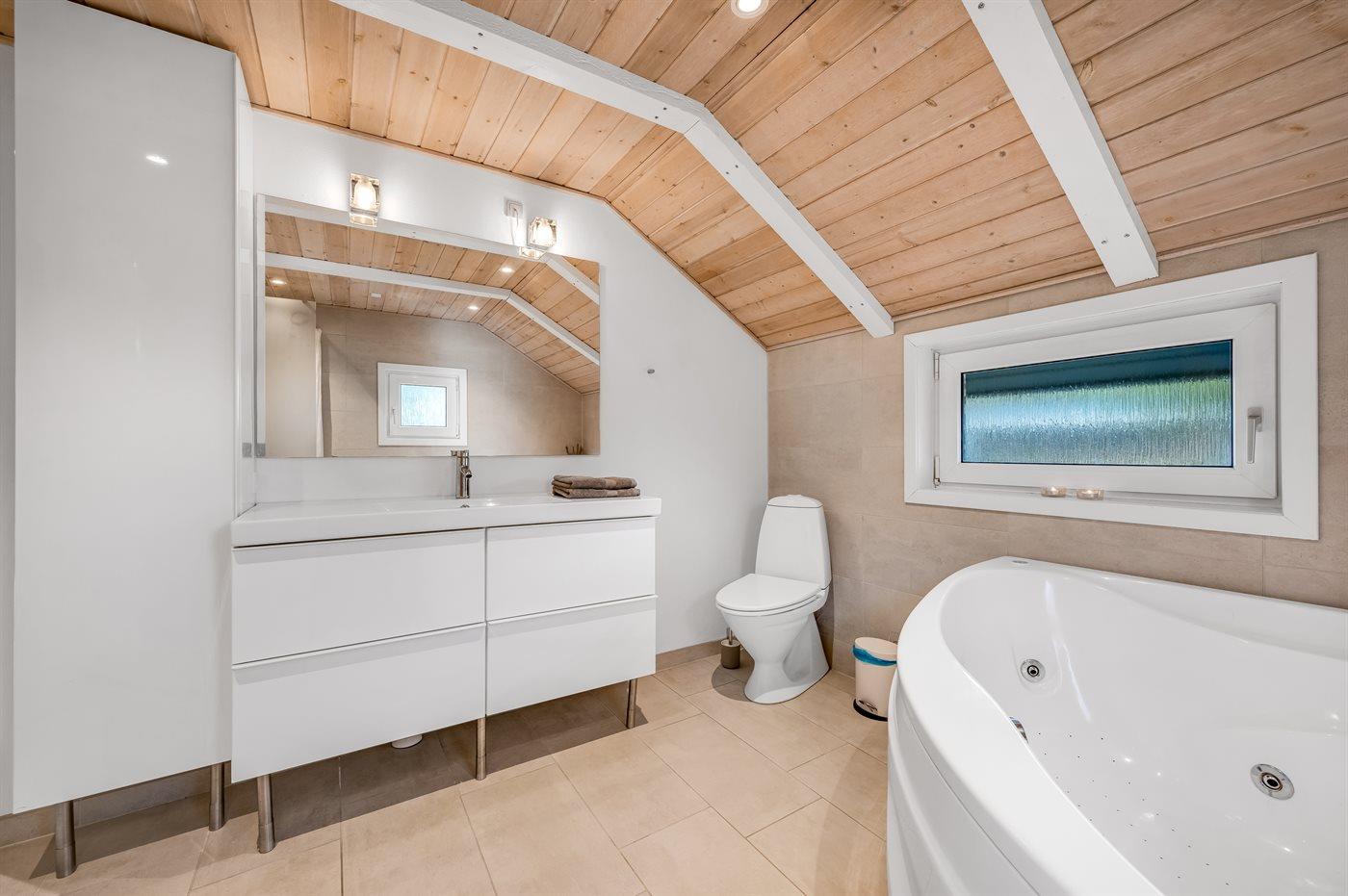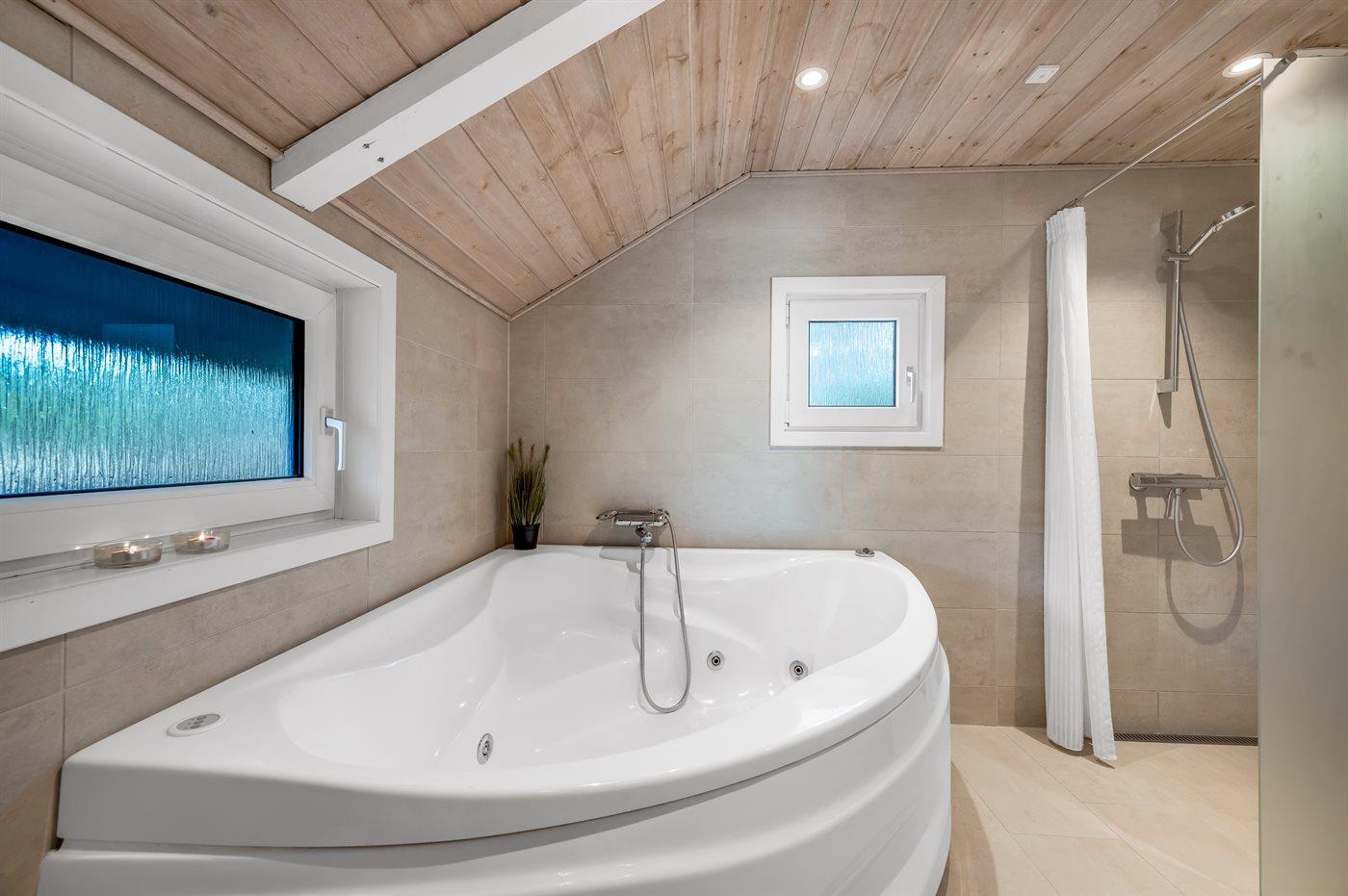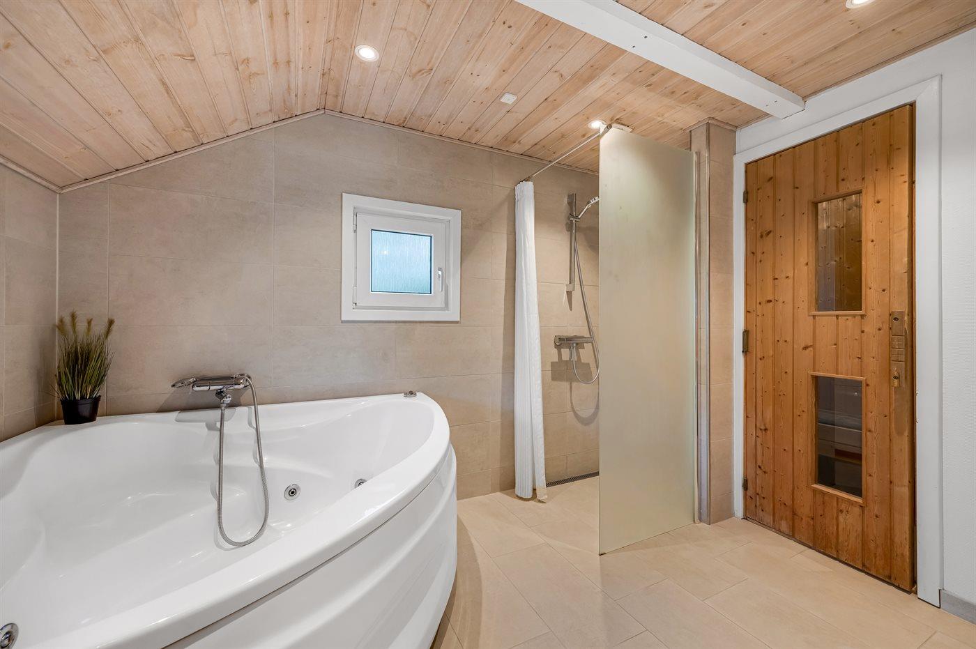 Der er 2 badeværelser med bruseniche og 2 toiletter. Der er gulvvarme på 2 badeværelser. I saunaen er der mulighed for afslapning.